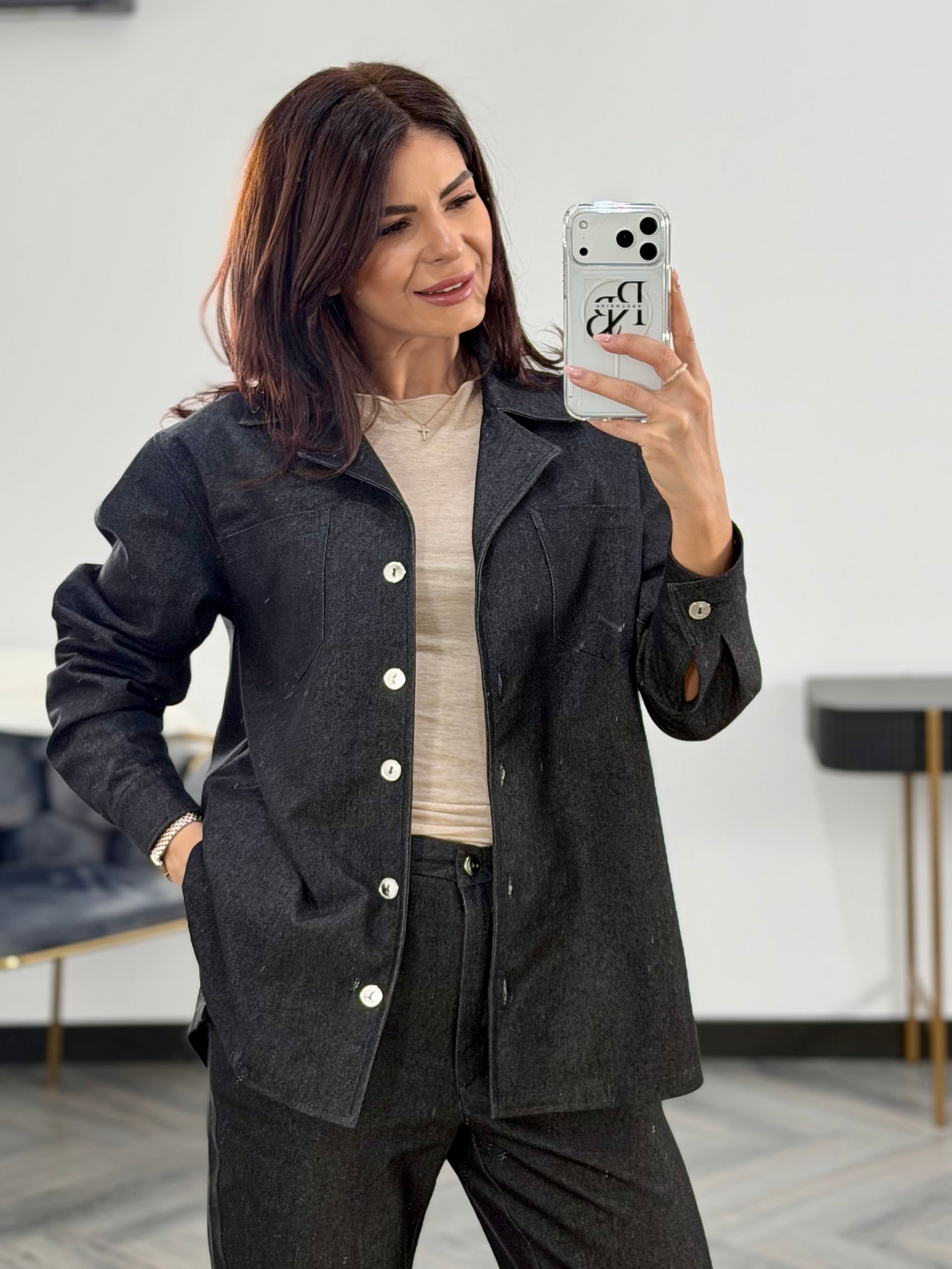 Cămașa cu nasturi și pantalonul cu croi drept formează un outfit complet, potrivit pentru purtare zilnică – de la ținute casual cu sneakers, până la apariții urbane, curate, cu accesorii simple.