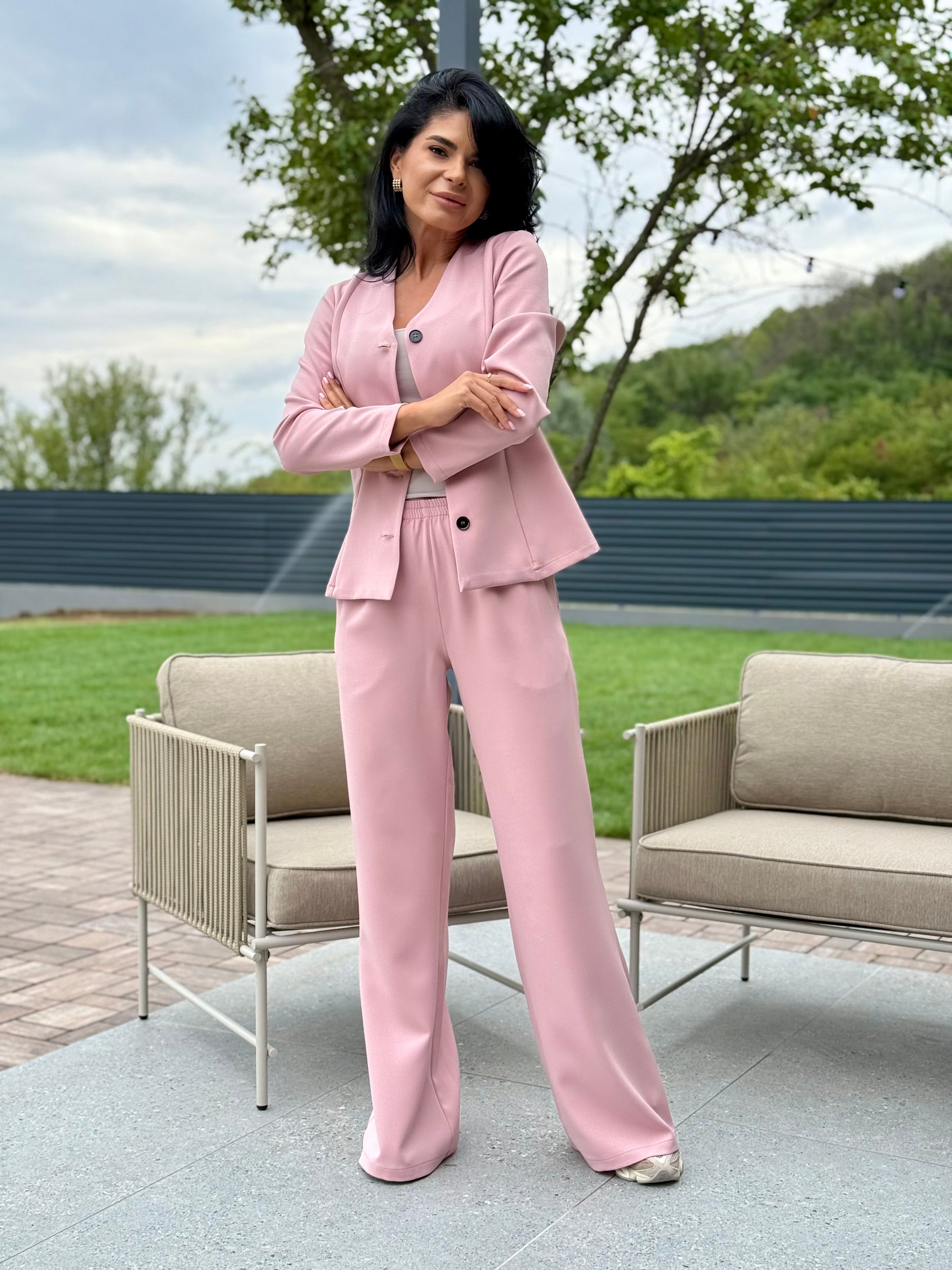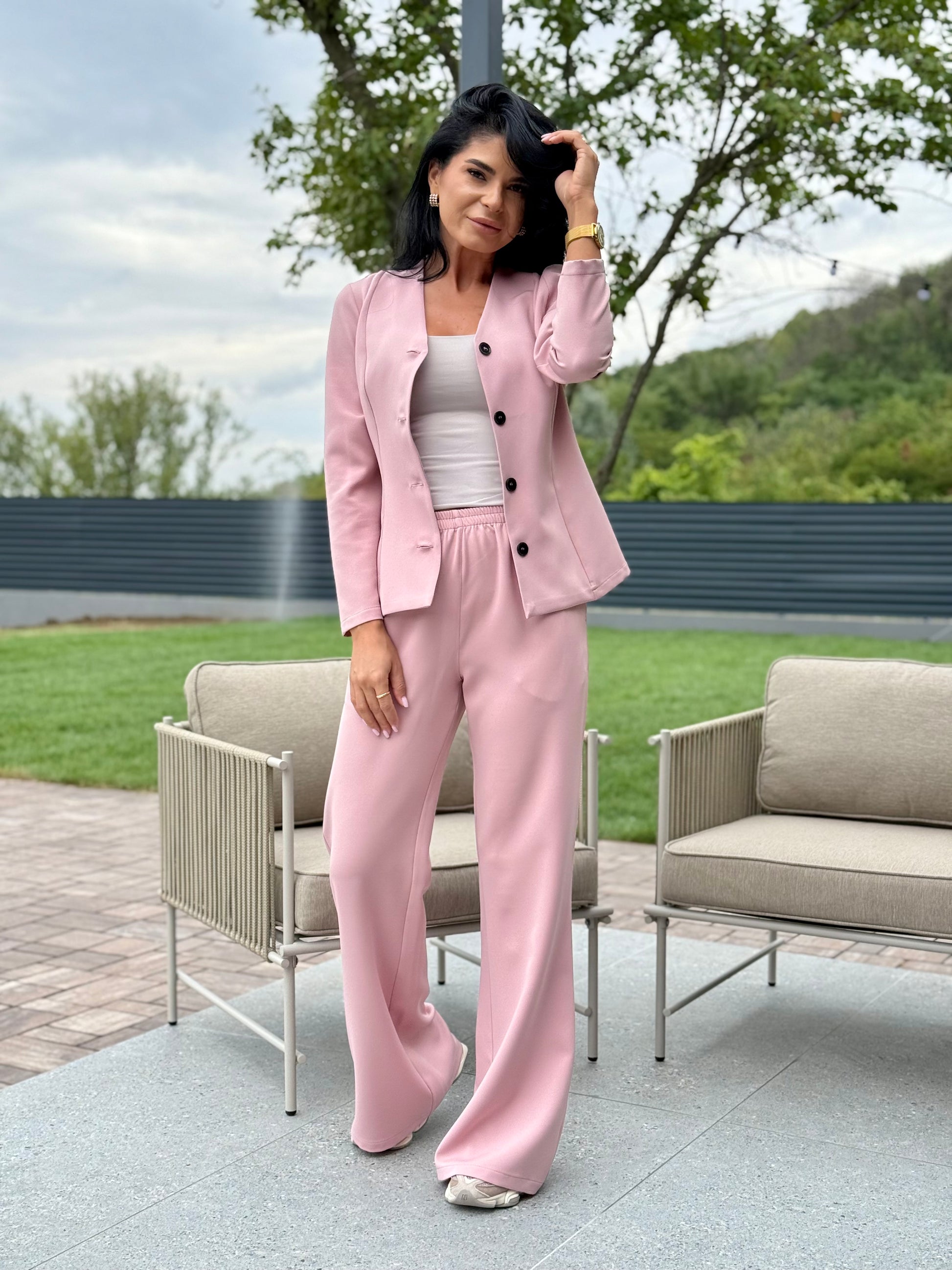 Costum realizat din tesatura barbie, material de calitate, placut la atingere, este alegerea ideala pentru tinute office sau aparitii smart-casual.