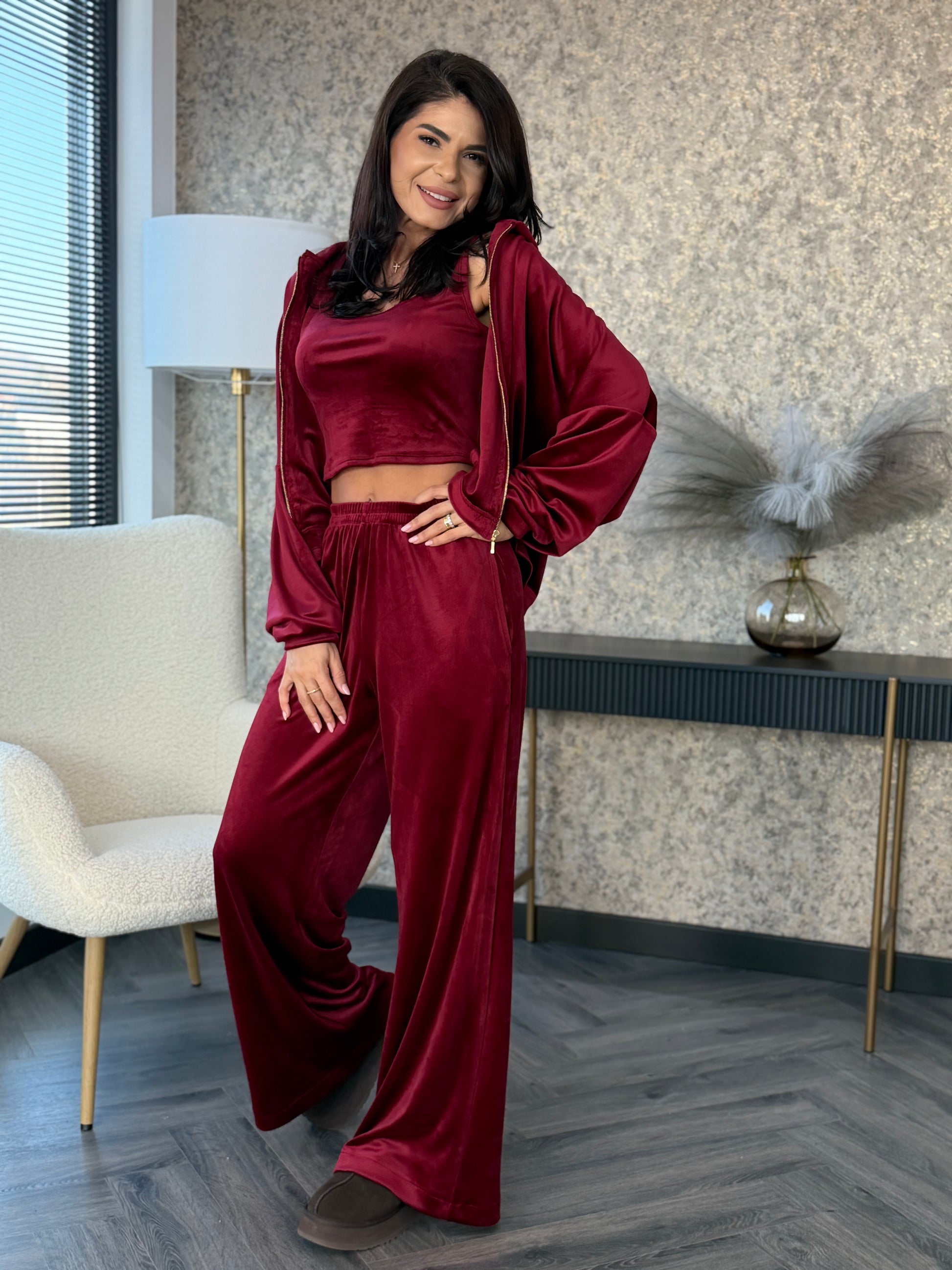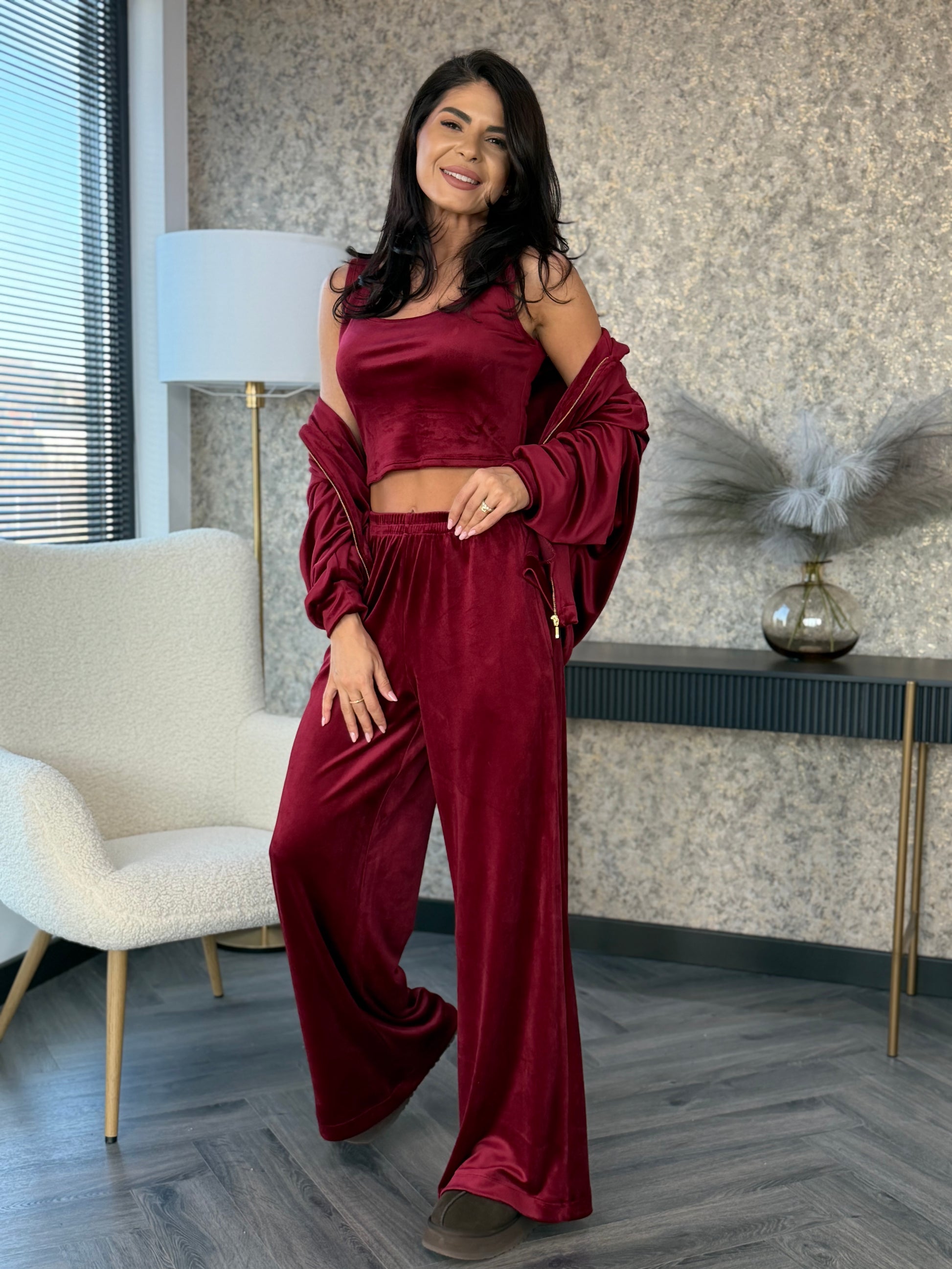 Trening realizat din catifea soft, cu textură fină, moale și plăcută la atingere, care oferă confort sporit și un aspect elegant. Croiala este gândită pentru a îmbina stilul casual cu o notă feminină, fiind potrivit atât pentru purtare zilnică, cât și pentru ținute relaxate, dar bine definite.