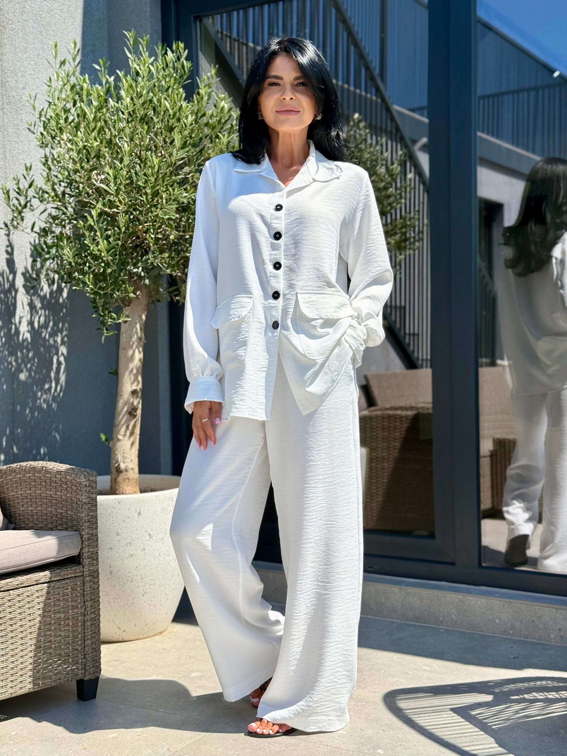 Costumul din imagine are un croi lejer și modern, ideal pentru confort în zilele călduroase. Cămașa are o linie dreaptă, ușor oversized, cu buzunare aplicate în față și nasturi contrastanți care adaugă un accent stylish. Gulerul clasic și mânecile lungi completează lookul casual-elegant. Pantalonii sunt largi, cu o croială amplă ce oferă libertate de mișcare și un aer relaxat, echilibrând perfect proporțiile siluetei. Outfitul este versatil și ușor de integrat în ținute de zi, city break sau evenimente relaxate.