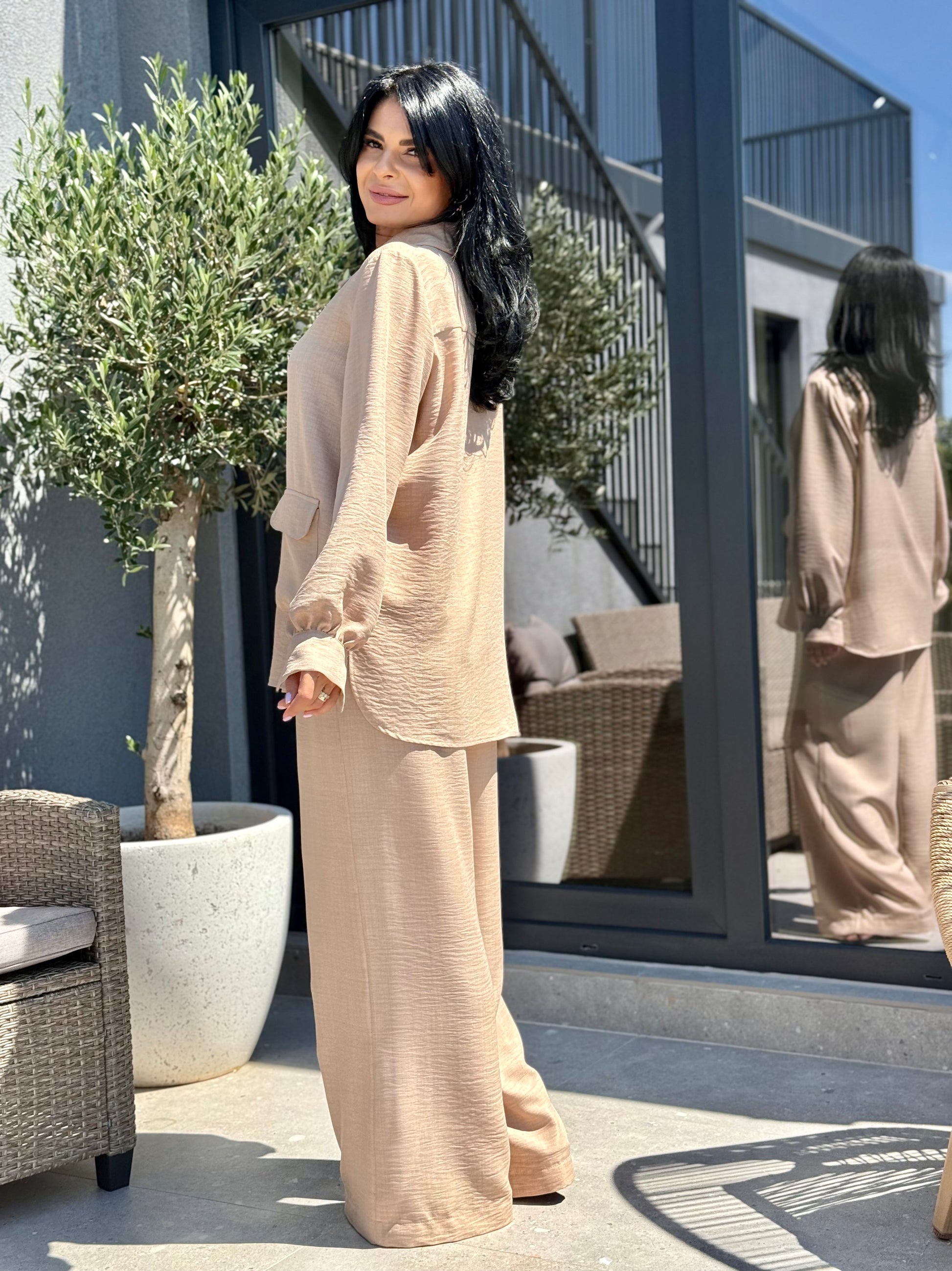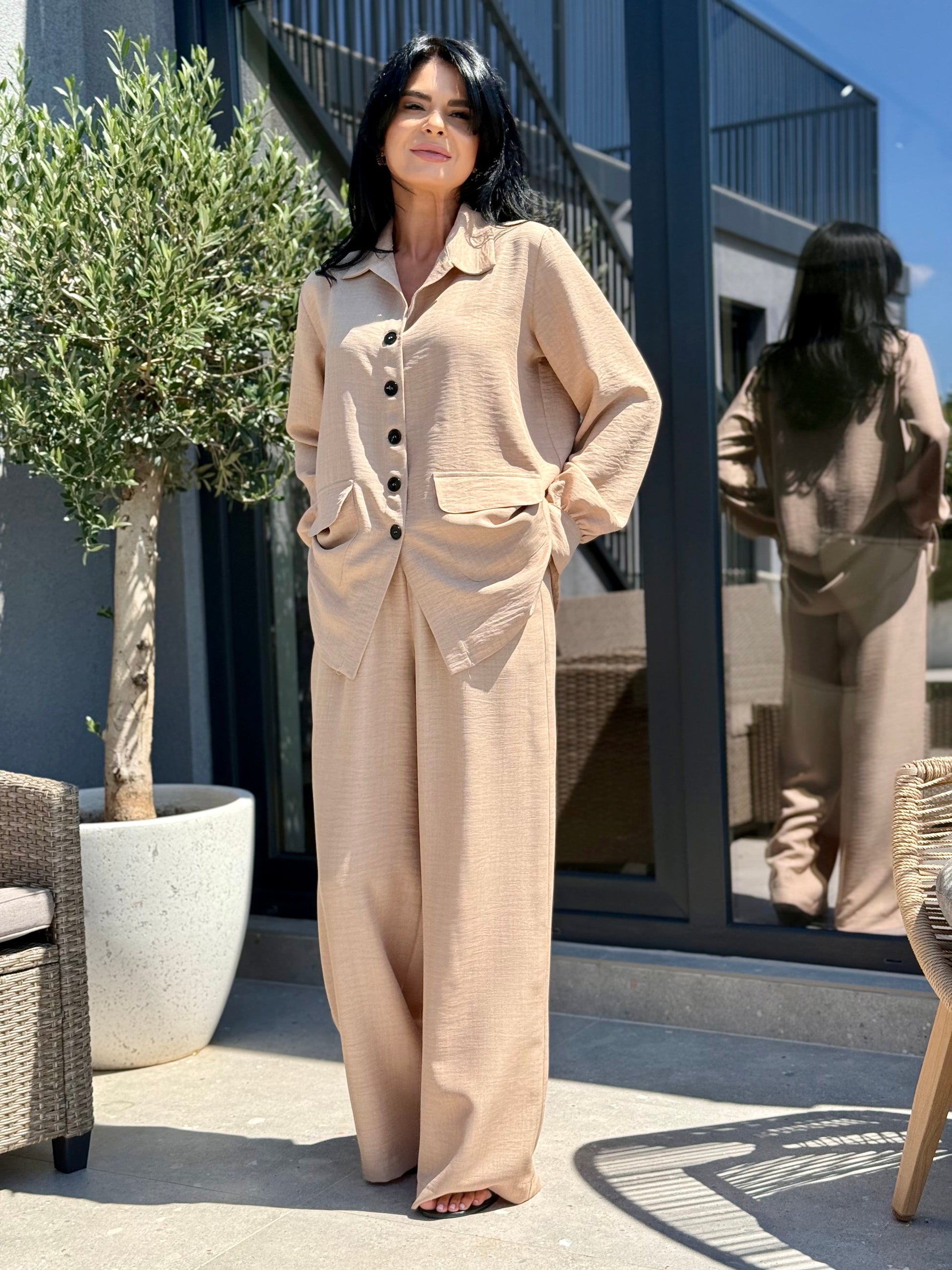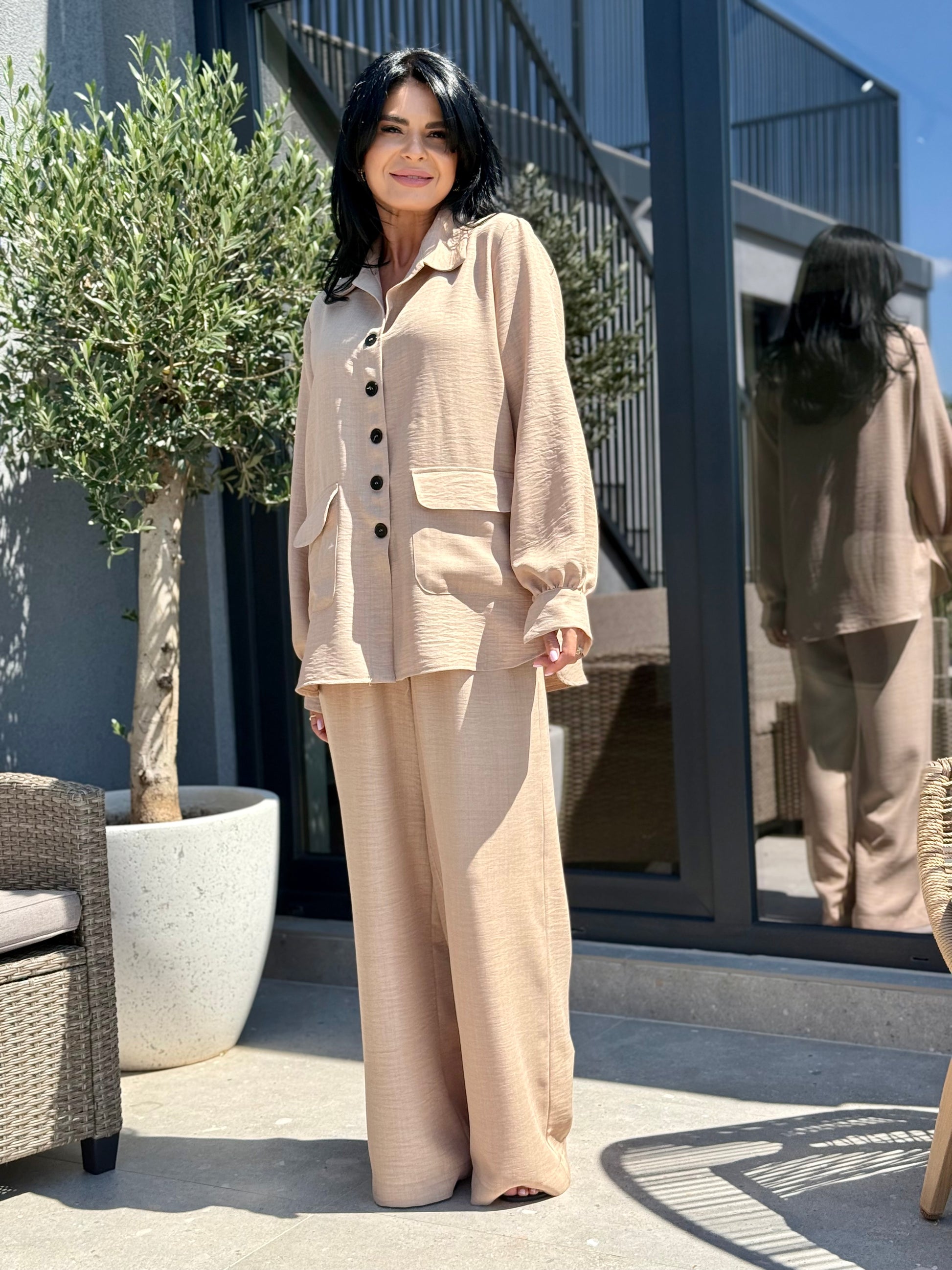 Costumul din imagine are un croi lejer și modern, ideal pentru confort în zilele călduroase. Cămașa are o linie dreaptă, ușor oversized, cu buzunare aplicate în față și nasturi contrastanți care adaugă un accent stylish. Gulerul clasic și mânecile lungi completează lookul casual-elegant. Pantalonii sunt largi, cu o croială amplă ce oferă libertate de mișcare și un aer relaxat, echilibrând perfect proporțiile siluetei. Outfitul este versatil și ușor de integrat în ținute de zi, city break sau evenimente relaxate.