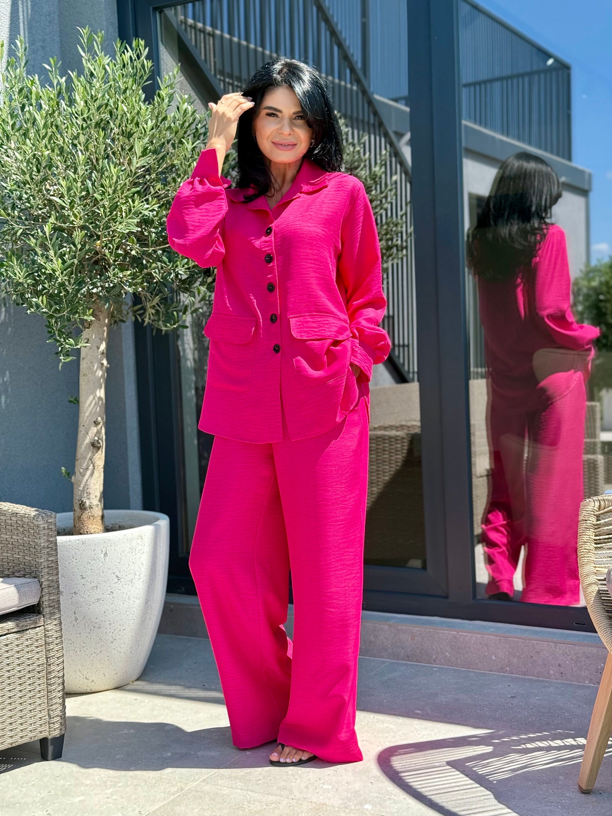 Costumul din imagine are un croi lejer și modern, ideal pentru confort în zilele călduroase. Cămașa are o linie dreaptă, ușor oversized, cu buzunare aplicate în față și nasturi contrastanți care adaugă un accent stylish. Gulerul clasic și mânecile lungi completează lookul casual-elegant. Pantalonii sunt largi, cu o croială amplă ce oferă libertate de mișcare și un aer relaxat, echilibrând perfect proporțiile siluetei. Outfitul este versatil și ușor de integrat în ținute de zi, city break sau evenimente relaxate.