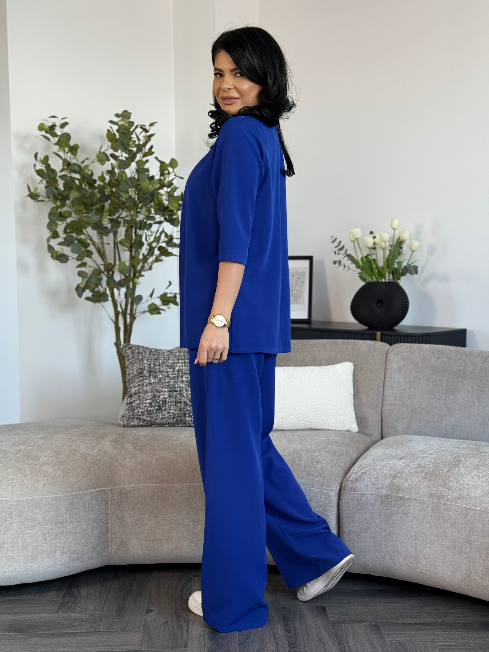 Acest costum din doua piese imbina eleganta si confortul, fiind alegerea ideala pentru femeile care vor sa se simta bine in zilele aglomerate. Sacoul croit slim, maneci trei sferturi si pantalonii lejeri creeaza o silueta rafinata si moderna. Il poti purta la birou, brunch cu fetele, calatorii.
