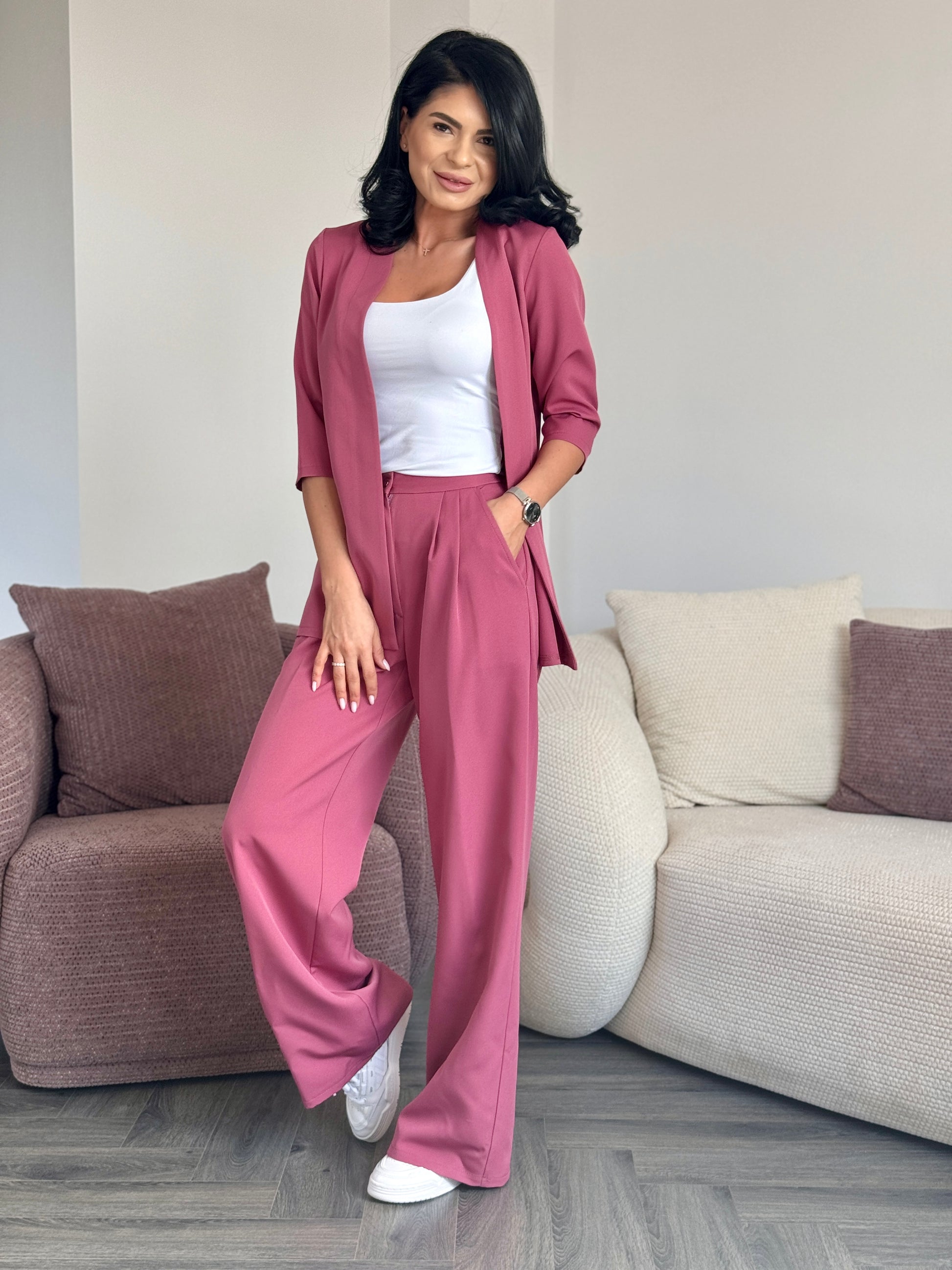 Acest costum din doua piese imbina eleganta si confortul, fiind alegerea ideala pentru femeile care vor sa se simta bine in zilele aglomerate. Sacoul croit slim, maneci trei sferturi si pantalonii lejeri creeaza o silueta rafinata si moderna. Il poti purta la birou, brunch cu fetele, calatorii.