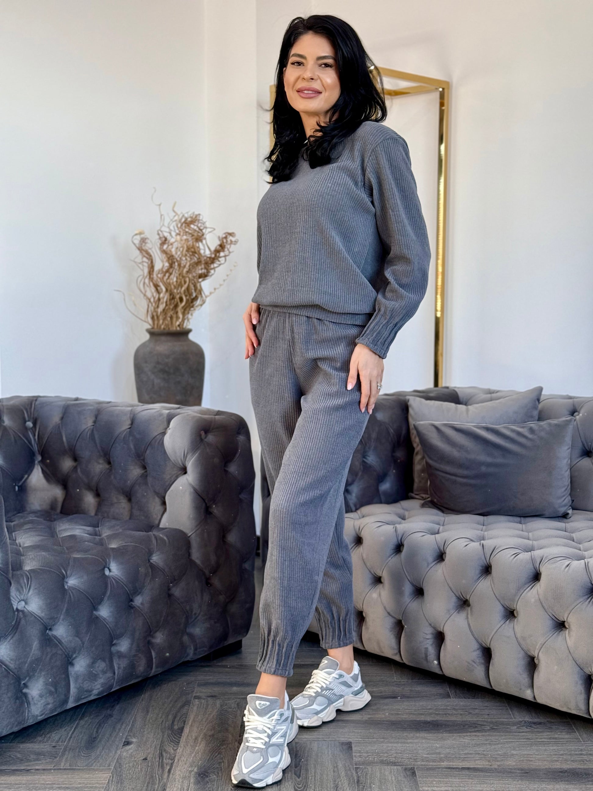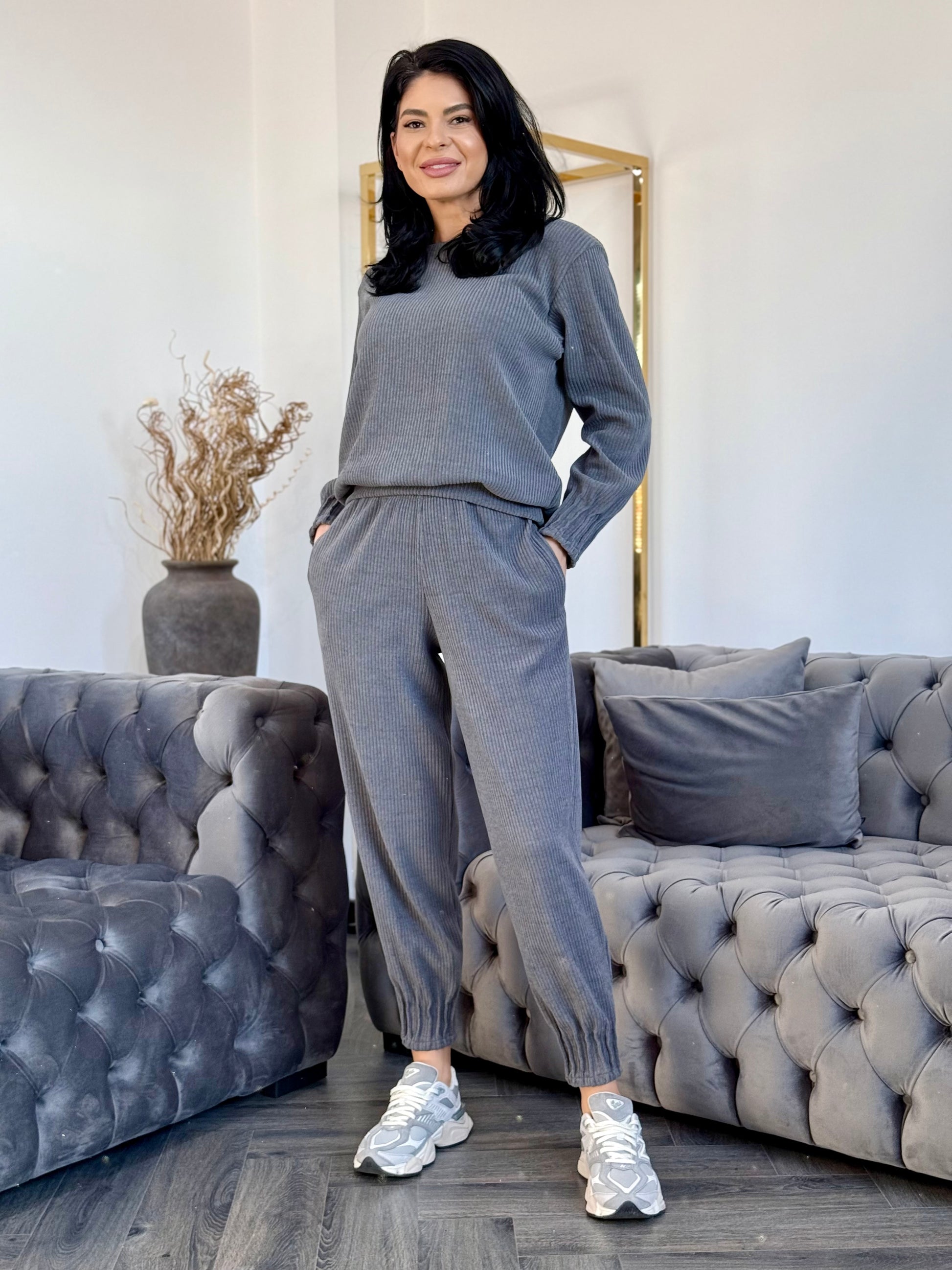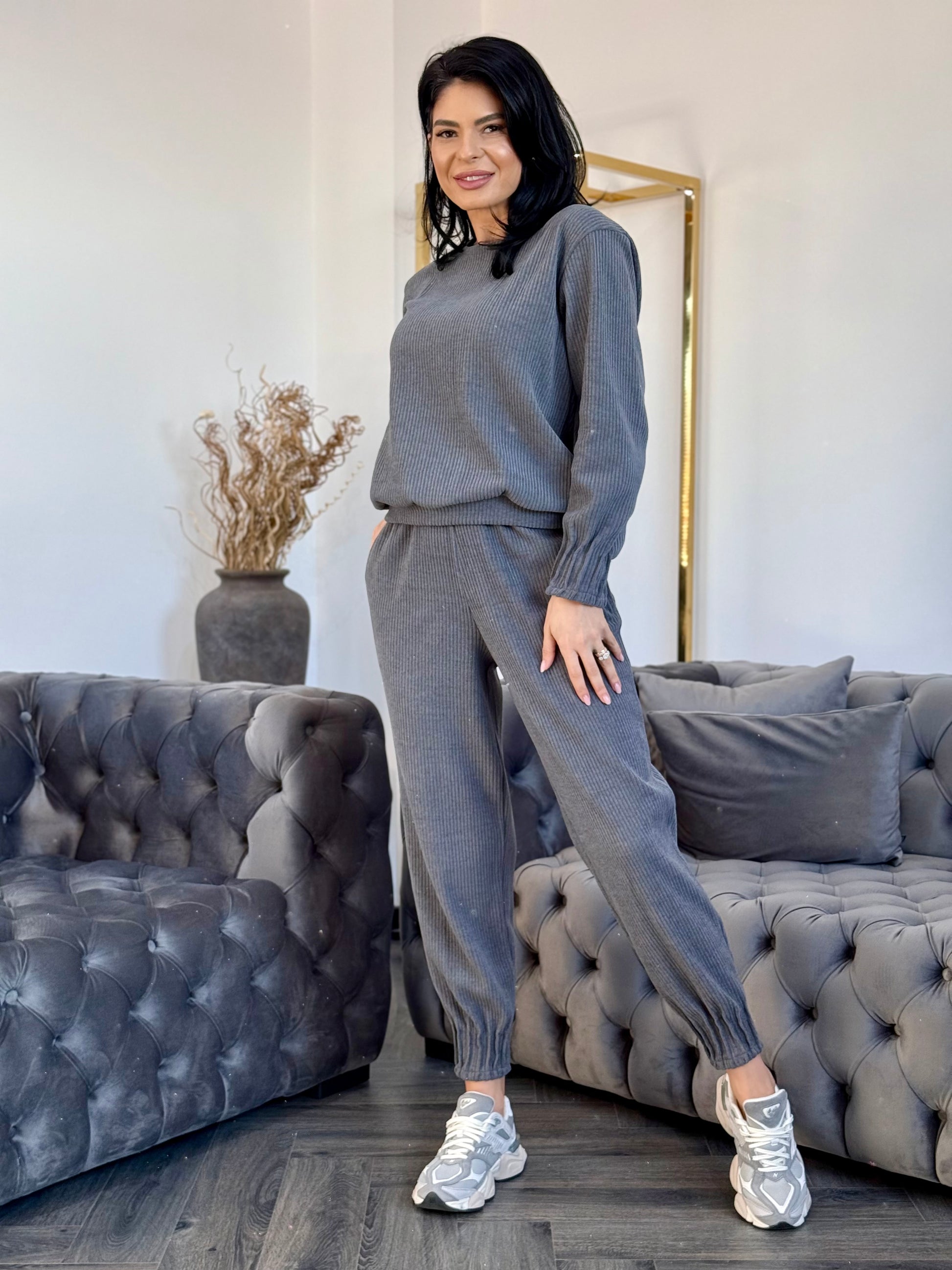 Acest costum din catifea emana eleganta si rafinament intr-un design casual. Realizat din catifea reiat, material moale si placut la atingere, modelul ofera o senzatie de confort si flexibilitate pe tot parcursul zilei.
