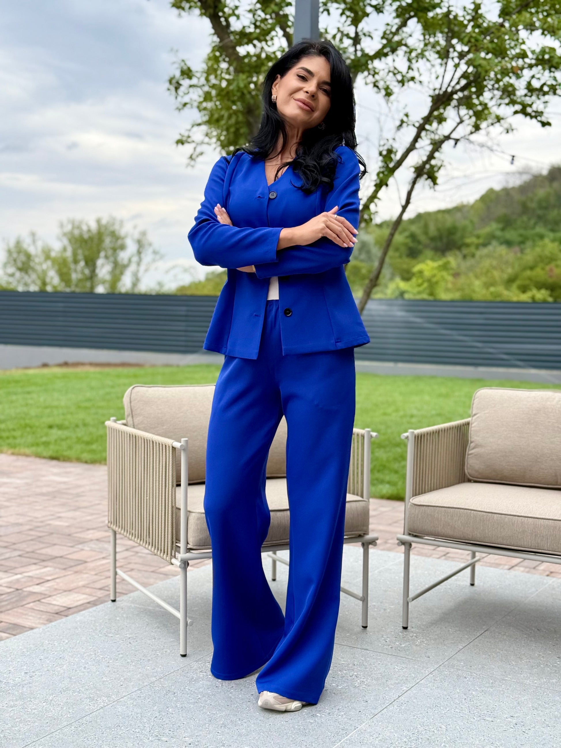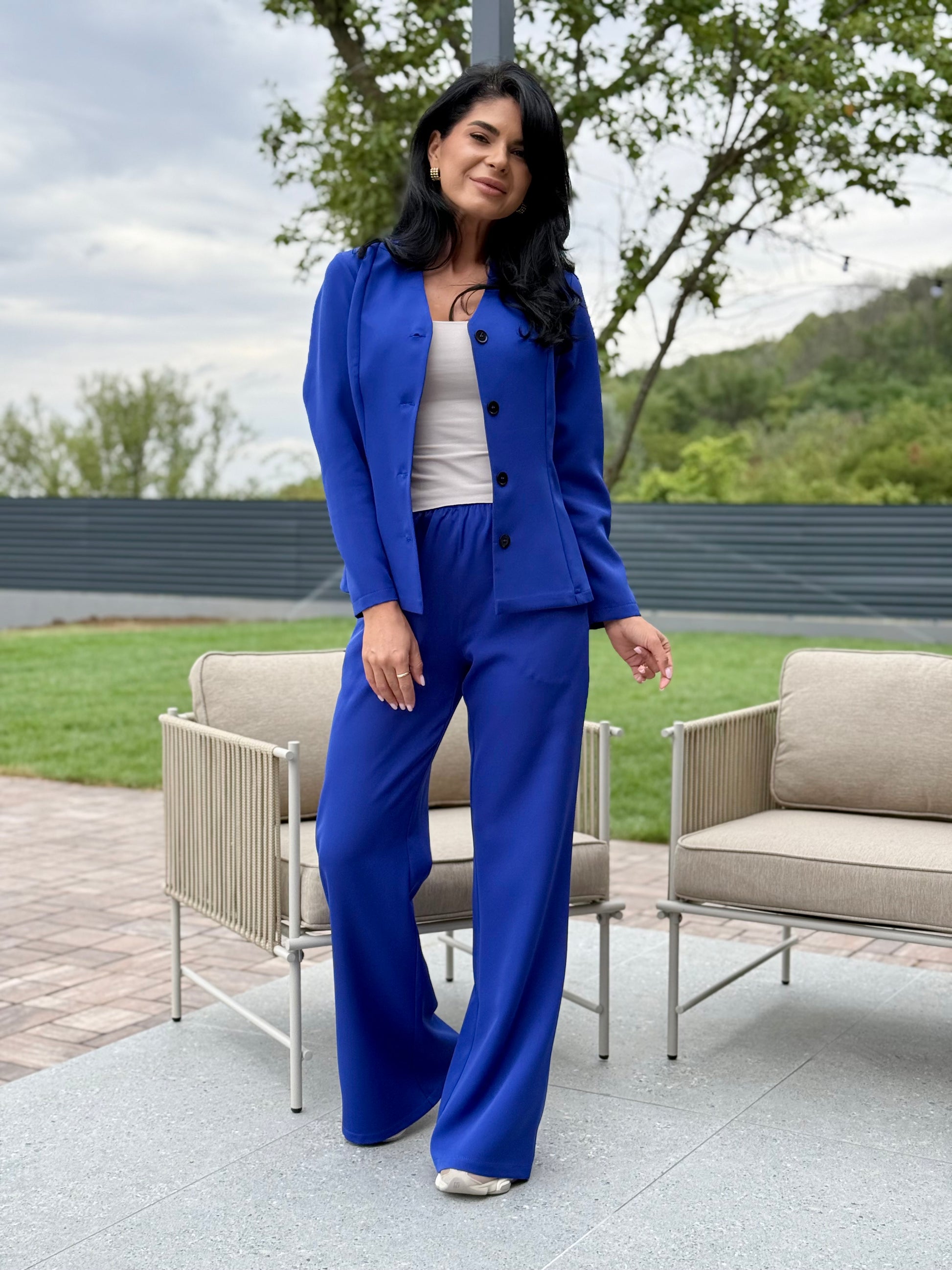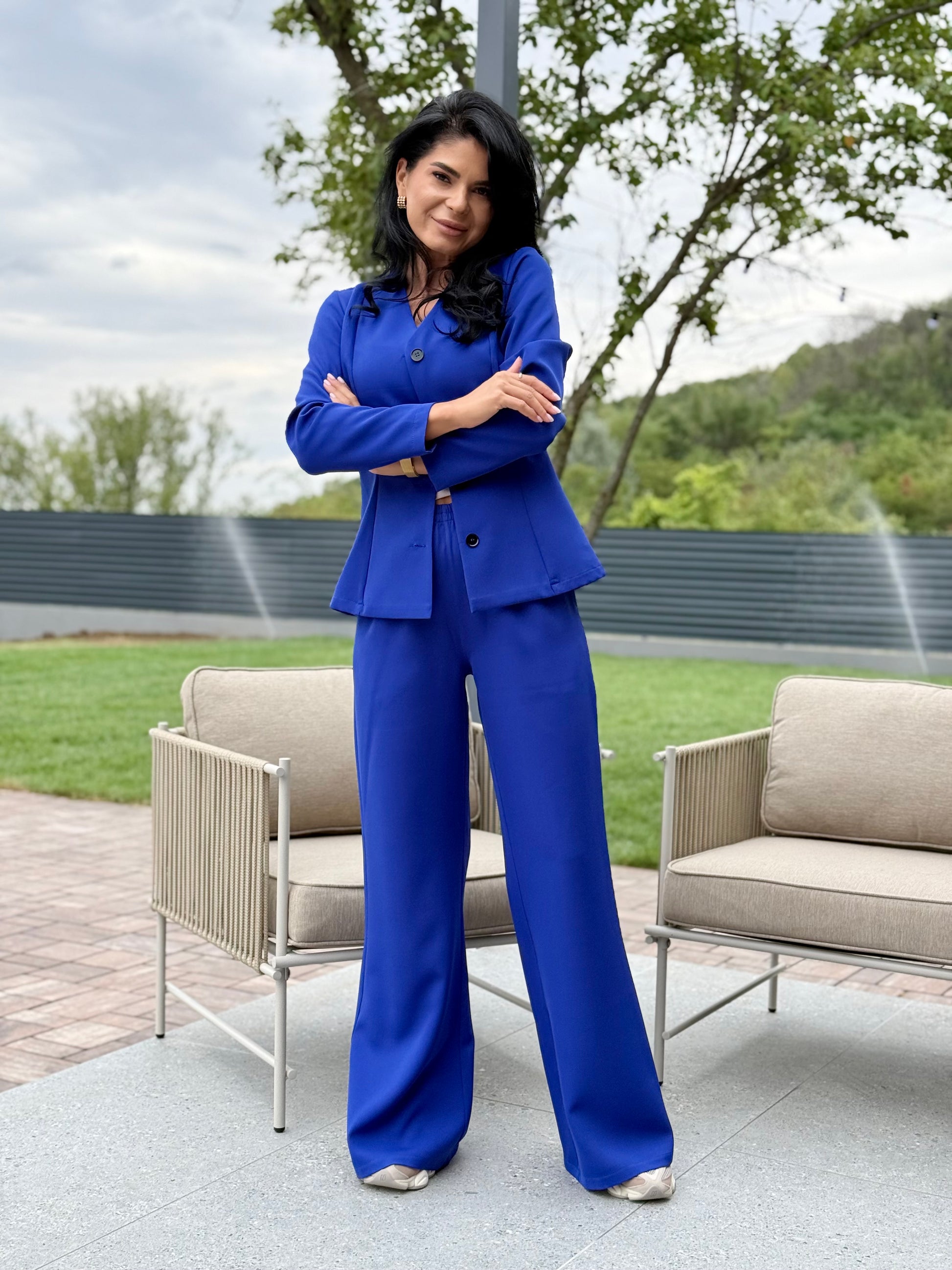 Sacoul are o croiala usor cambrata, un design clasic cu inchidere frontala prin nasturi. Manecile lungi si decolteul discret rotunjit contureaza o silueta feminina si rafinata. Pantalonii au talie elastica pentru confort si un croi lejer, care alungeste vizual silueta.