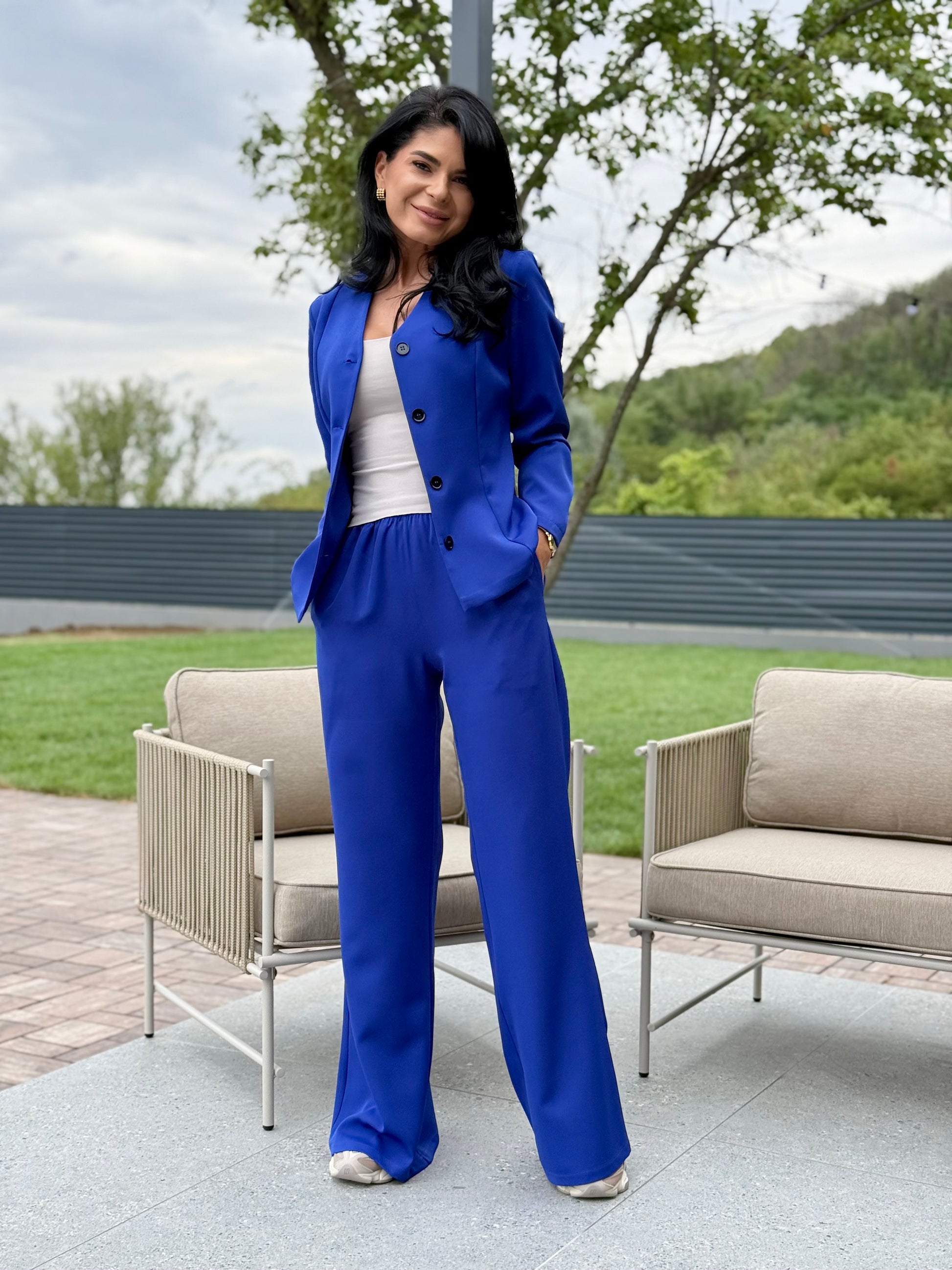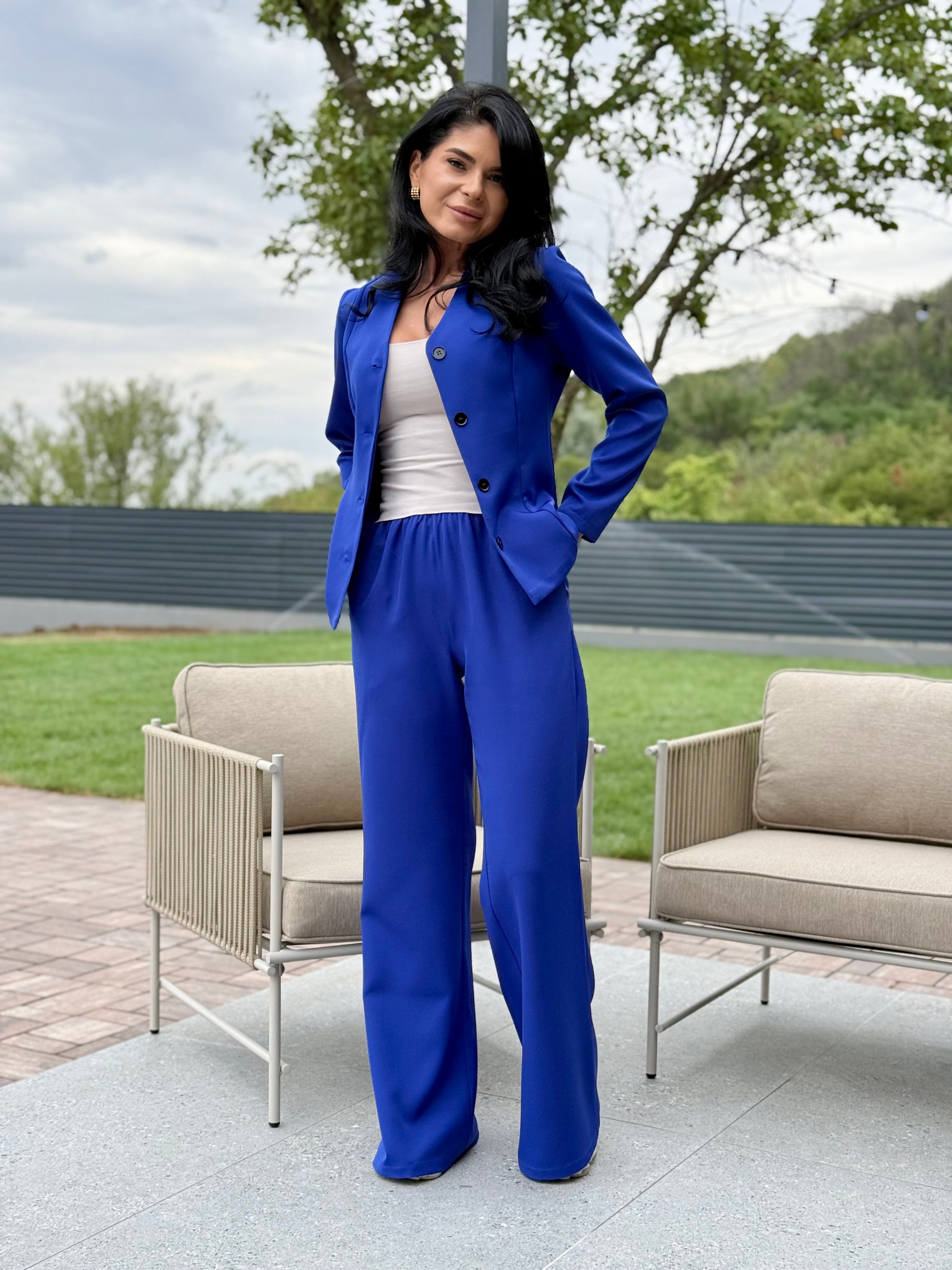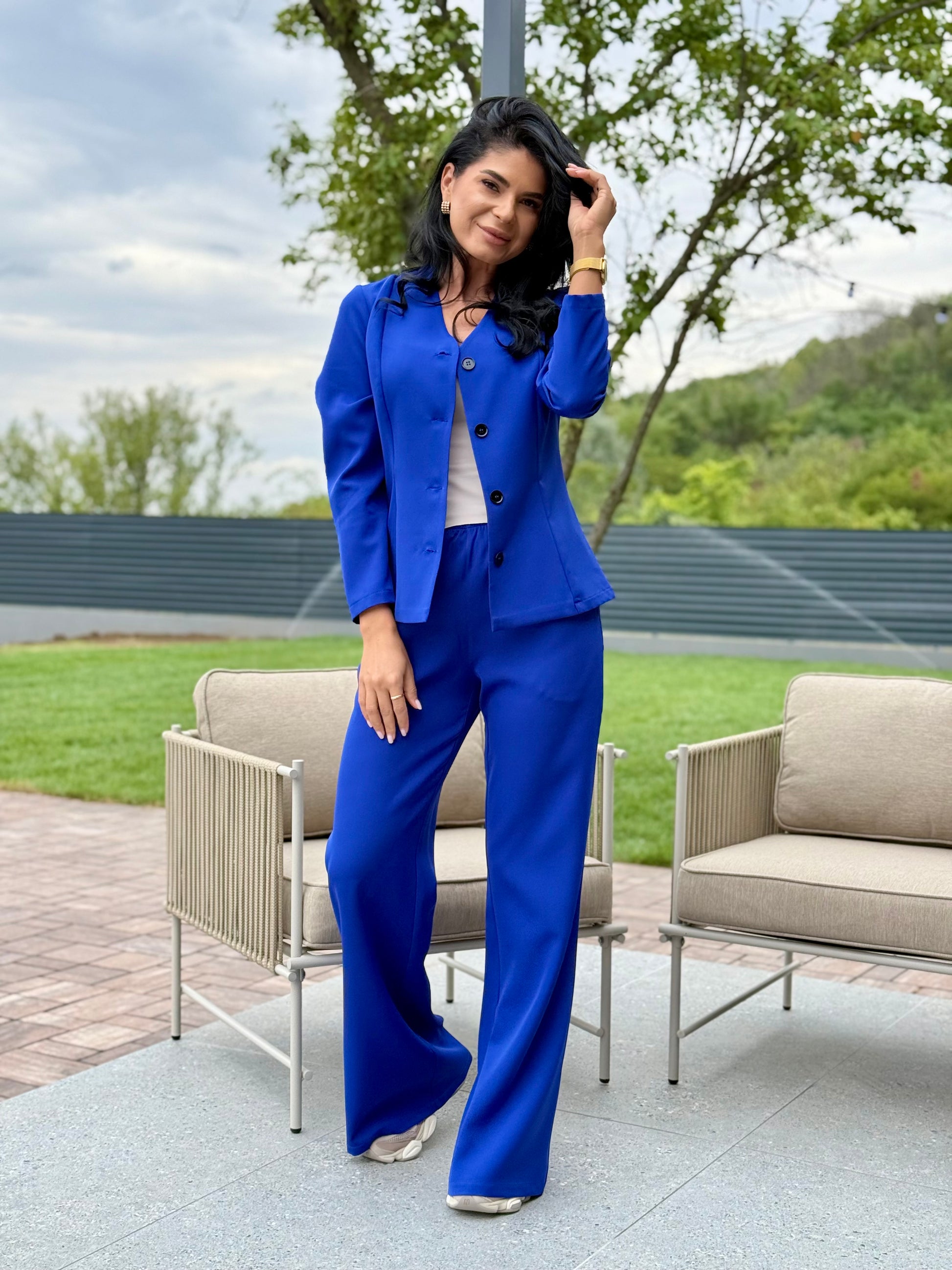 Sacoul are o croiala usor cambrata, un design clasic cu inchidere frontala prin nasturi. Manecile lungi si decolteul discret rotunjit contureaza o silueta feminina si rafinata. Pantalonii au talie elastica pentru confort si un croi lejer, care alungeste vizual silueta.