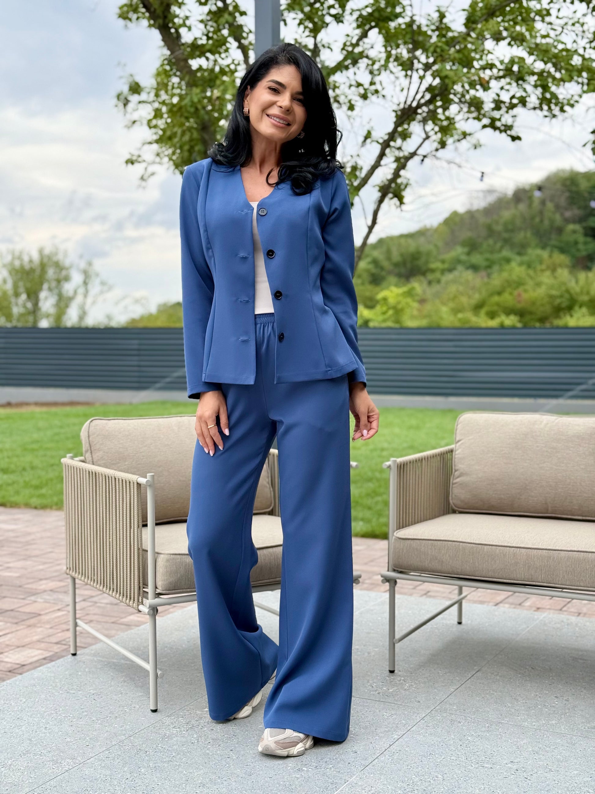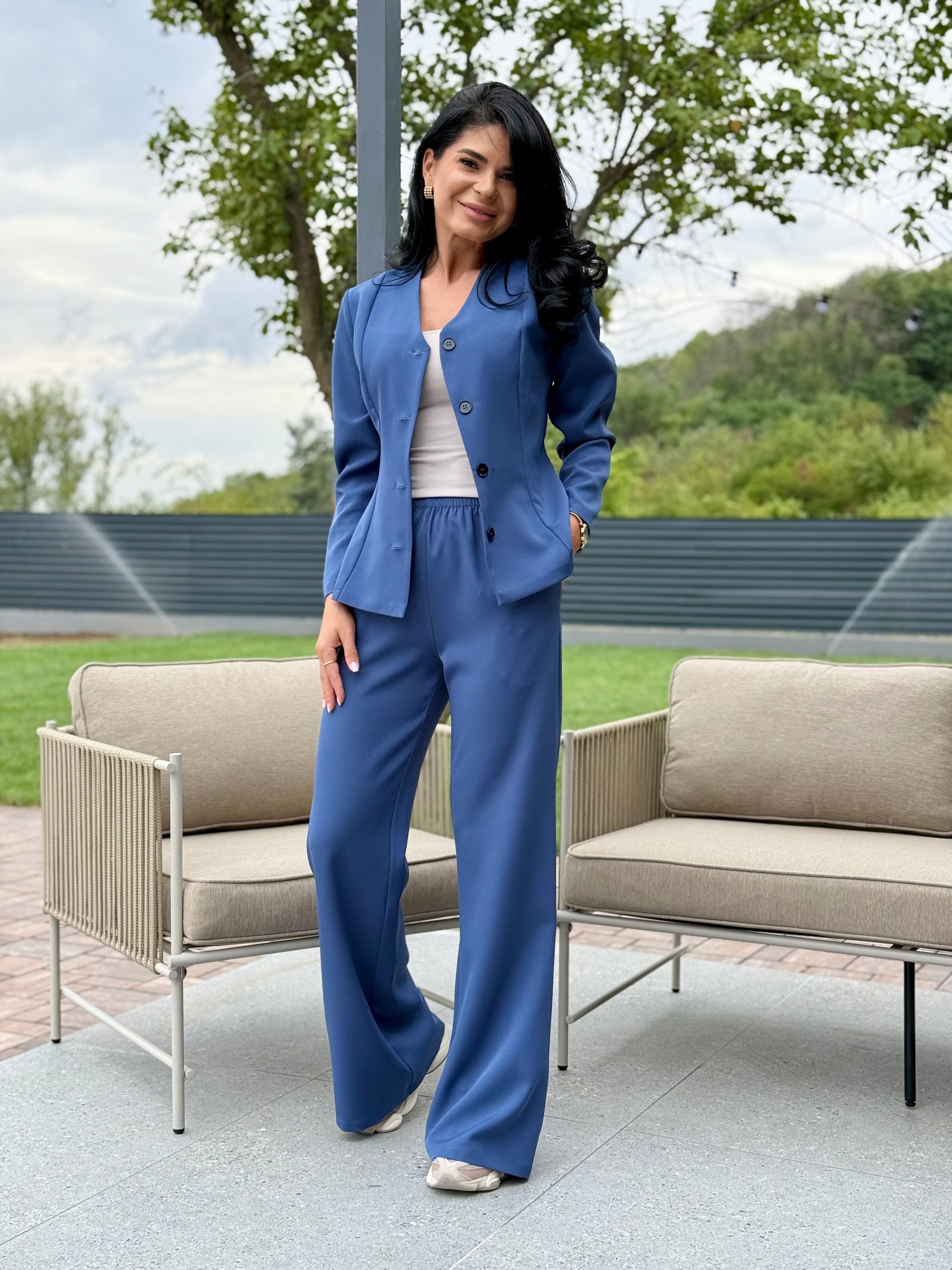 Sacoul are o croiala usor cambrata, un design clasic cu inchidere frontala prin nasturi. Manecile lungi si decolteul discret rotunjit contureaza o silueta feminina si rafinata. Pantalonii au talie elastica pentru confort si un croi lejer, care alungeste vizual silueta.