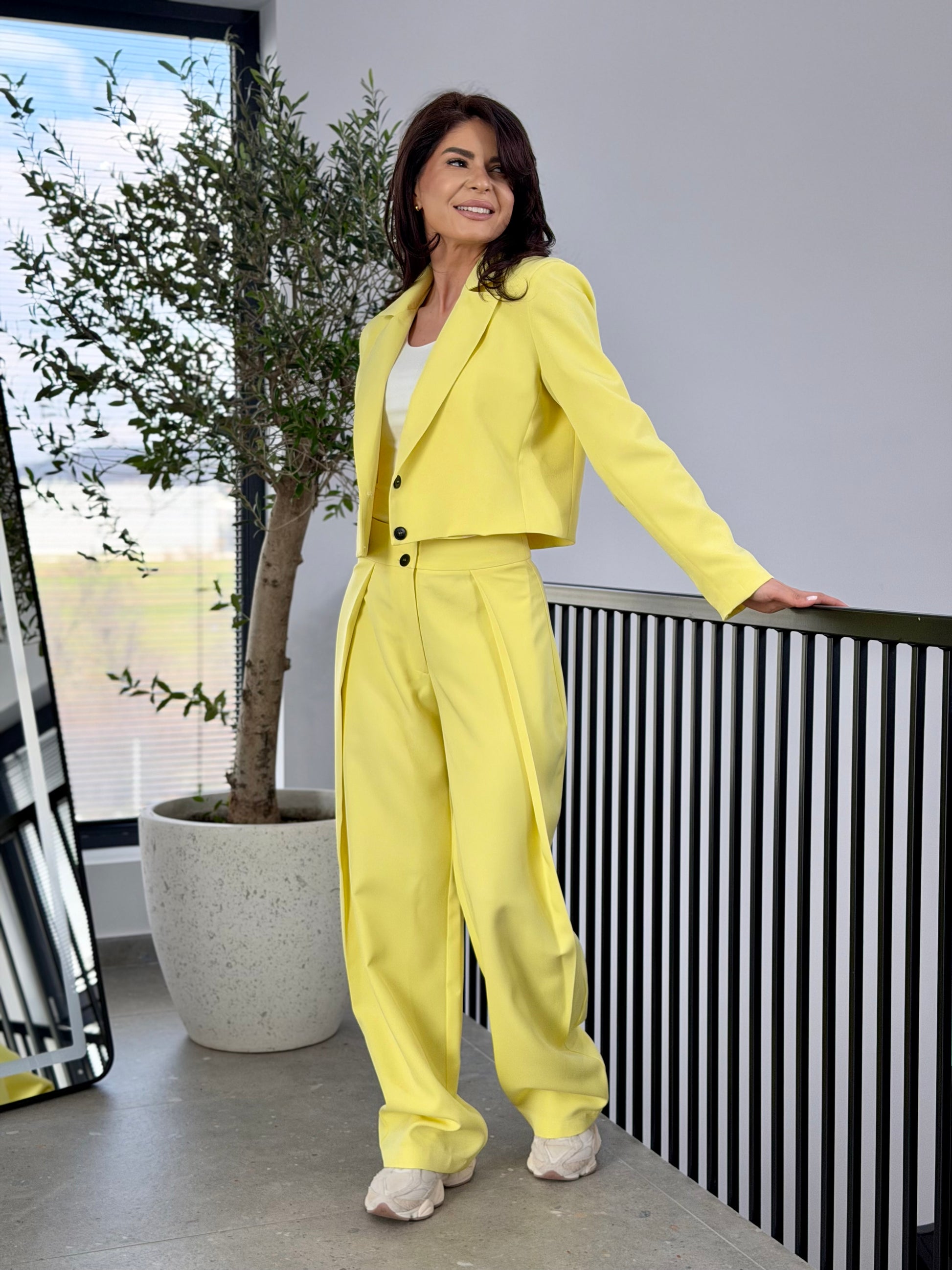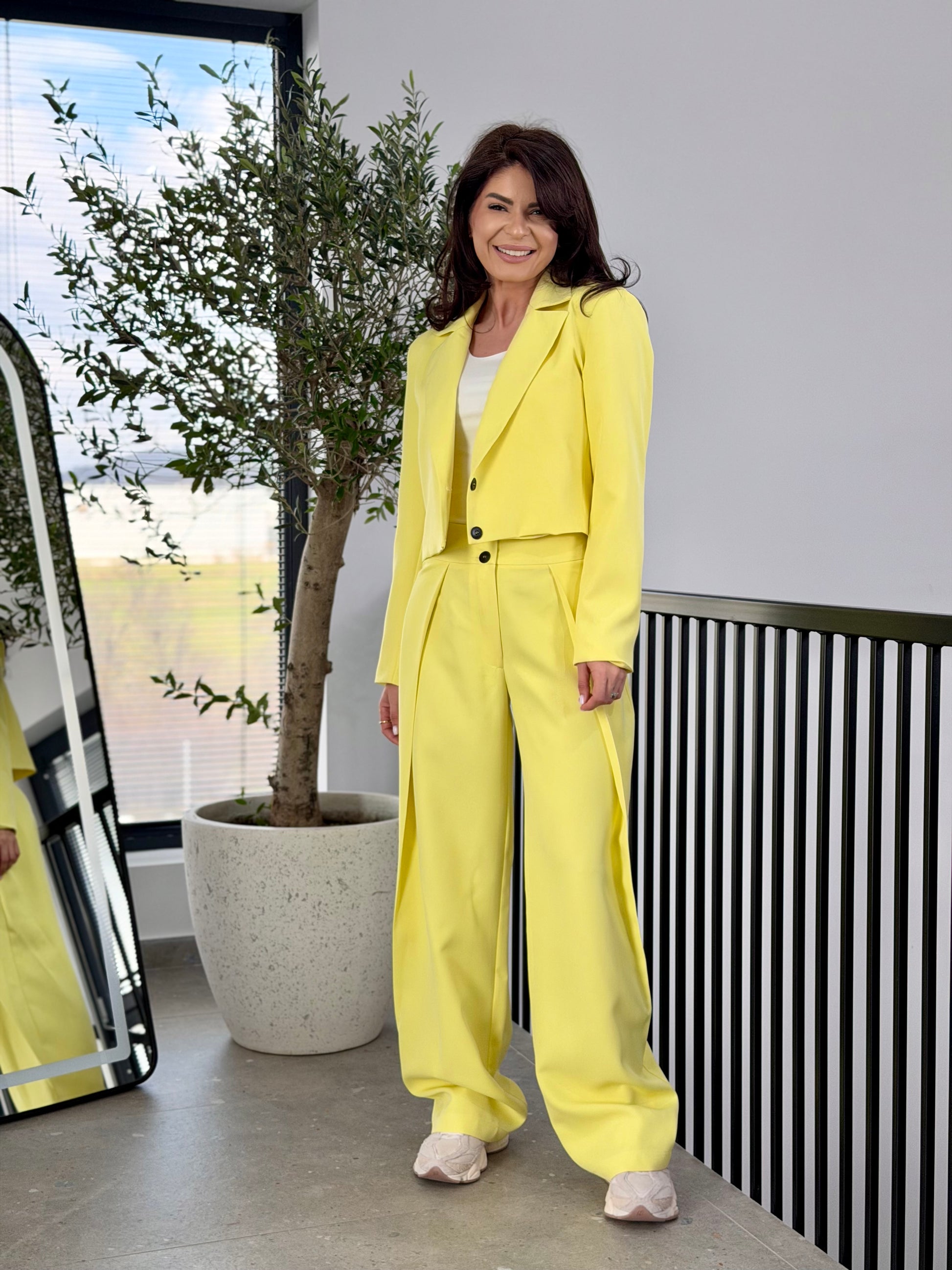 Pantalonii cu talie fixă completează perfect ansamblul, conturând zona mediană și oferind stabilitate în purtare. Linia amplă și căderea fluidă creează un efect de alungire a siluetei, accentuat de pliurile frontale care adaugă volum controlat și rafinament.