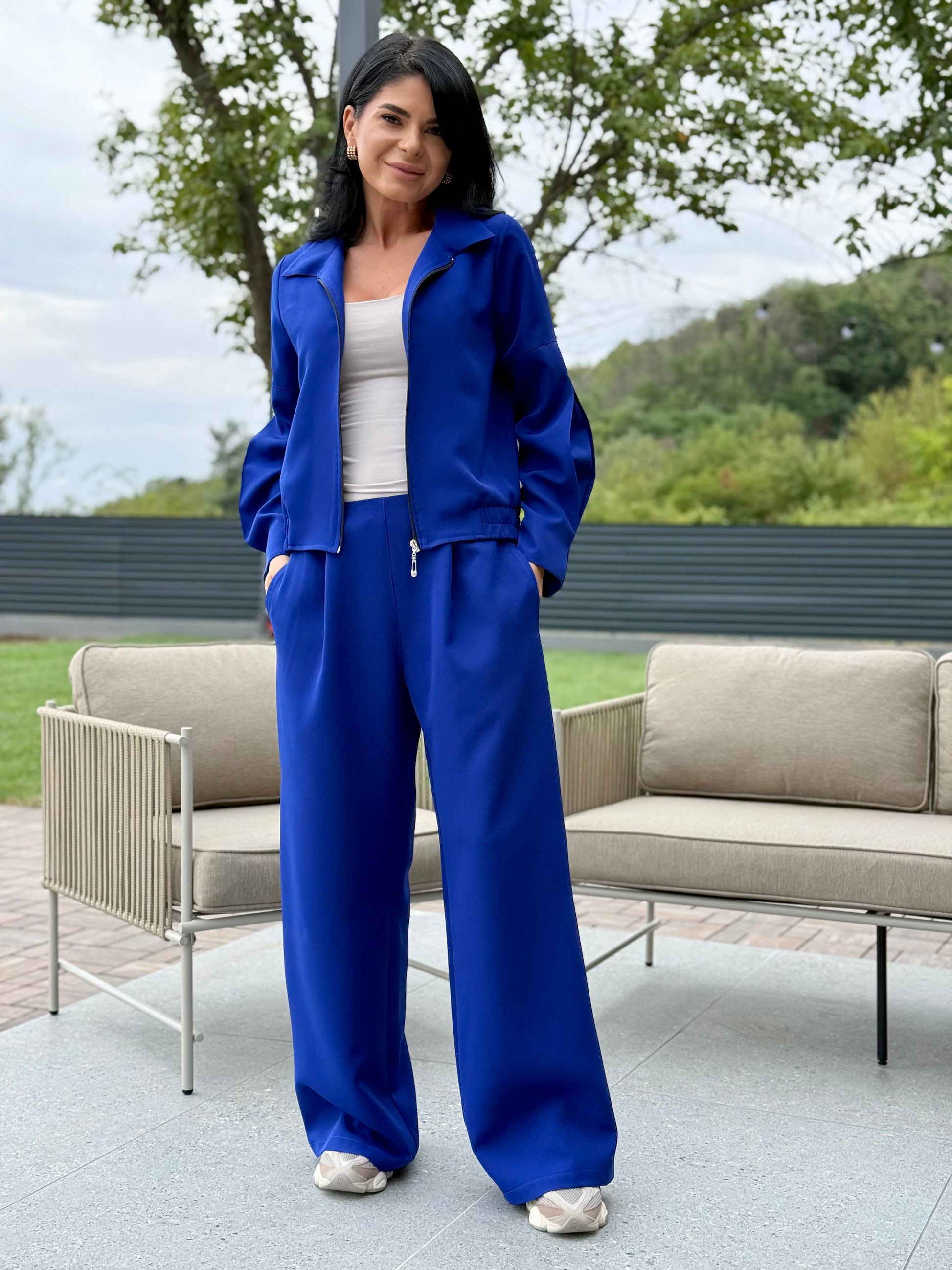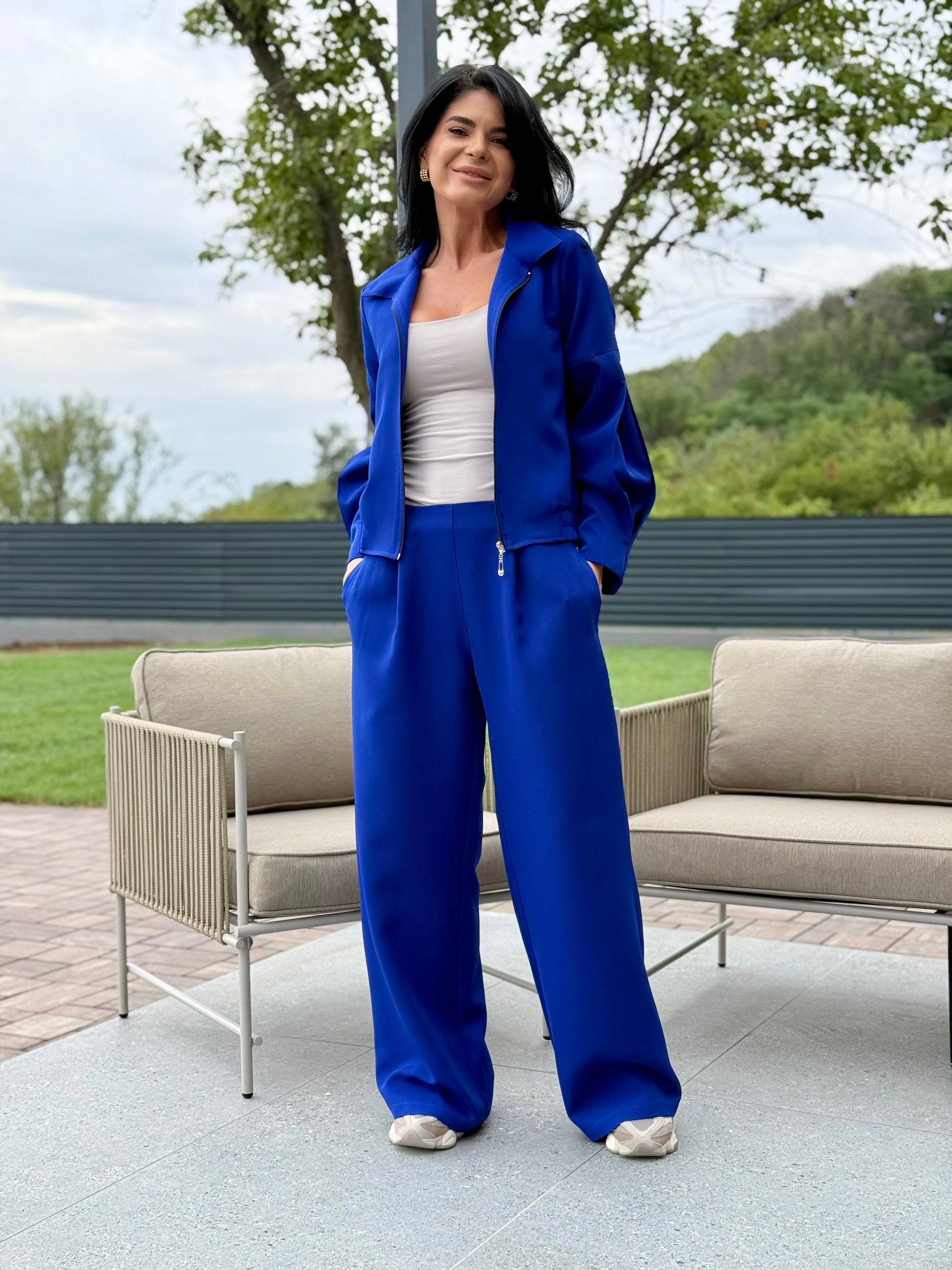 Jacheta este realizata intr-o croiala moderna, cu fermoar frontal, guler clasic si buzunare laterale. Talia usor elastica, adauga un plus de confort si defineste subtil silueta. Pantalonii lejeri, cu talie elastica pe zona de spate, ofera libertate de miscare si versatilitate in modul de purtare.