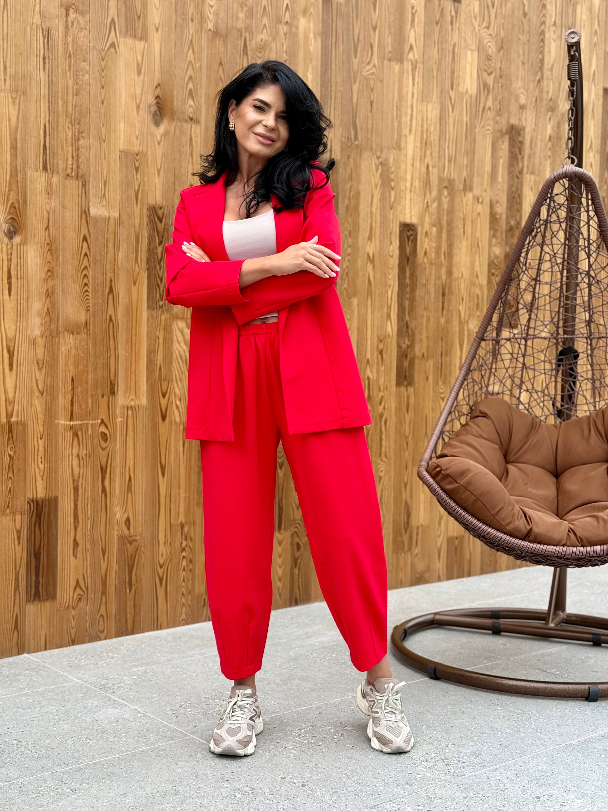 Costum casual din doua piese, sacoul are o croiala lejera, cu linii fluide si maneci lungi, se inchide cu un nasture, usor de purtat si versatil pentru orice ocazie. Pantalonii au talie elastica pentru confort, croi relaxat si terminatie conica la tiv.