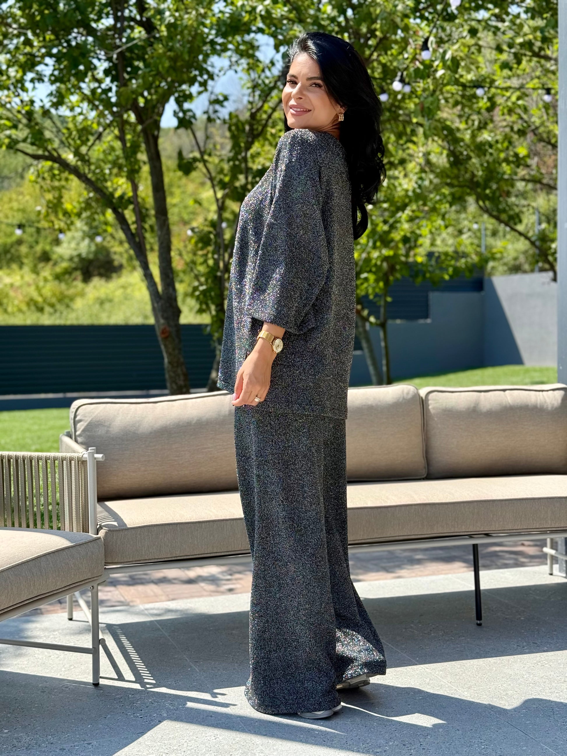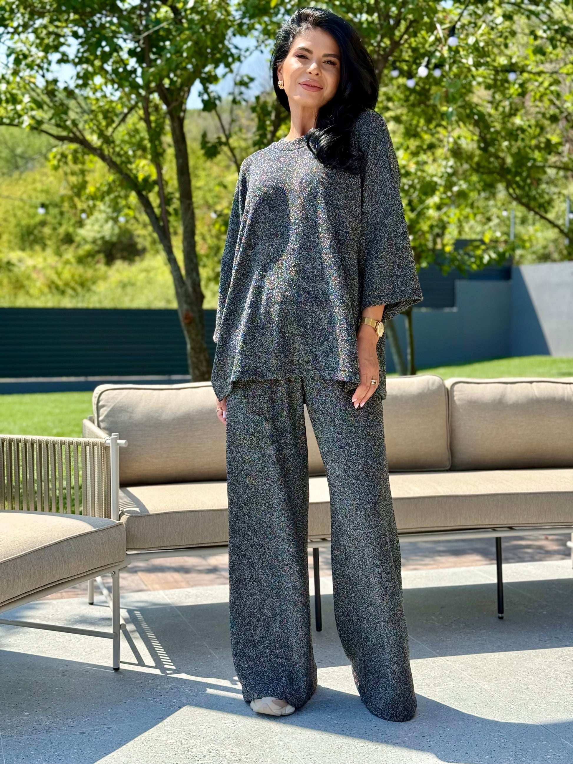 Un set modern si versatil, realizat din tricot cu fir lurex, care ofera un efect subtil de stralucire. Bluza are un croi lejer, tip oversized, cu maneci trei sferturi si linie dreapta, asigurand confort si libertate de miscare. Pantalonii au talie elastica, lejeri, fluizi, alungesc silueta si adauga un plus de eleganta relaxata.
