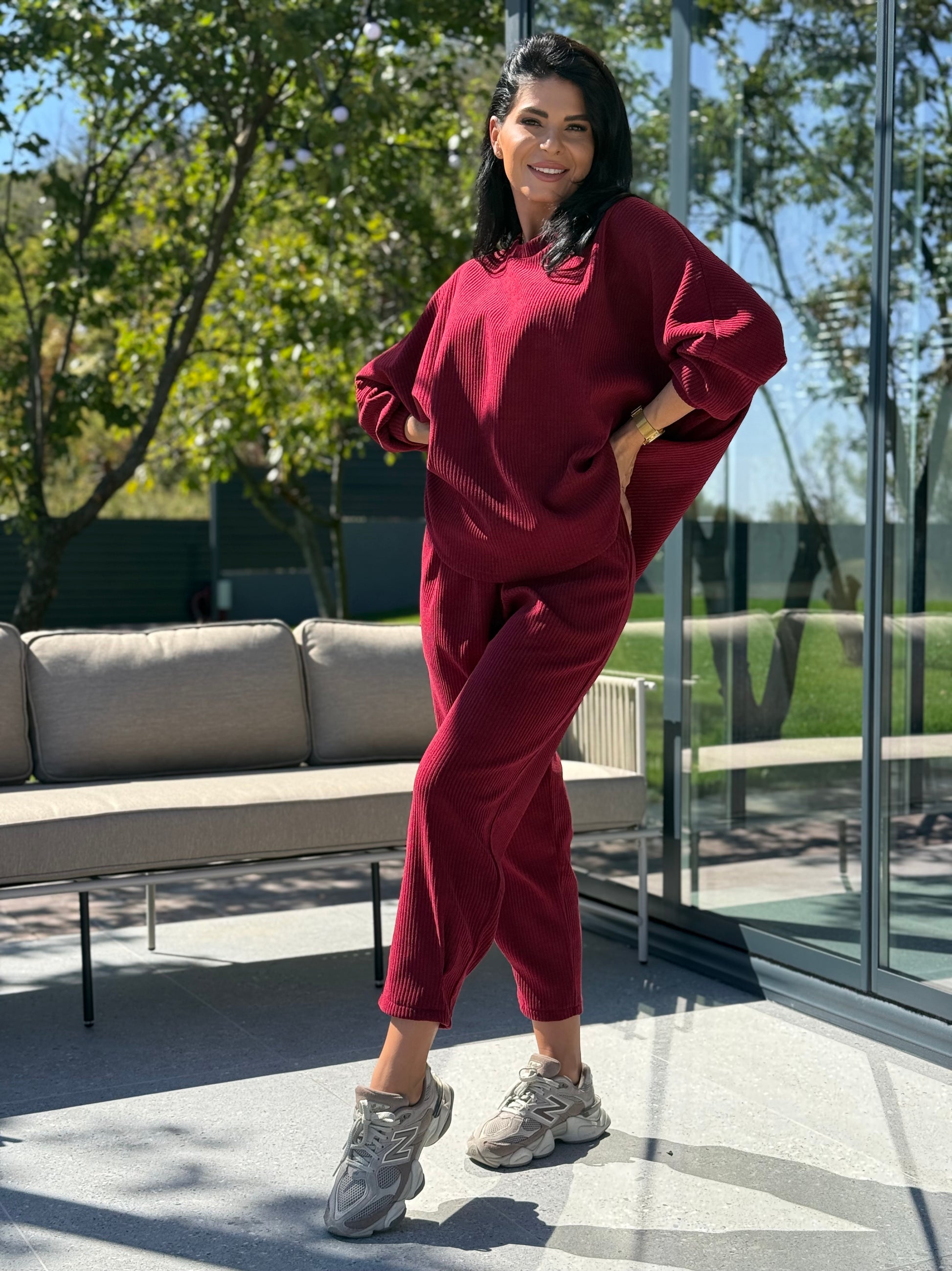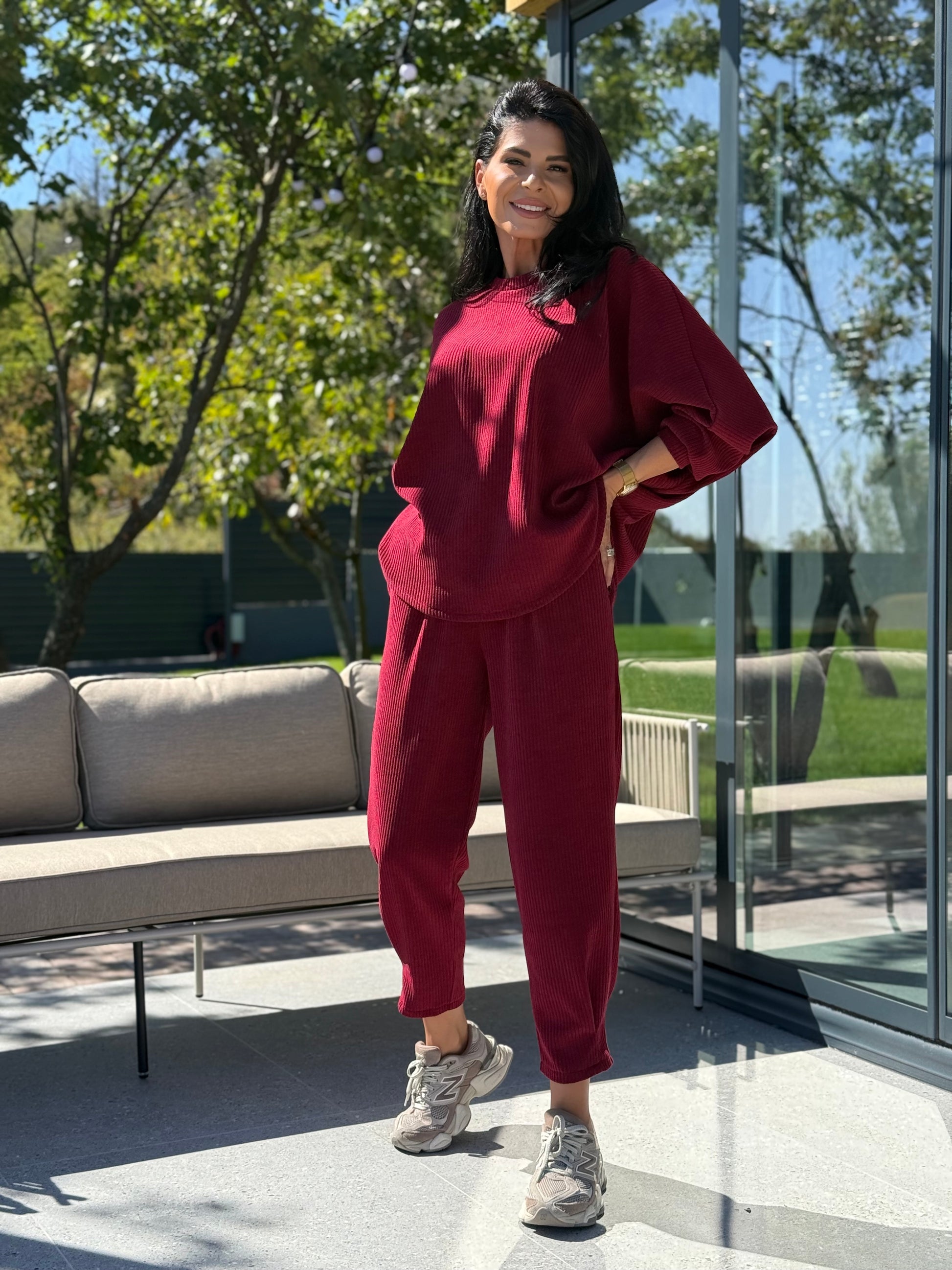Costumul din catifea reiată aduce un mix perfect de stil și confort într-un design casual-chic. Materialul reiat este ideal pentru zilele în care vrei să te simți comod fără a renunța la eleganță. Poartă-l cu adidași pentru un outfit sport sau cu botine o ținută de toamnă.
