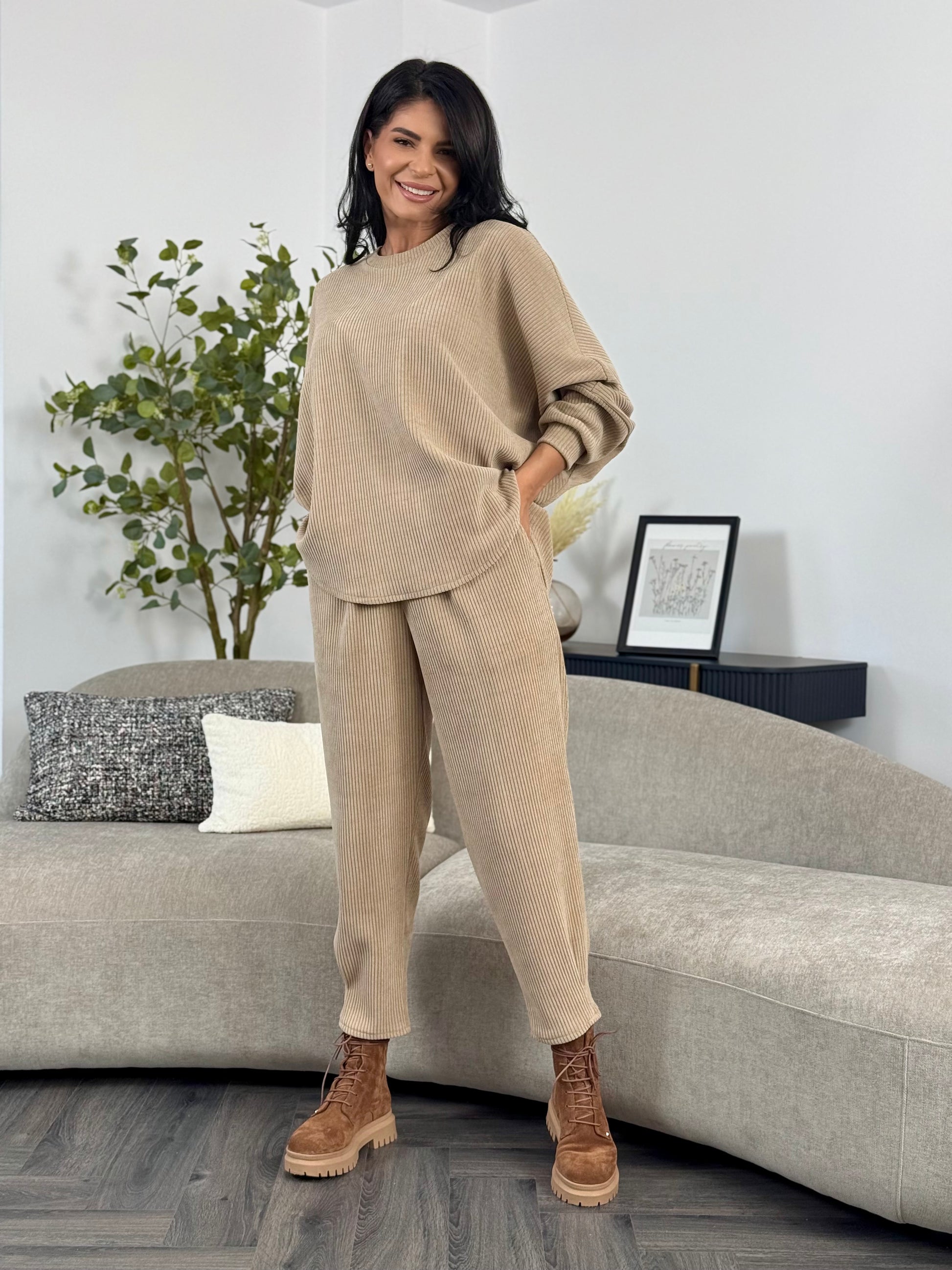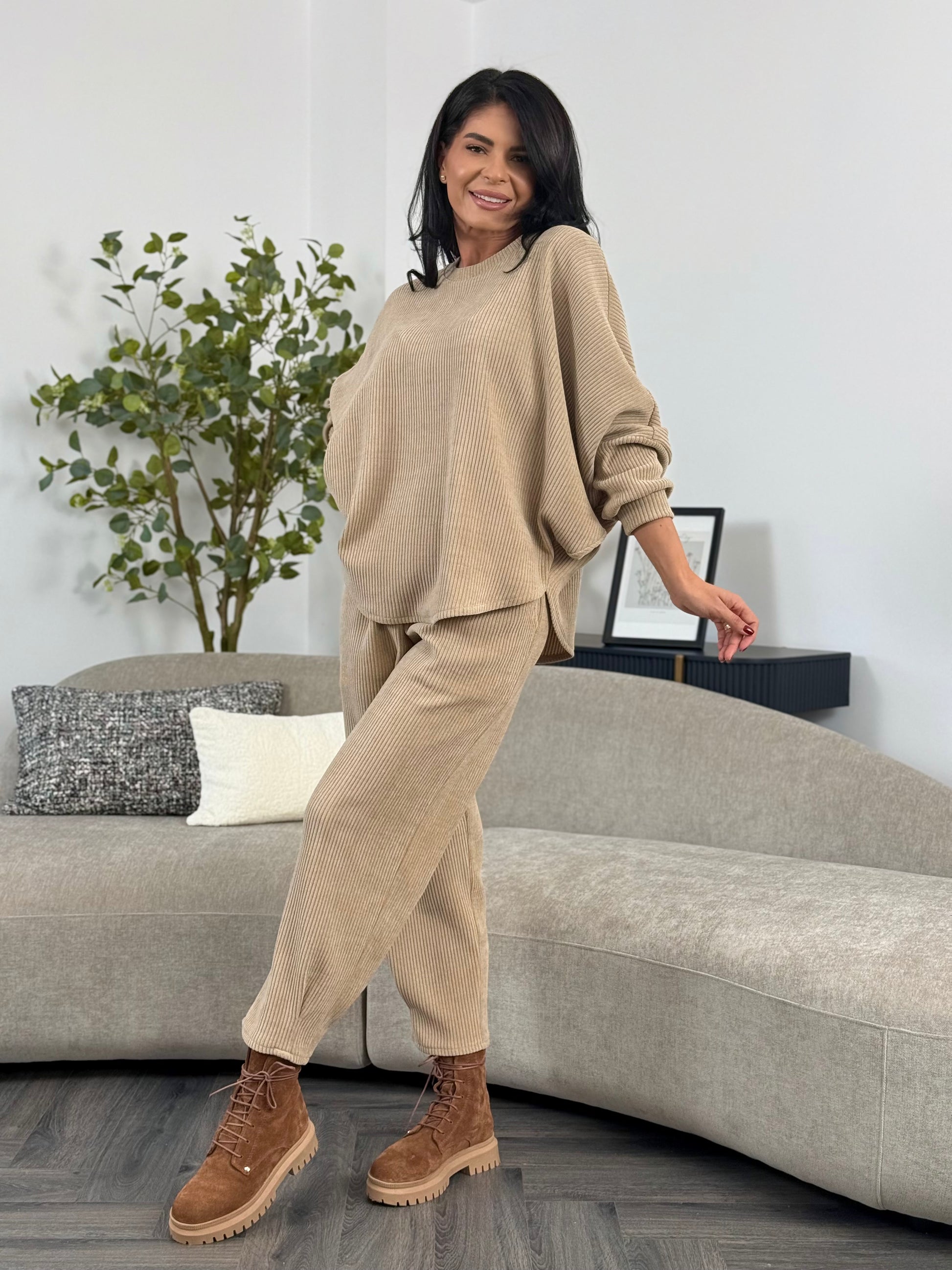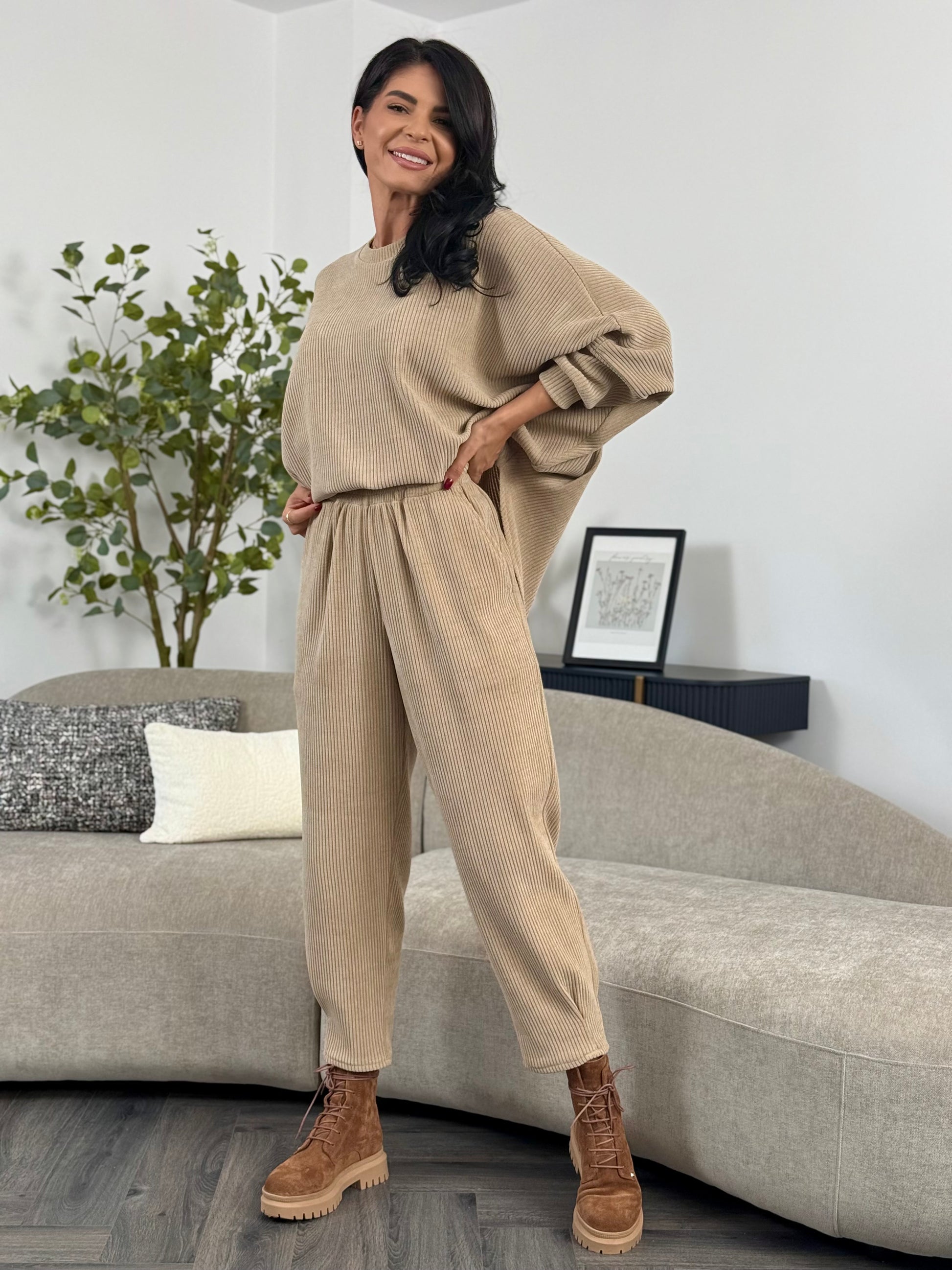 Costumul din catifea reiată aduce un mix perfect de stil și confort într-un design casual-chic. Materialul reiat este ideal pentru zilele în care vrei să te simți comod fără a renunța la eleganță. Poartă-l cu adidași pentru un outfit sport sau cu botine o ținută de toamnă.