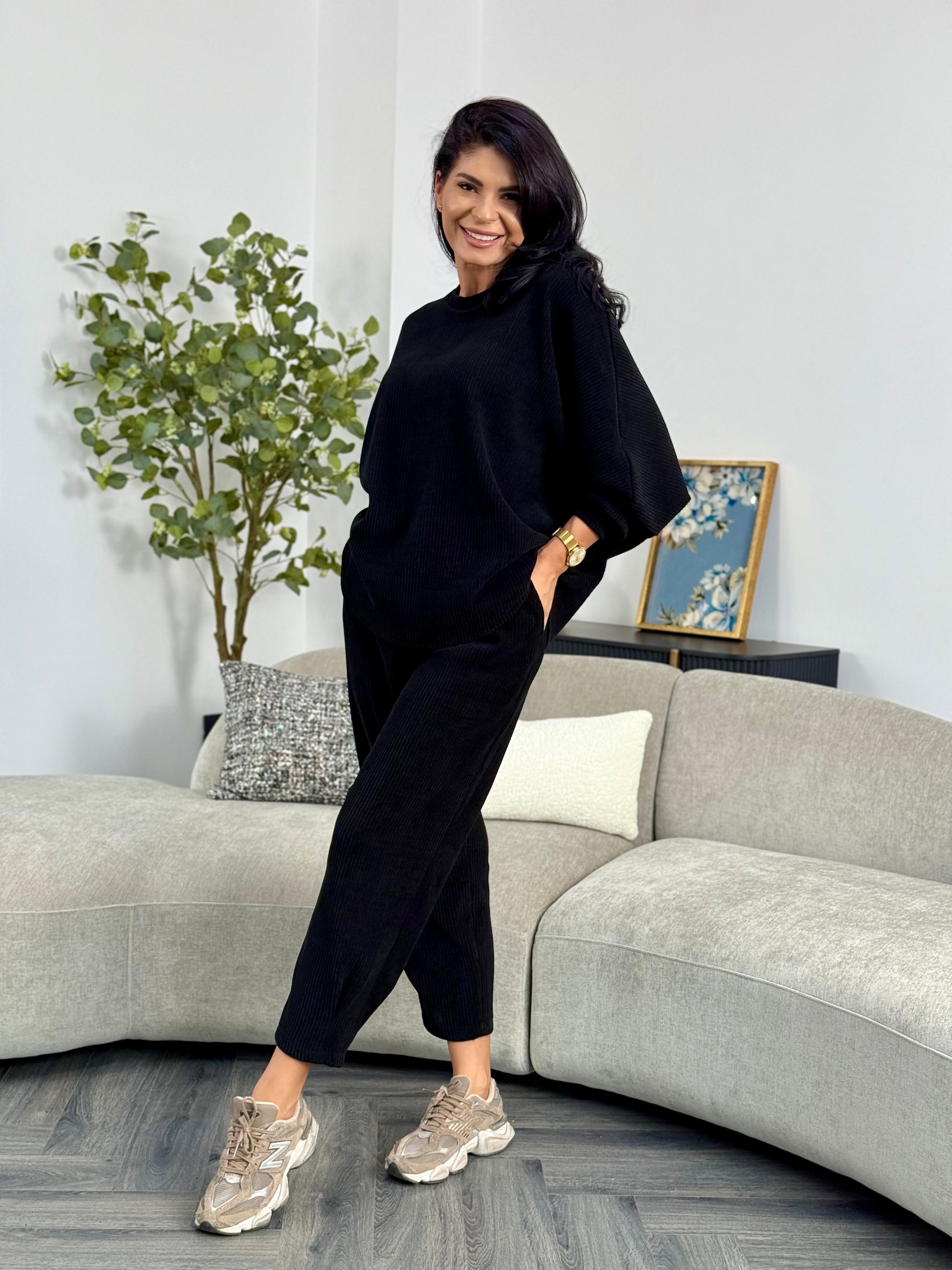 Costumul din catifea reiată aduce un mix perfect de stil și confort într-un design casual-chic. Materialul reiat este ideal pentru zilele în care vrei să te simți comod fără a renunța la eleganță. Poartă-l cu adidași pentru un outfit sport sau cu botine o ținută de toamnă.