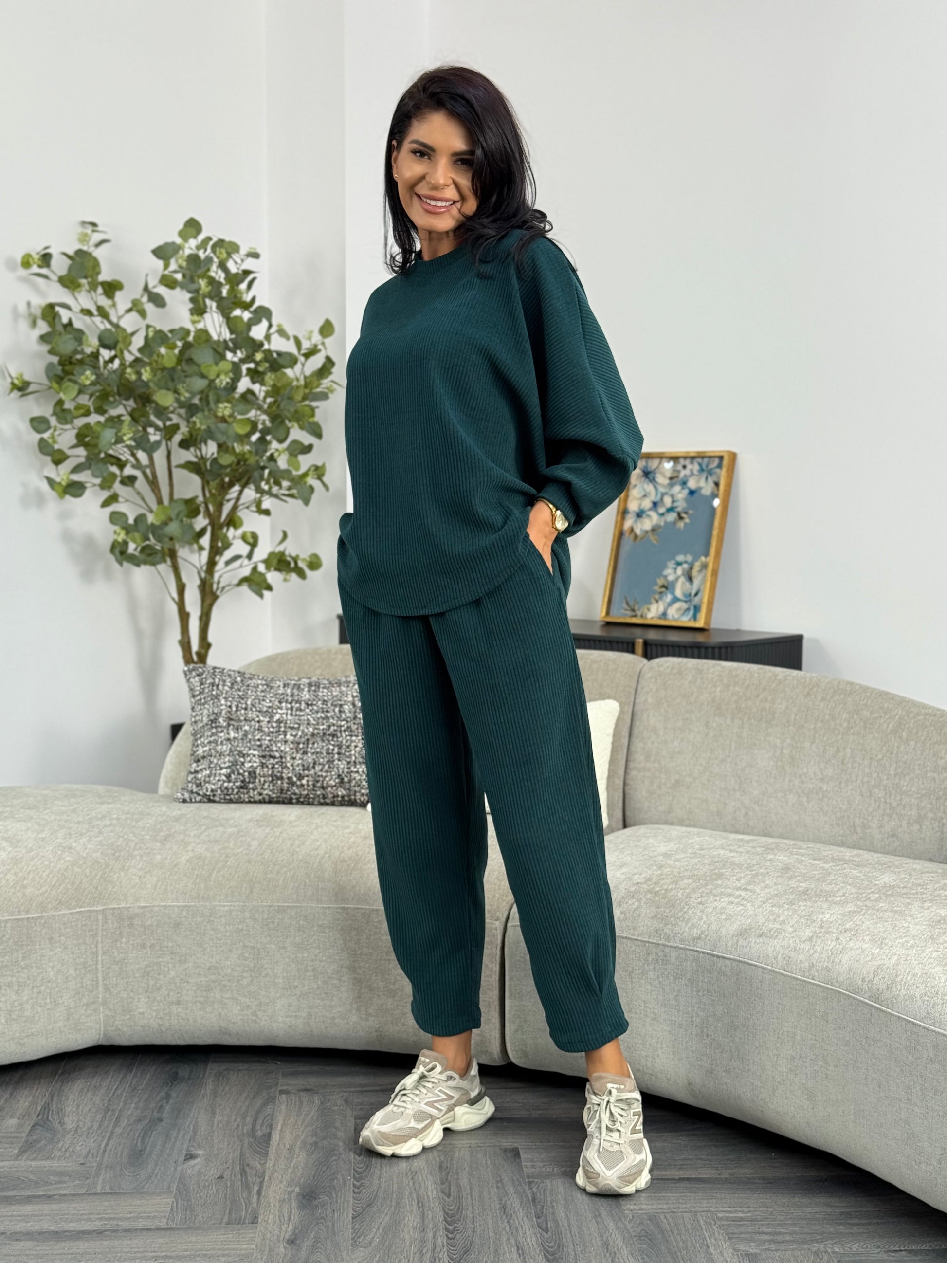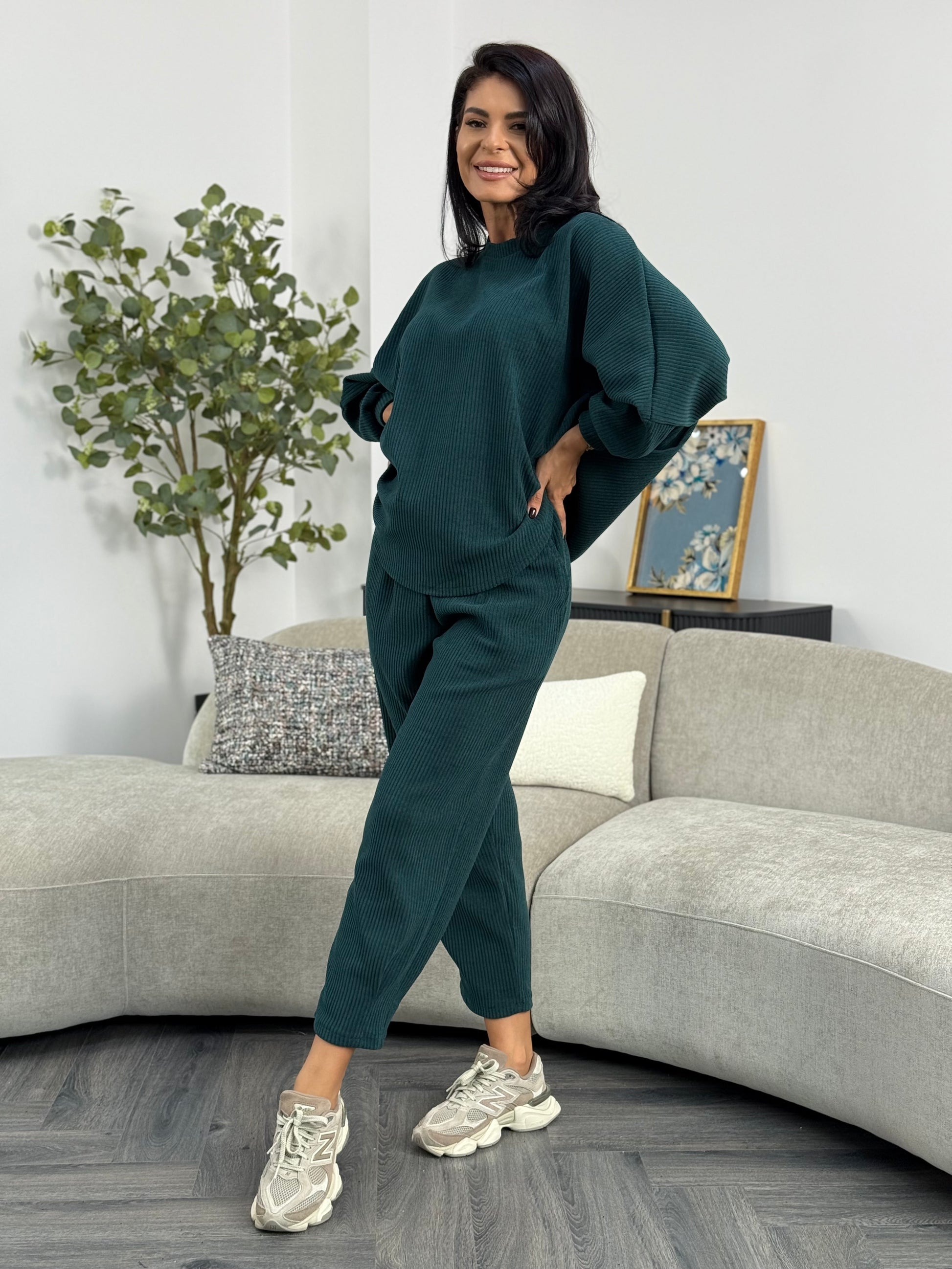 Costumul din catifea reiată aduce un mix perfect de stil și confort într-un design casual-chic. Materialul reiat este ideal pentru zilele în care vrei să te simți comod fără a renunța la eleganță. Poartă-l cu adidași pentru un outfit sport sau cu botine o ținută de toamnă.