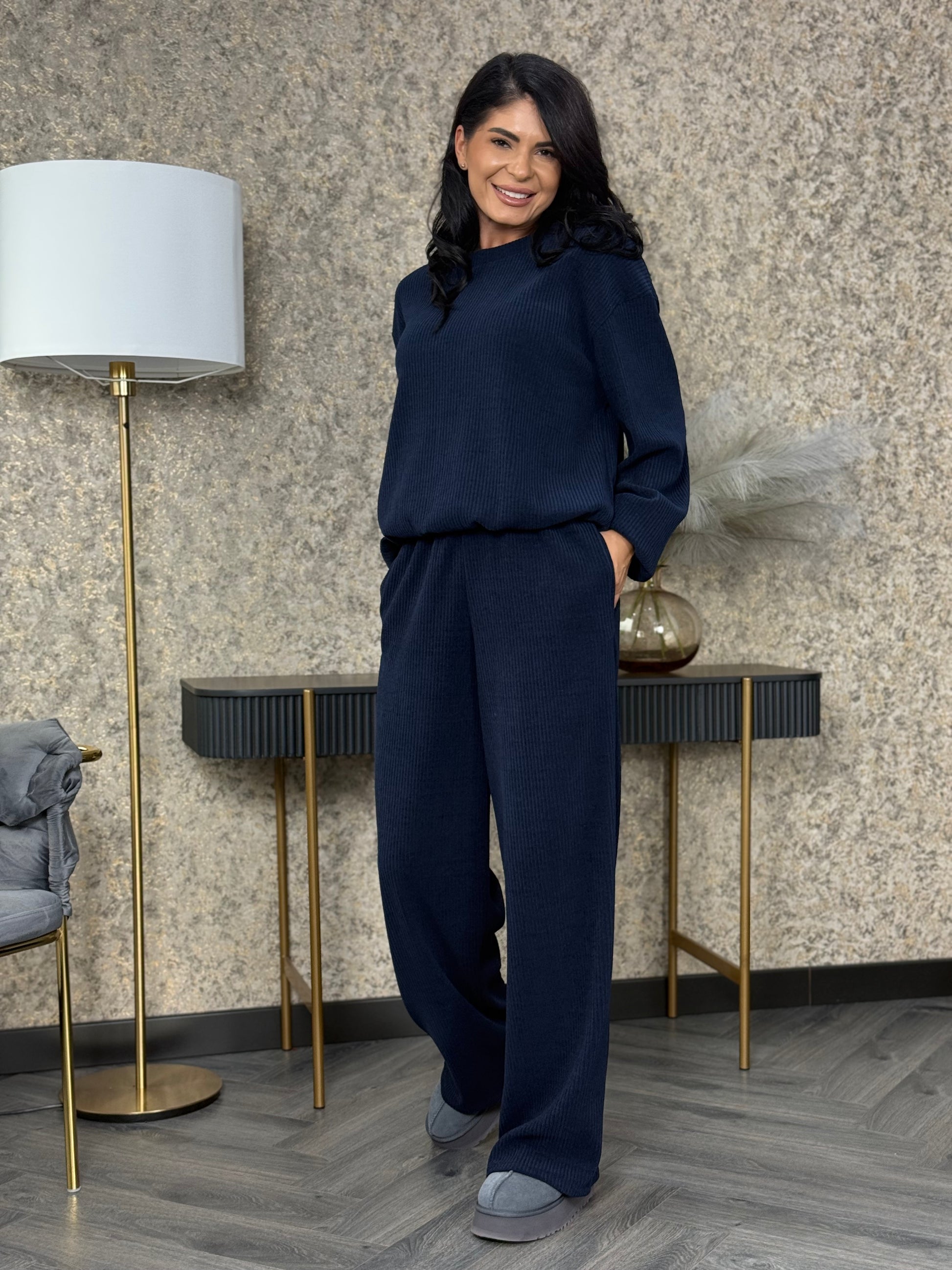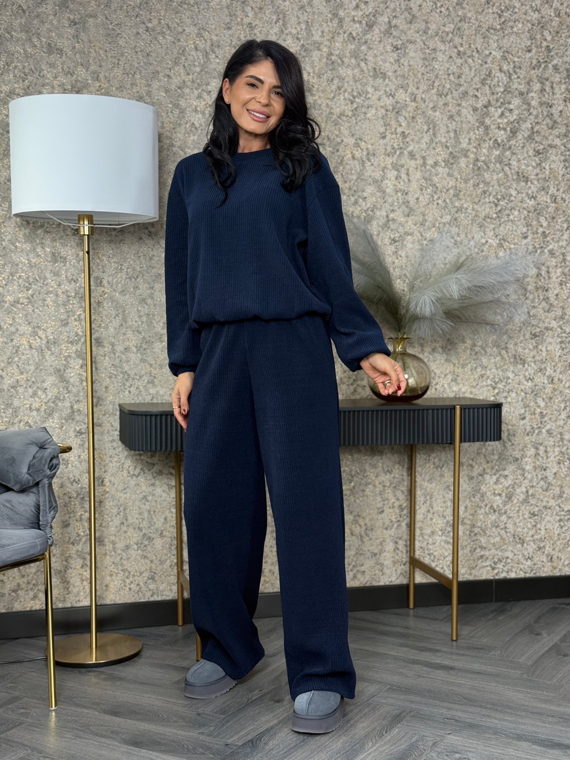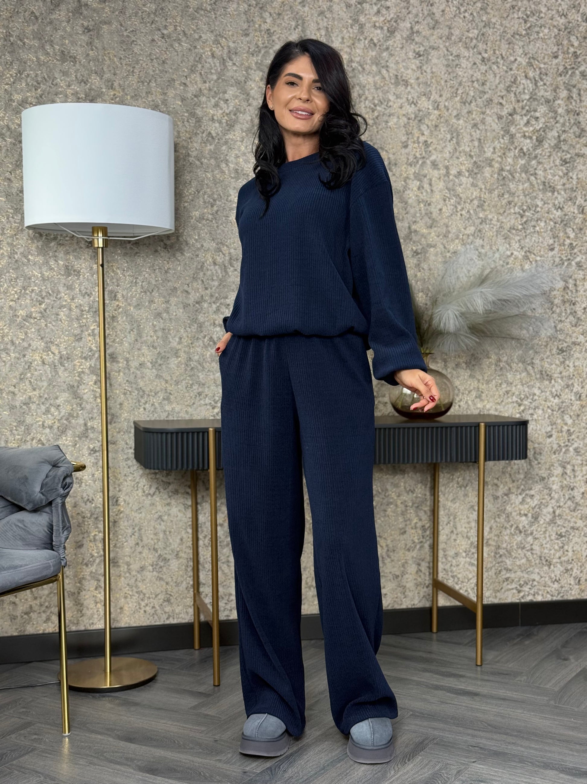 Pantalonii au talie medie inalta, buzunare, croi lejer. Bluza este oversize, iar in partea de jos prezinta o banda din acelasi material pentru a arata cat mai bine estetic.