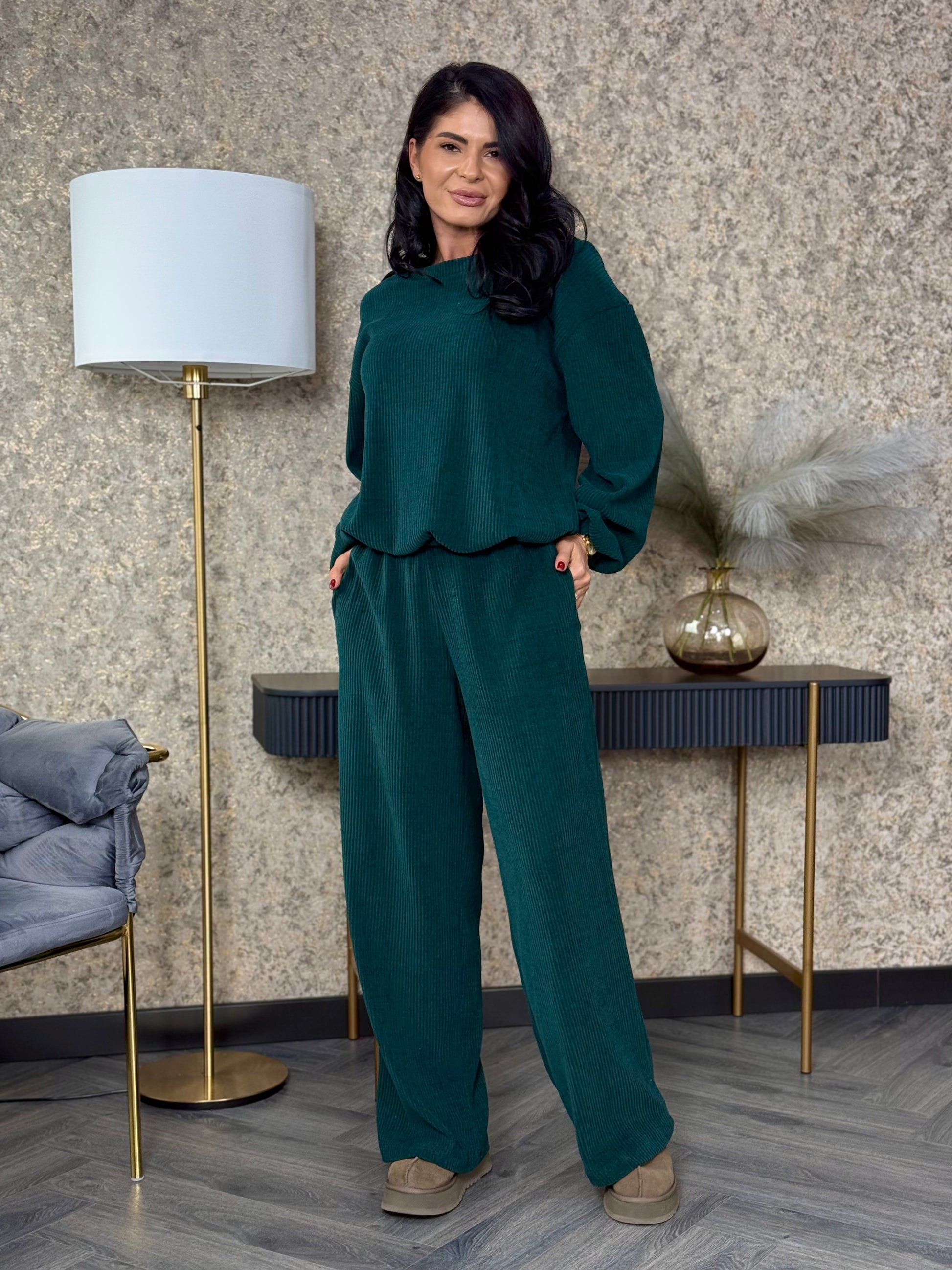 Pantalonii au talie medie inalta, buzunare, croi lejer. Bluza este oversize, iar in partea de jos prezinta o banda din acelasi material pentru a arata cat mai bine estetic.