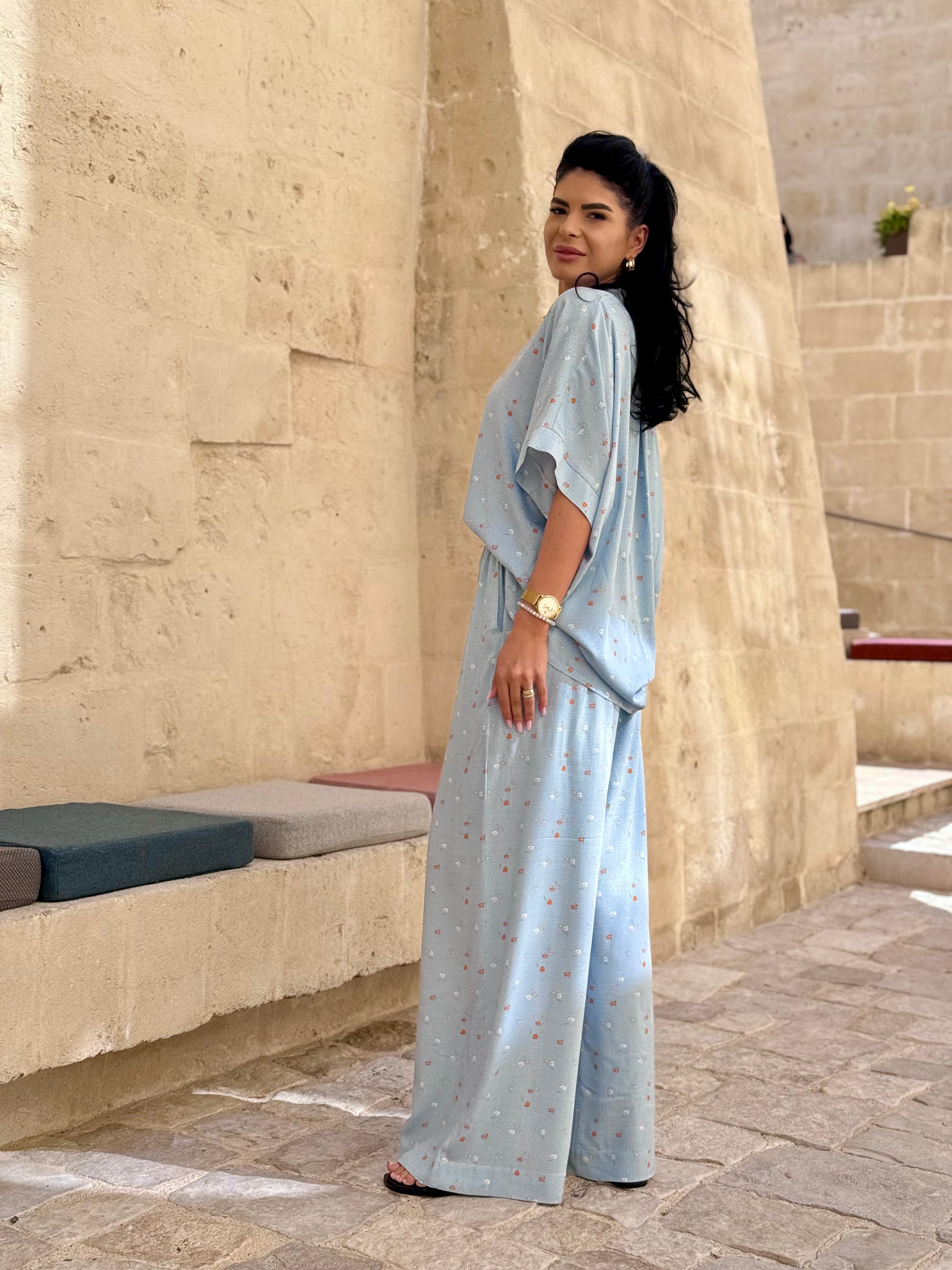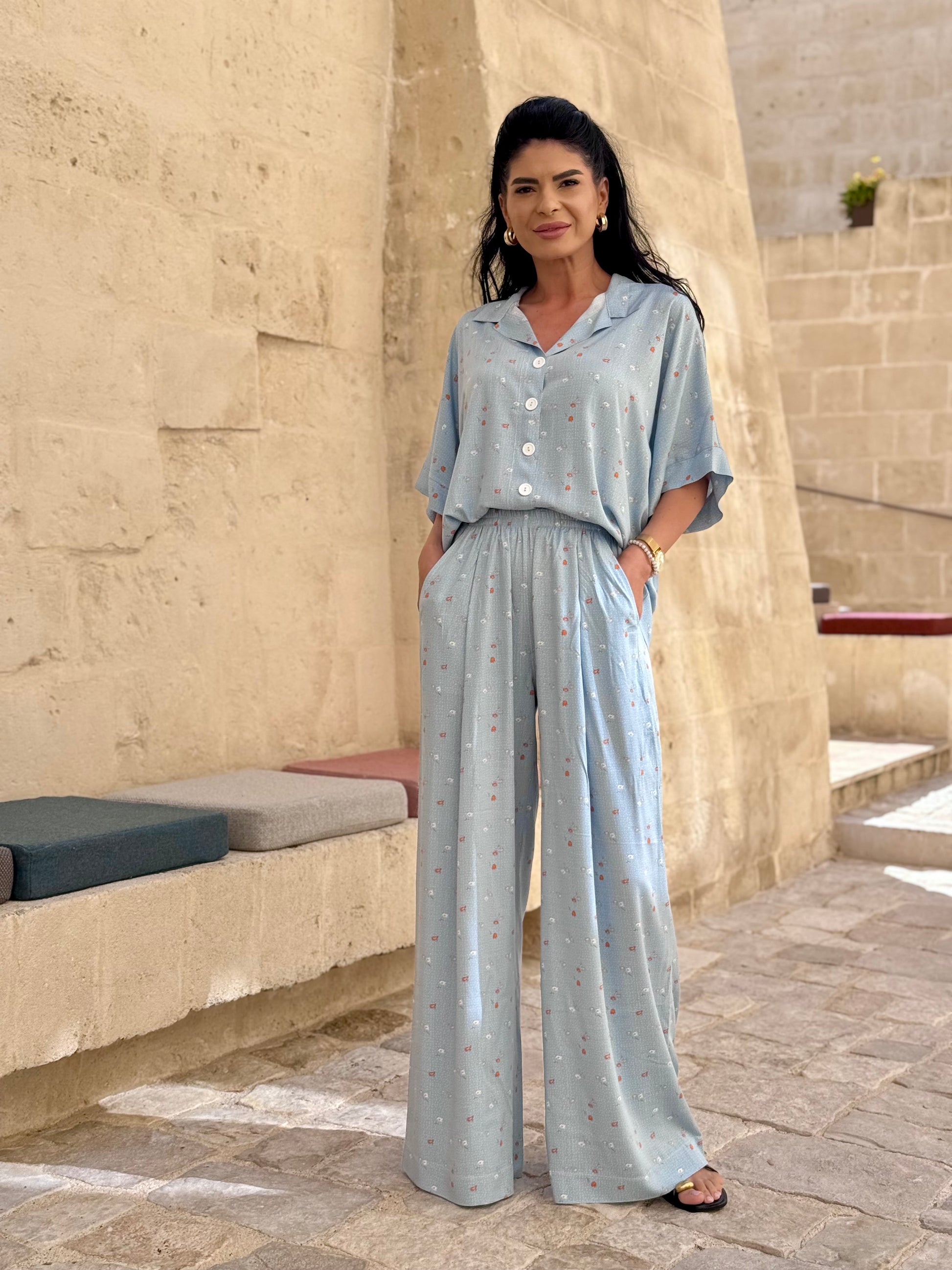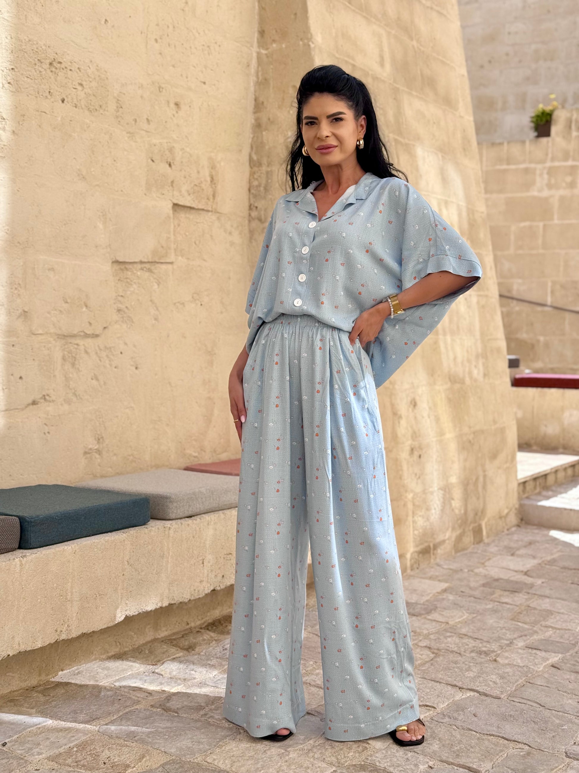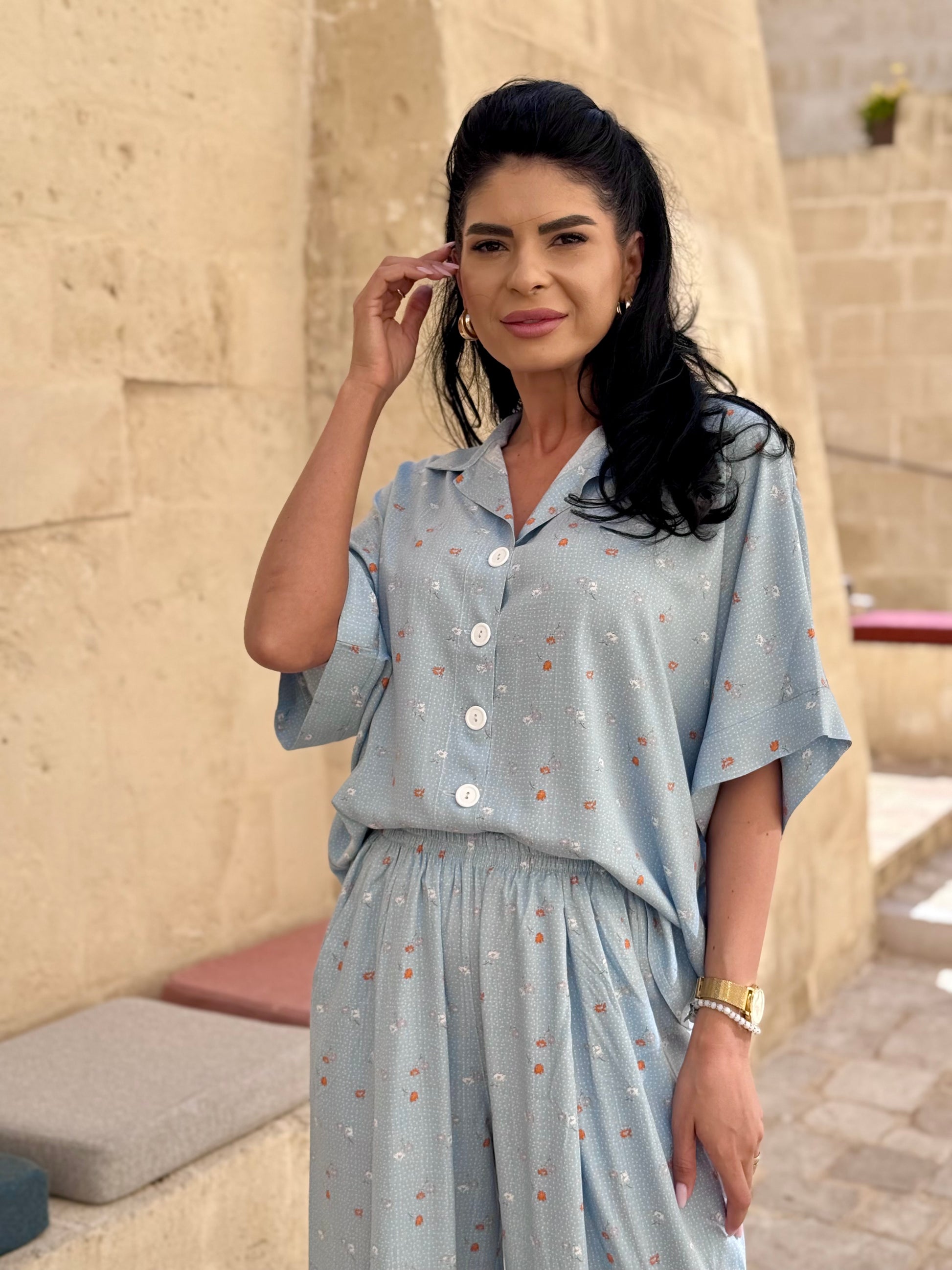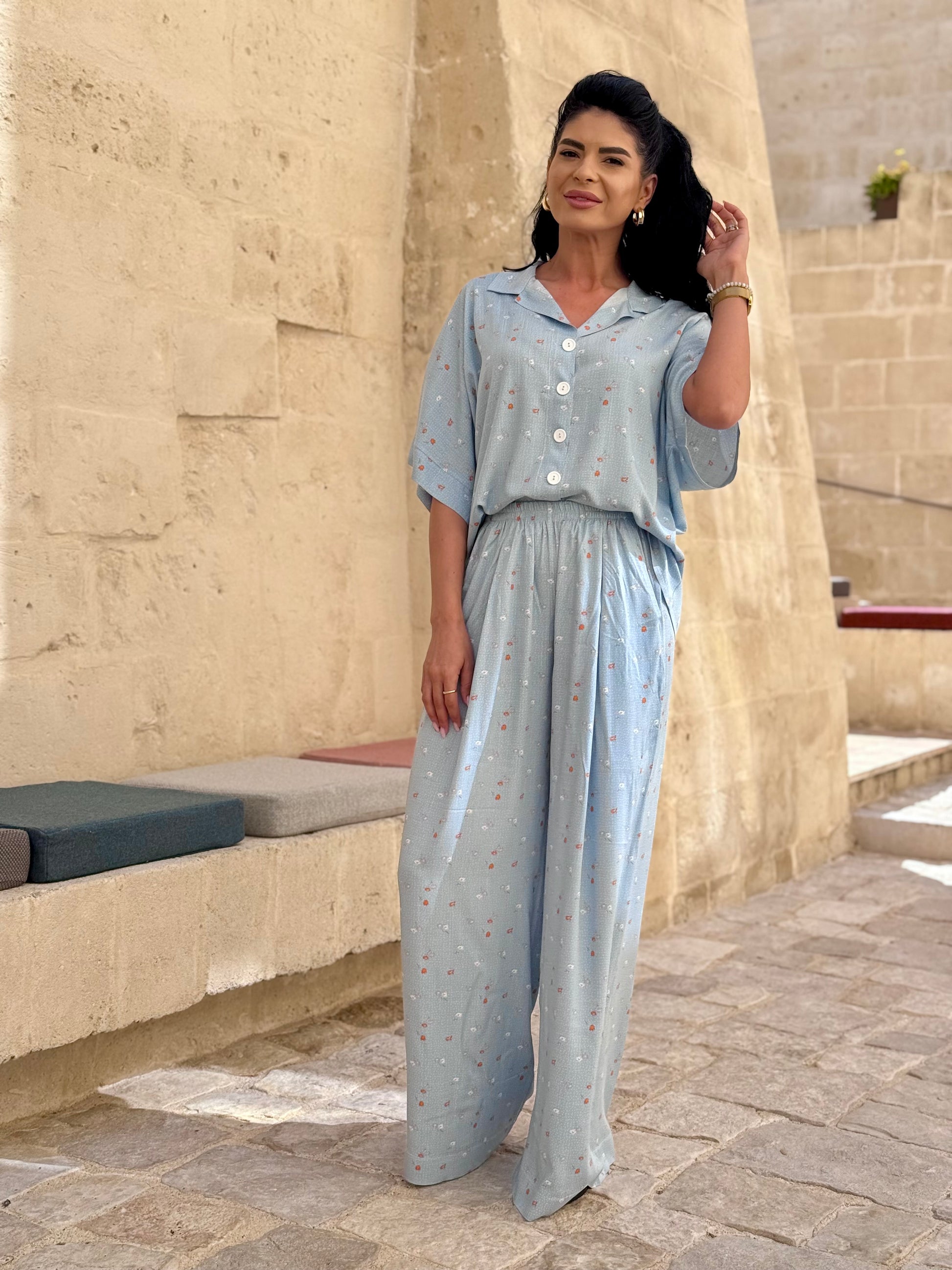 Set lejer din vascoza 100% cu tipar floral modern, compus din camasa cu maneca scurta si pantaloni largi cu talie elastica. Material racoros, fluid si respirabil - ideal pentru zile calduroase, vacante sau iesiri relaxate.