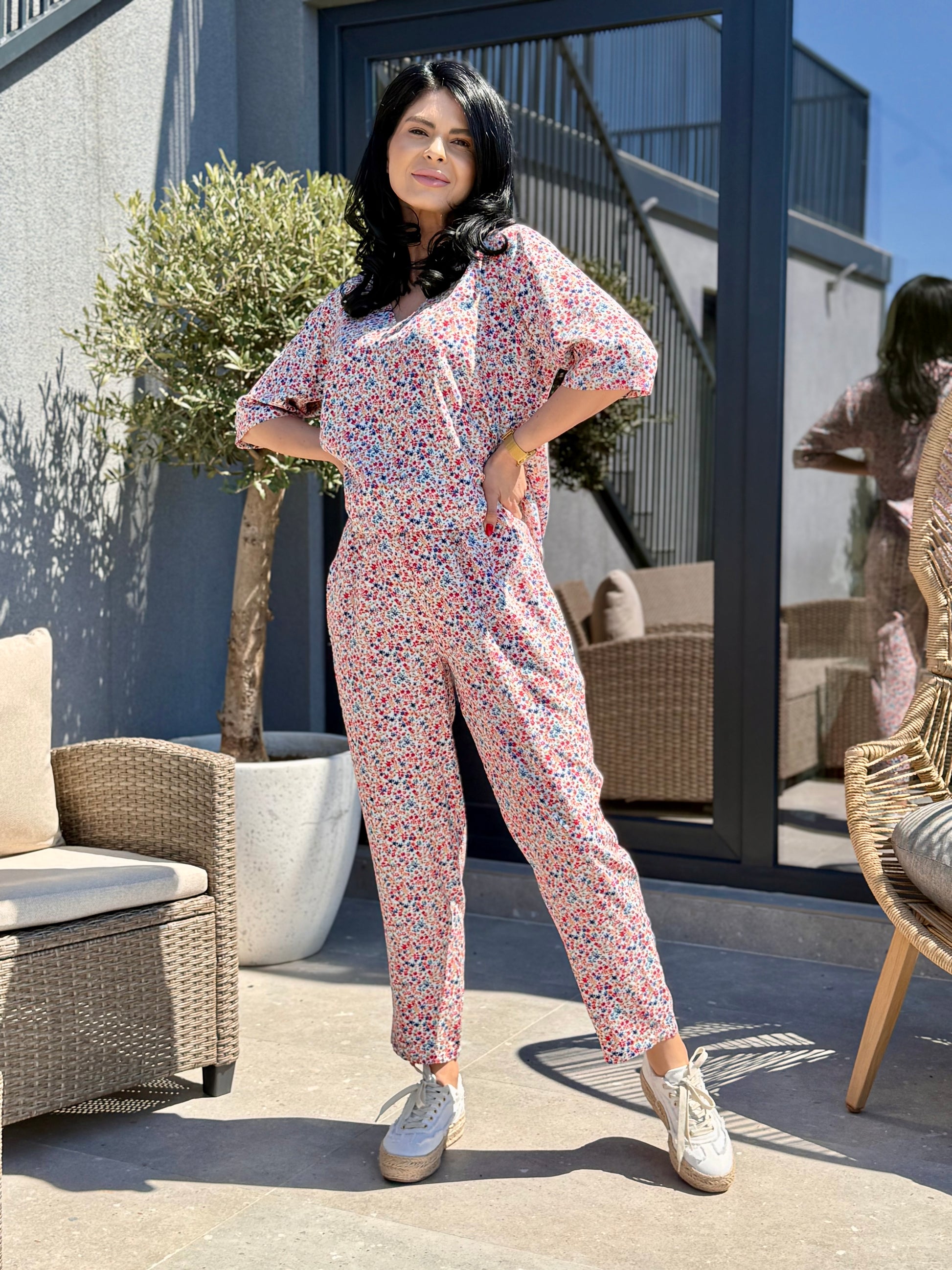 Un outfit lejer si modern, perfect pentru zilele in care vrei sa fii chic fara efort. Costumul din doua piese cu imprimeu grafic este realizat din material usor si fluid, ideal pentru sezonul cald. Bluza cu maneca scurta si croi lejer, impreuna cu pantalonii cu talie inalta, ofera libertate de miscare. Este versatil, poate fi purtat in orice moment al zilei.