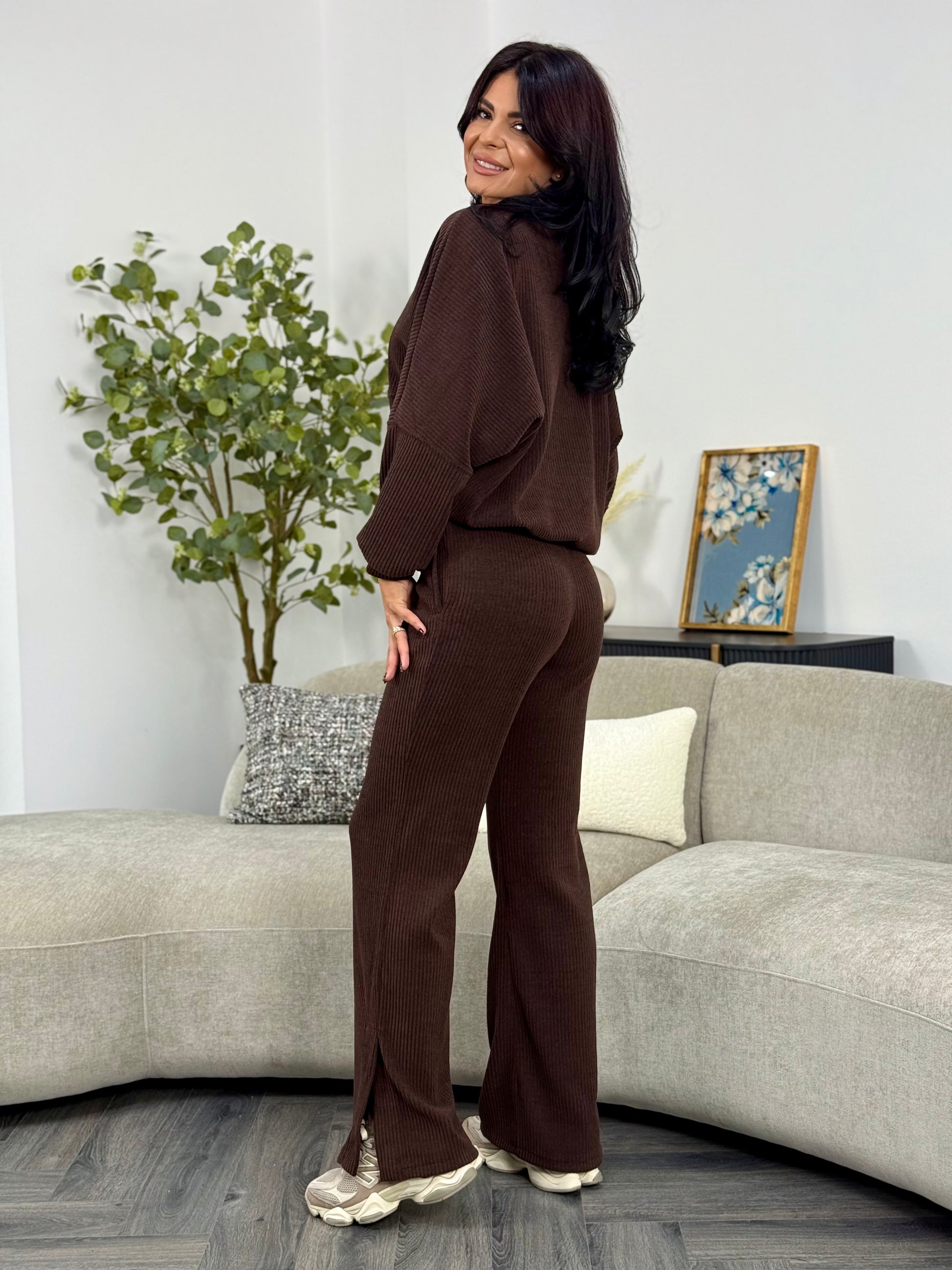 Costumul Karla este confectionat din catifea reiata si elastan. Un look rapid, iar piesele se pot purta impreuna sau separat.
