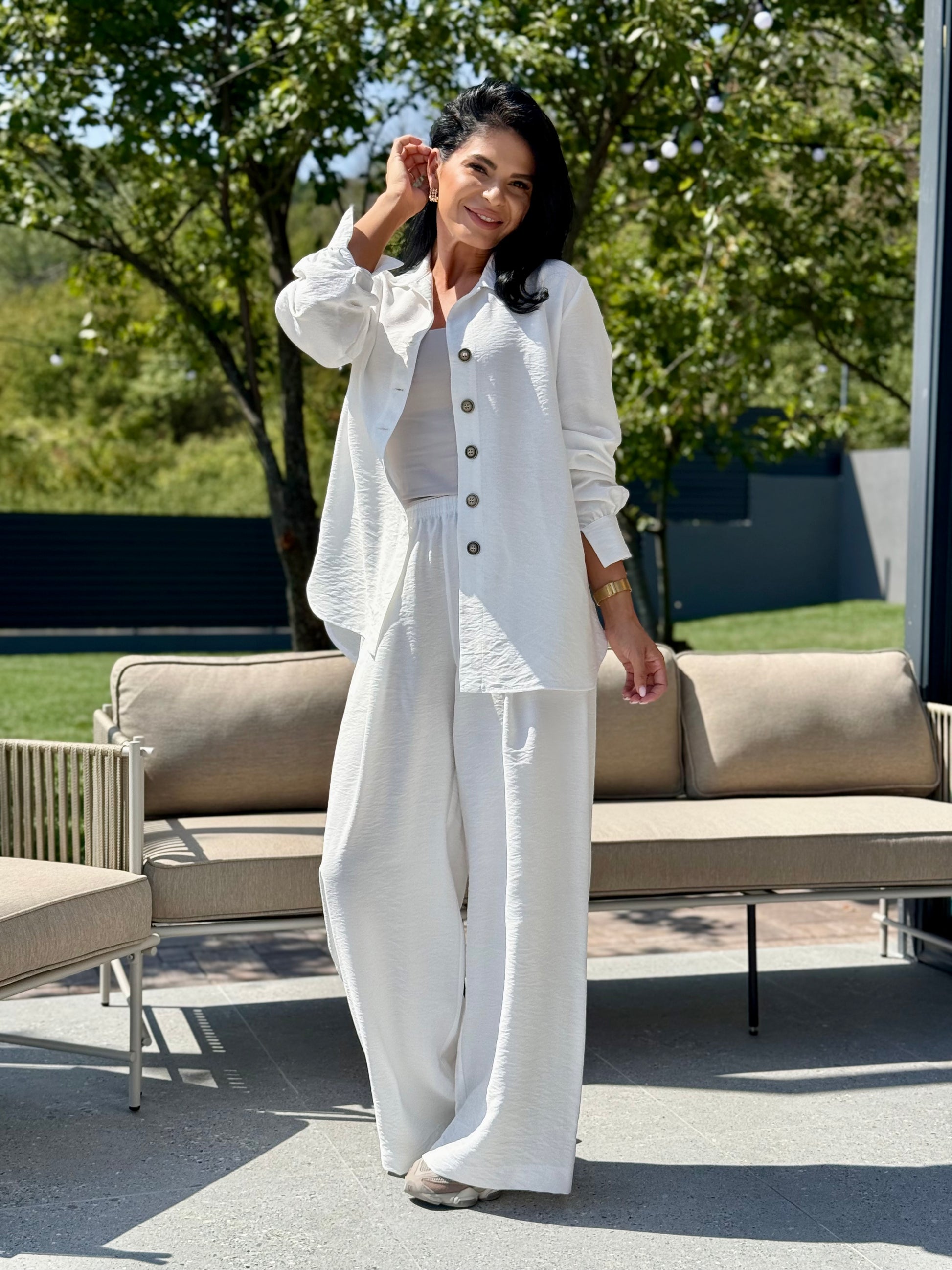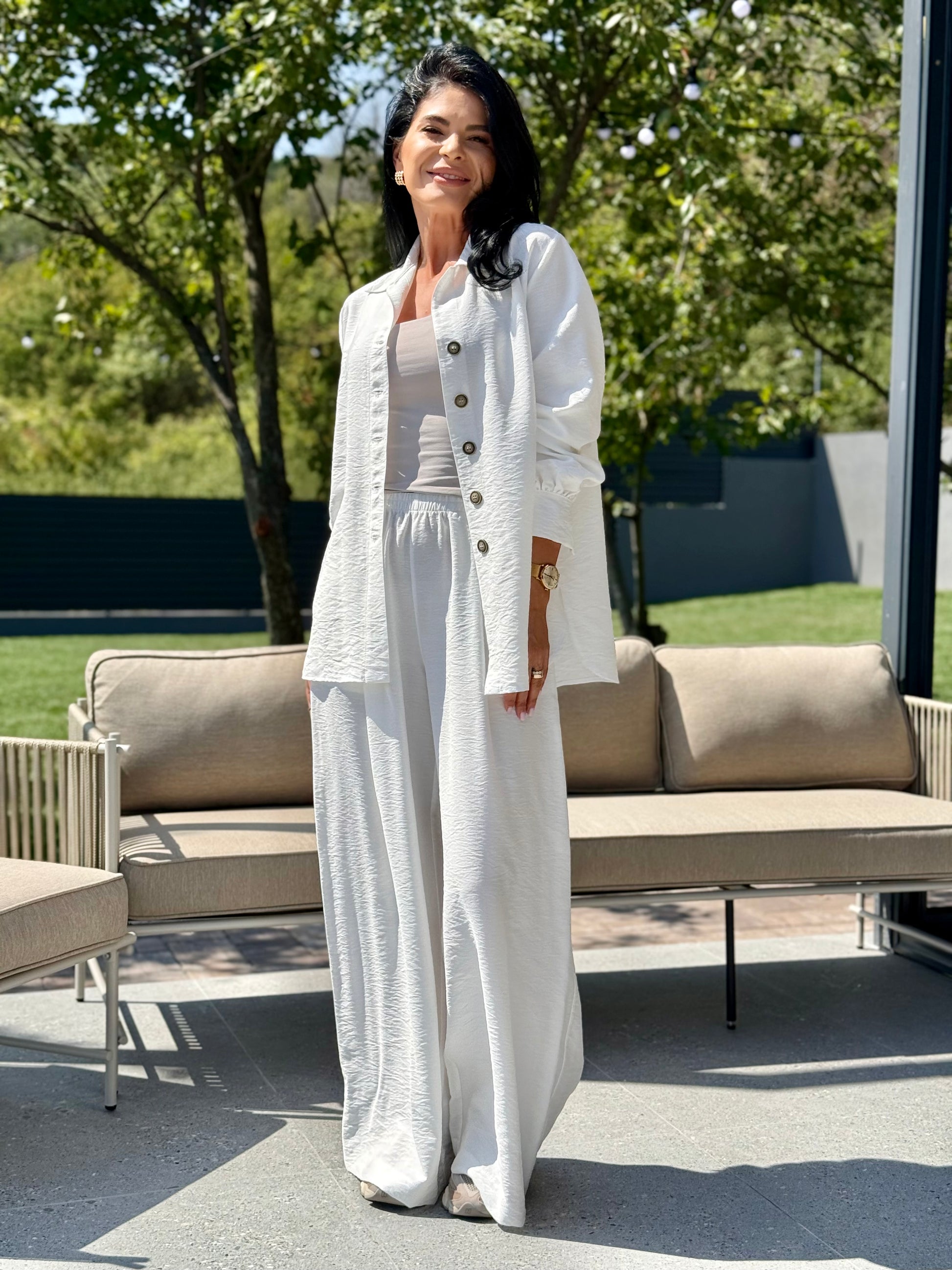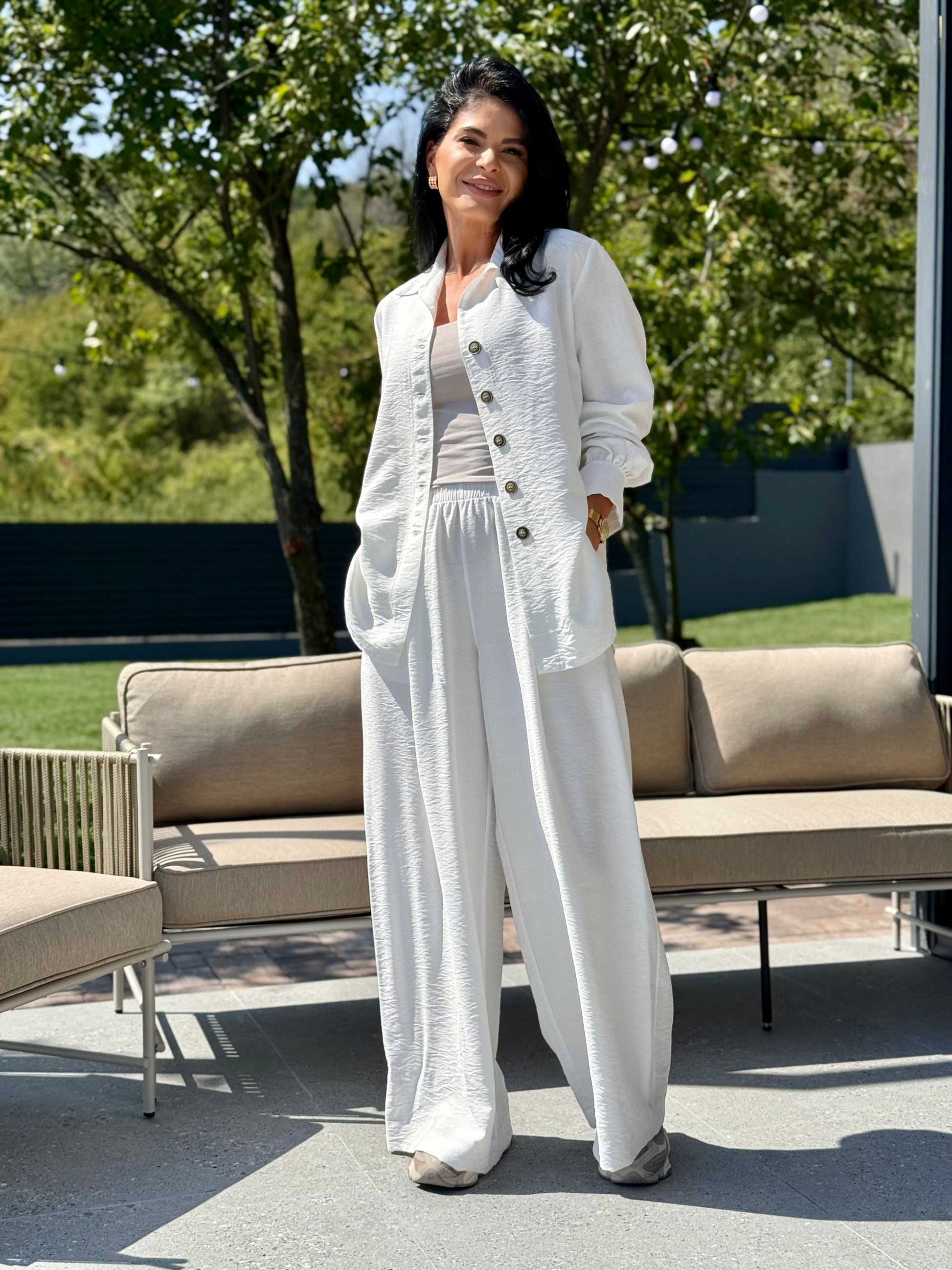 Un set cu detalii de tipar atent gandite, care imbina confortul cu eleganta casual. Realizat dintr-o tesatura fluida, cu textura subtila, impresioneaza prin croiala moderna si versatila. Camasa este lejera, guler clasic, inchidere frontala cu nasturi. Manecile pot fi purtate atat drepte, cat si rulate, pentru un look relaxat.