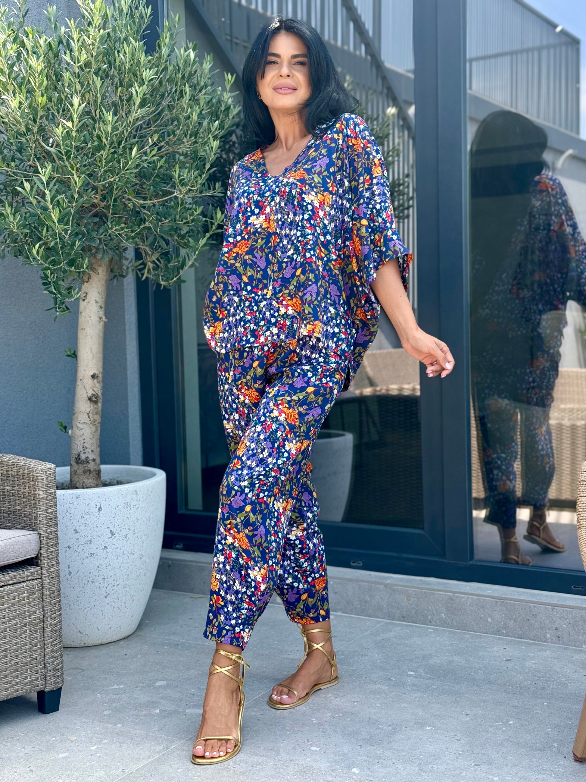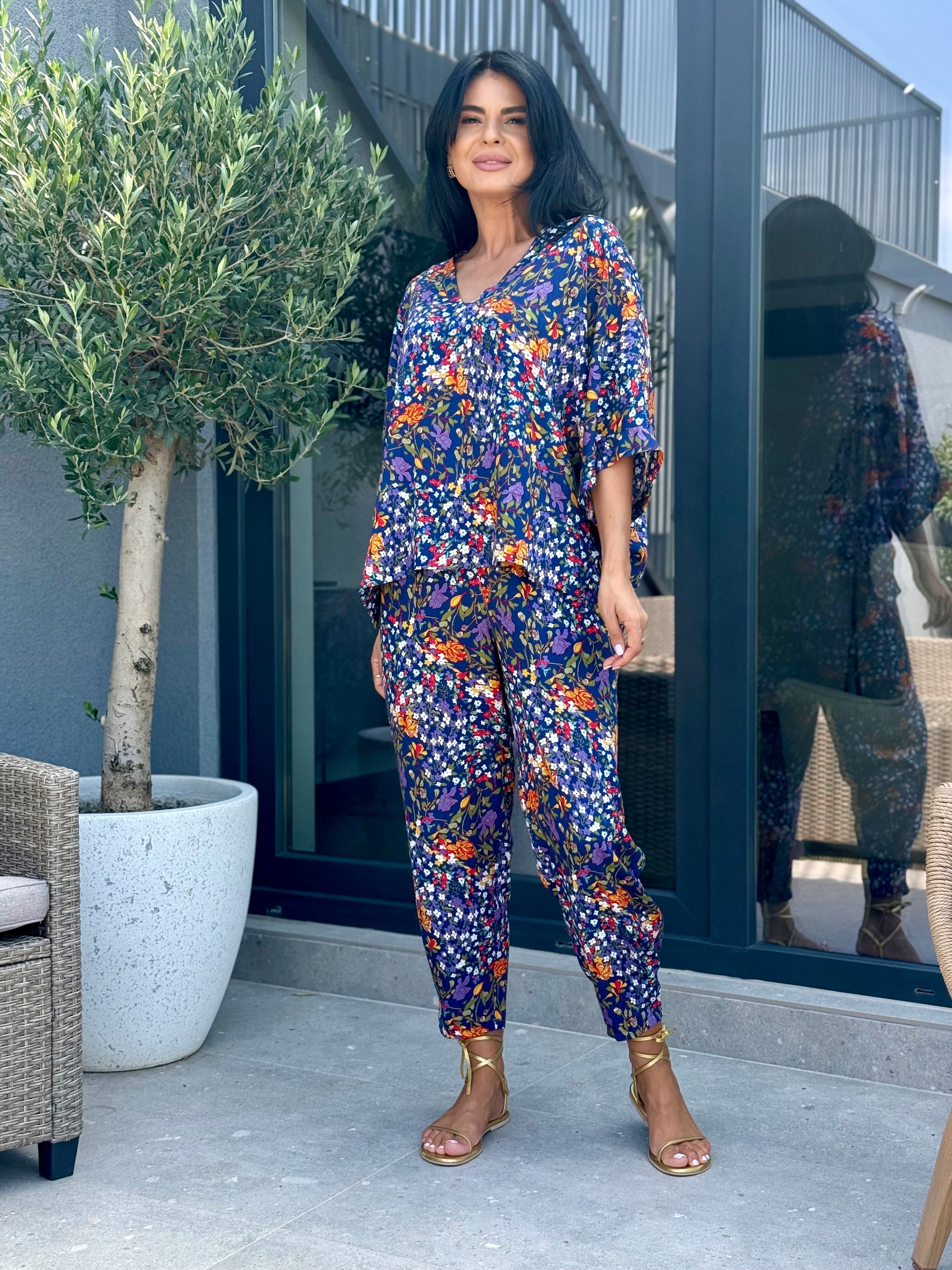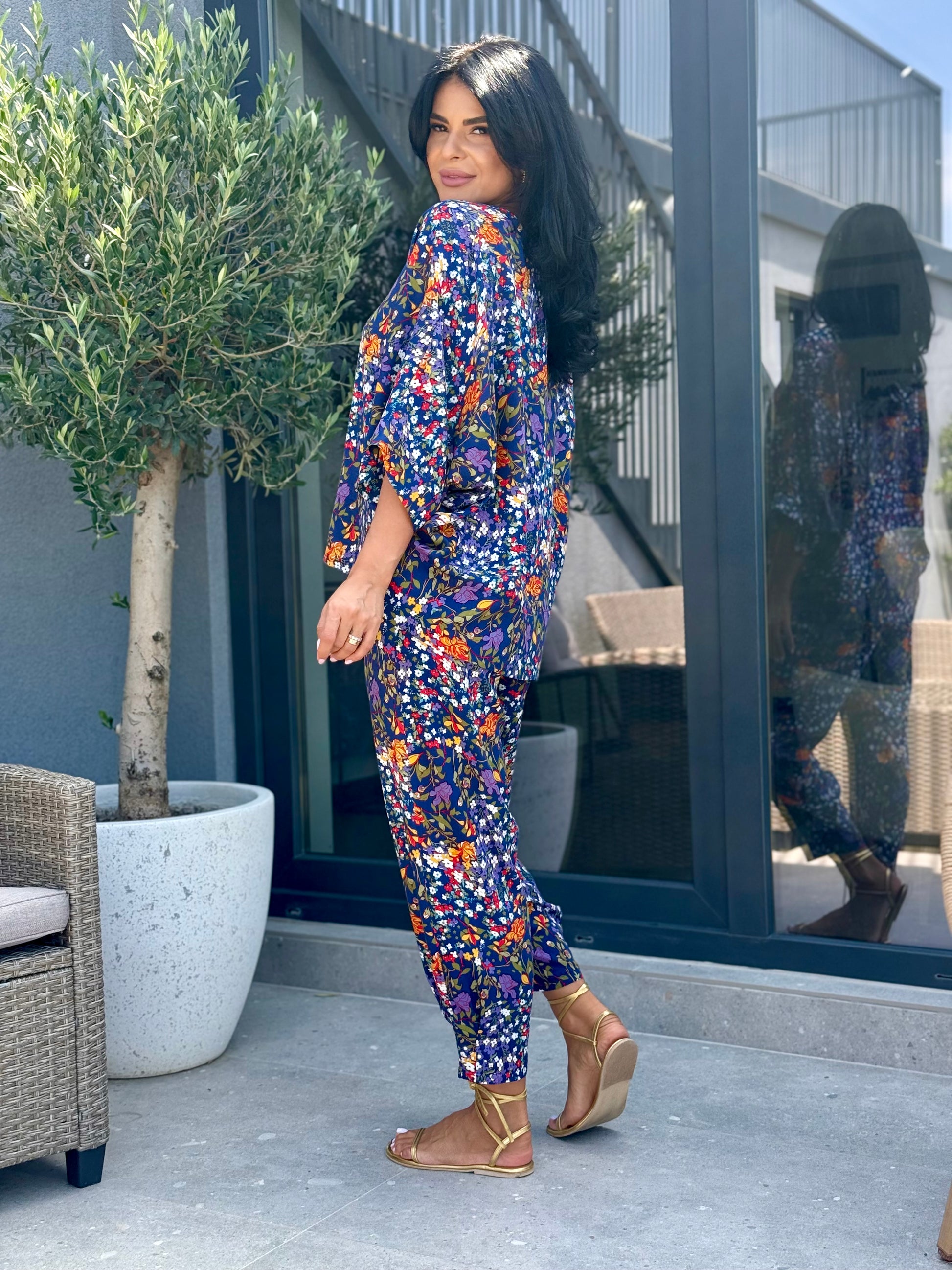 Un set comod și stilat, perfect pentru această perioada! Bluza are un croi lejer, cu mâneci ¾ tip fluture și decolteu în V, care flatează silueta și oferă libertate de mișcare. Pantalonii sunt ușor conici, cu talie elastică, ideali pentru un look casual, feminin.