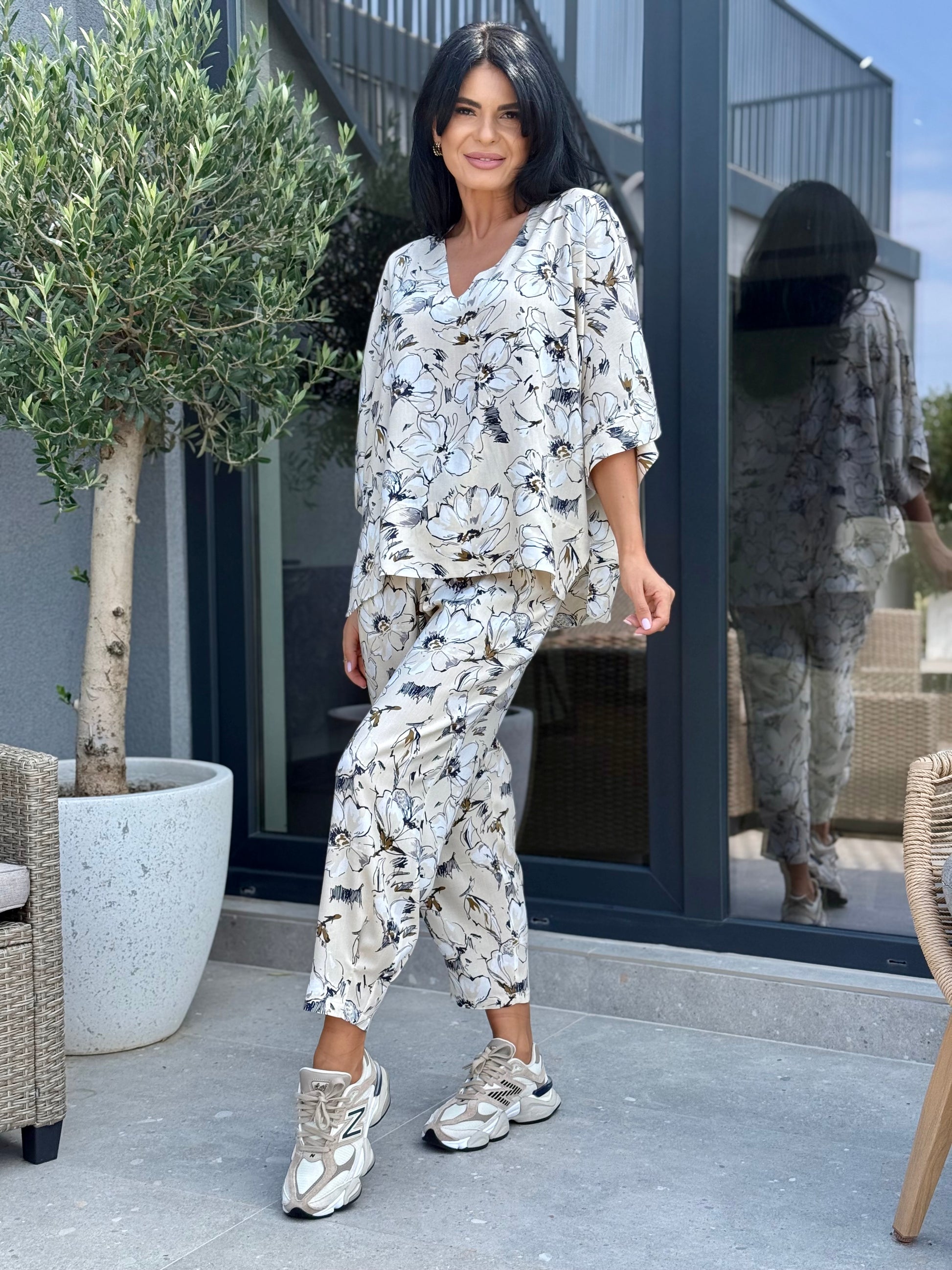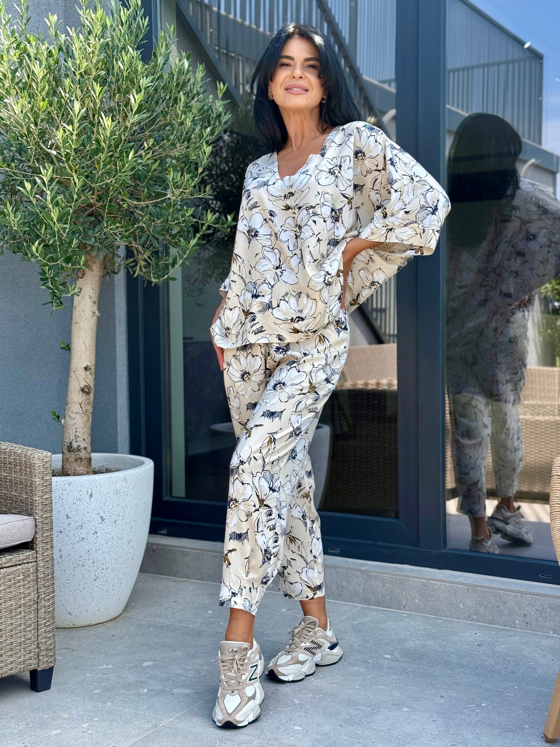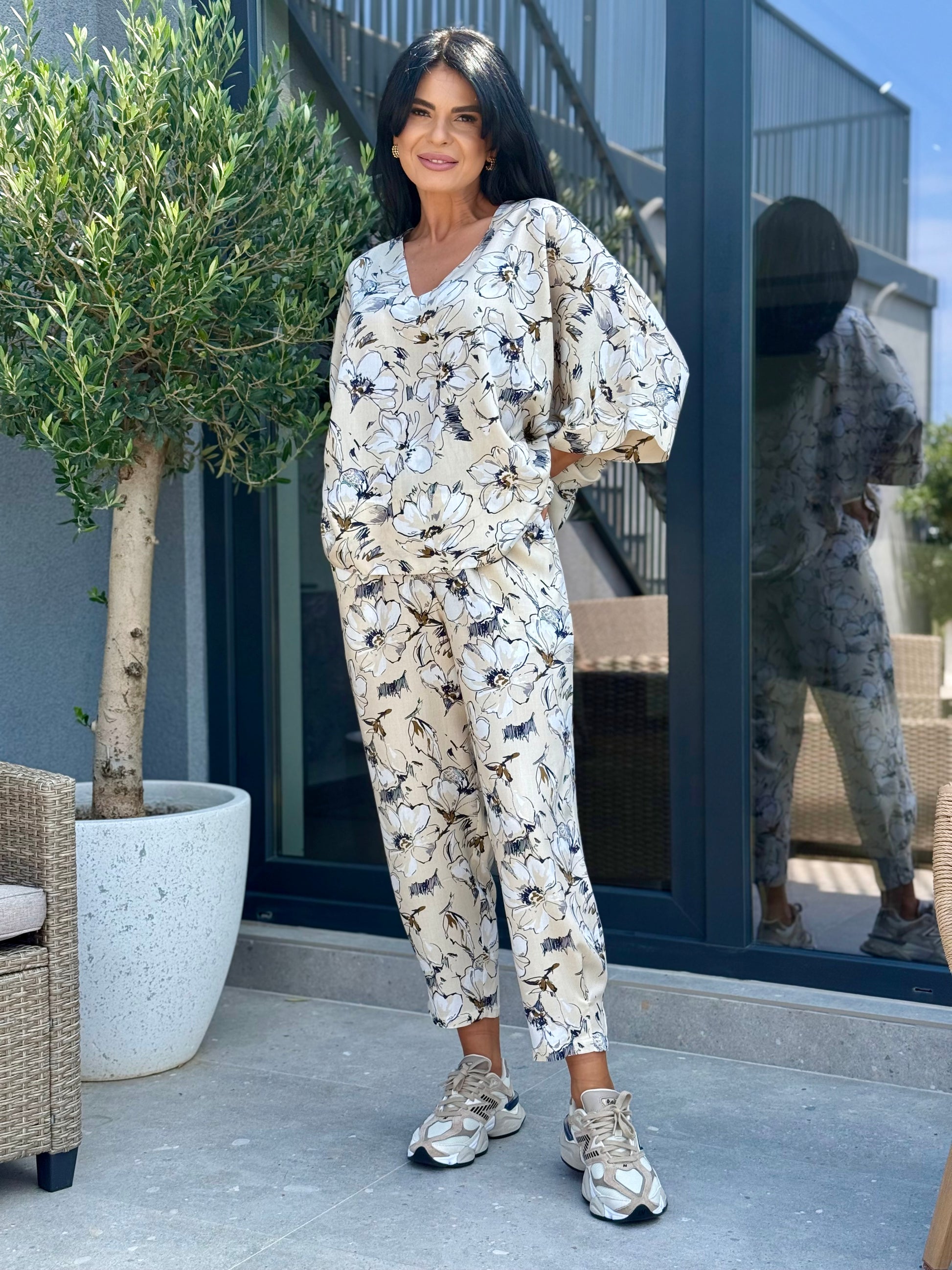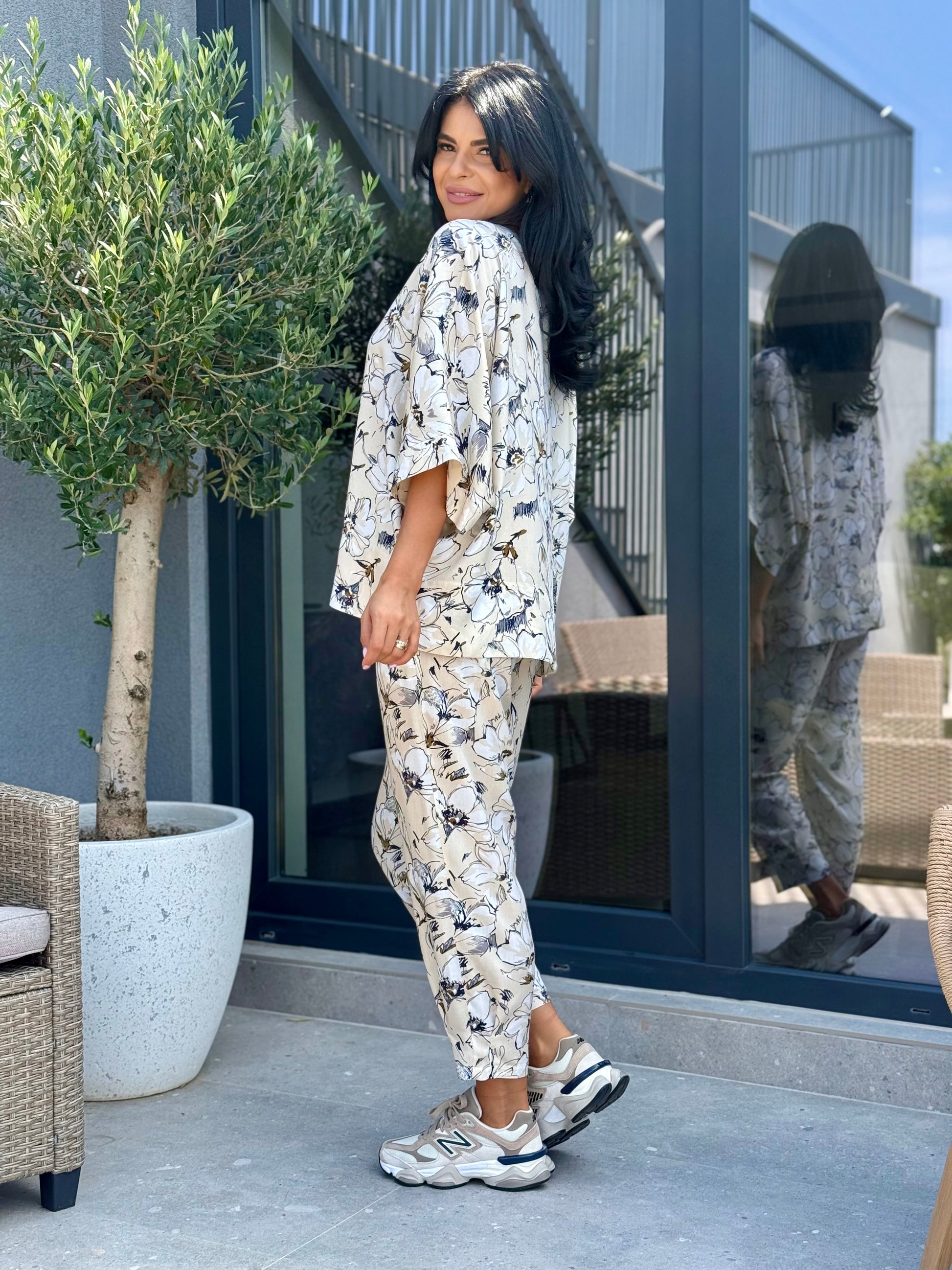 Un set comod și stilat, perfect pentru această perioada! Bluza are un croi lejer, cu mâneci ¾ tip fluture și decolteu în V, care flatează silueta și oferă libertate de mișcare. Pantalonii sunt ușor conici, cu talie elastică, ideali pentru un look casual, feminin.