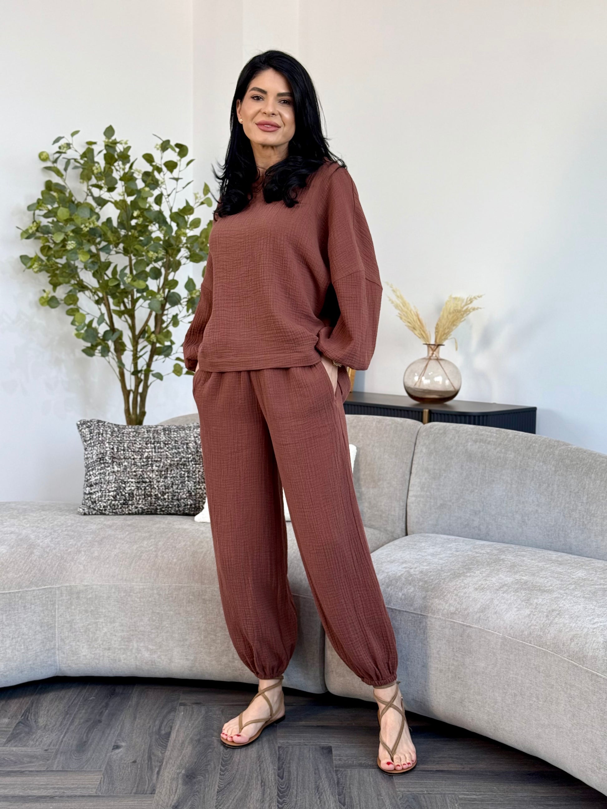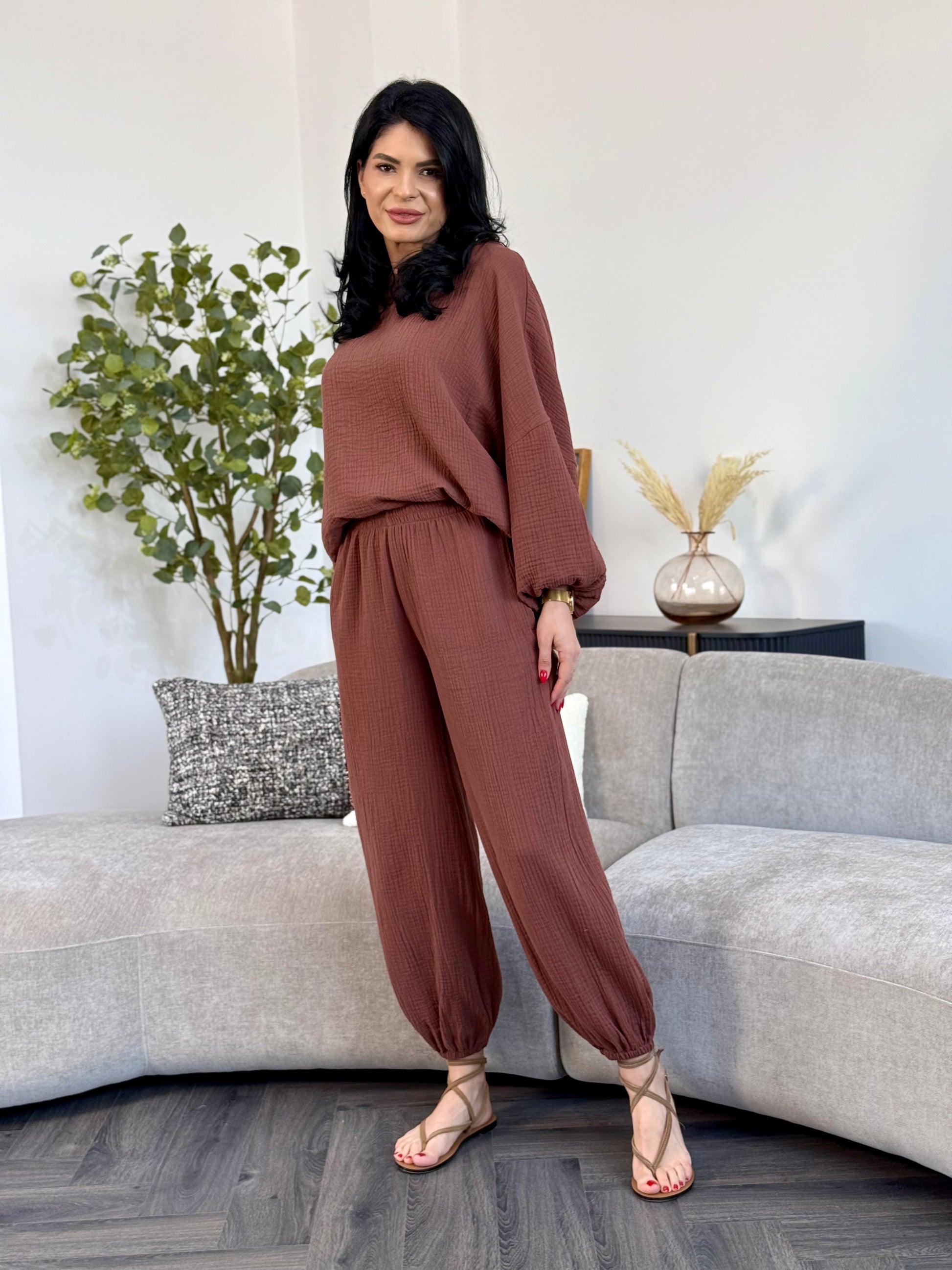 Un outfit relaxat, modern si extrem de placut la purtare. Costumul este realizat din muselina din bumbac 100%, un material natural, moale si respirabil, ideal pentru sezonul cald. Bluza are o croiala lejera, maneci lungi bufante si mansete elastice, iar pantalonii au talie elastica si terminatii cu elastic la glezna, oferind libertate de miscare si un look fresh.