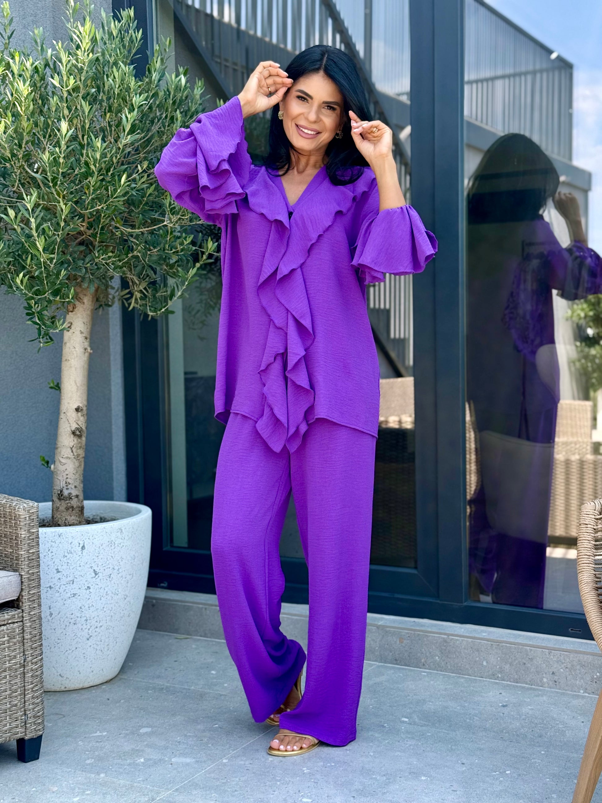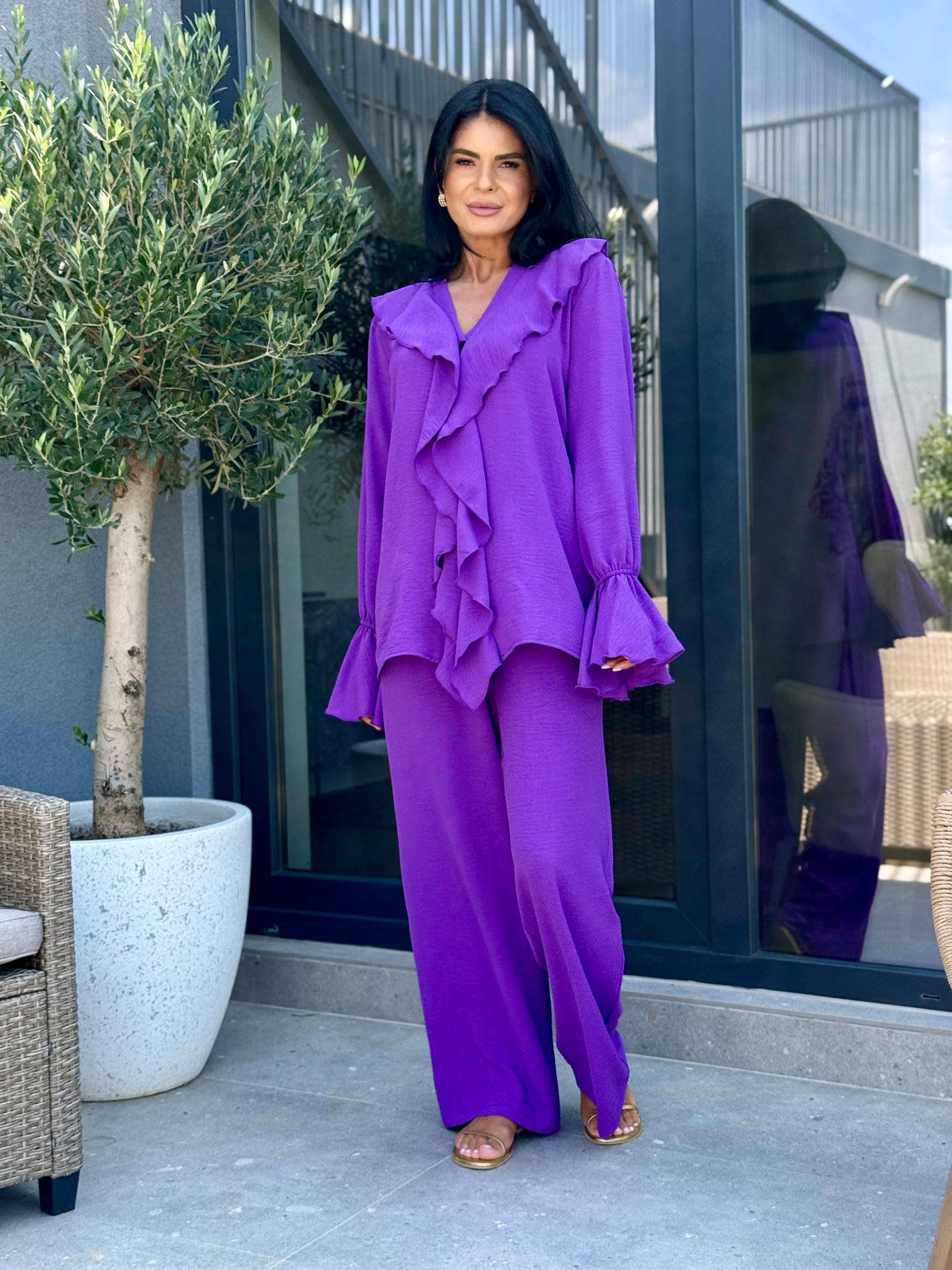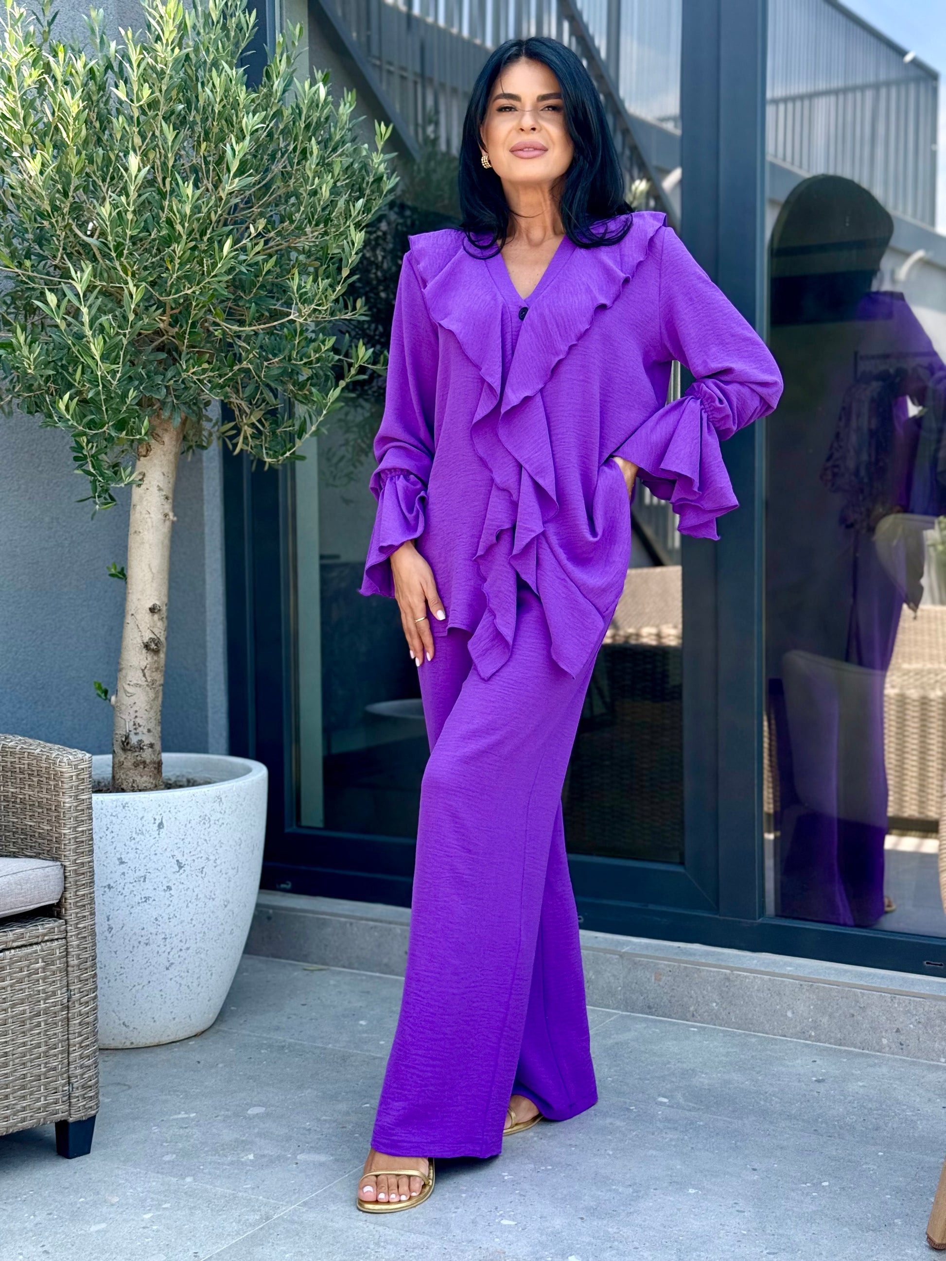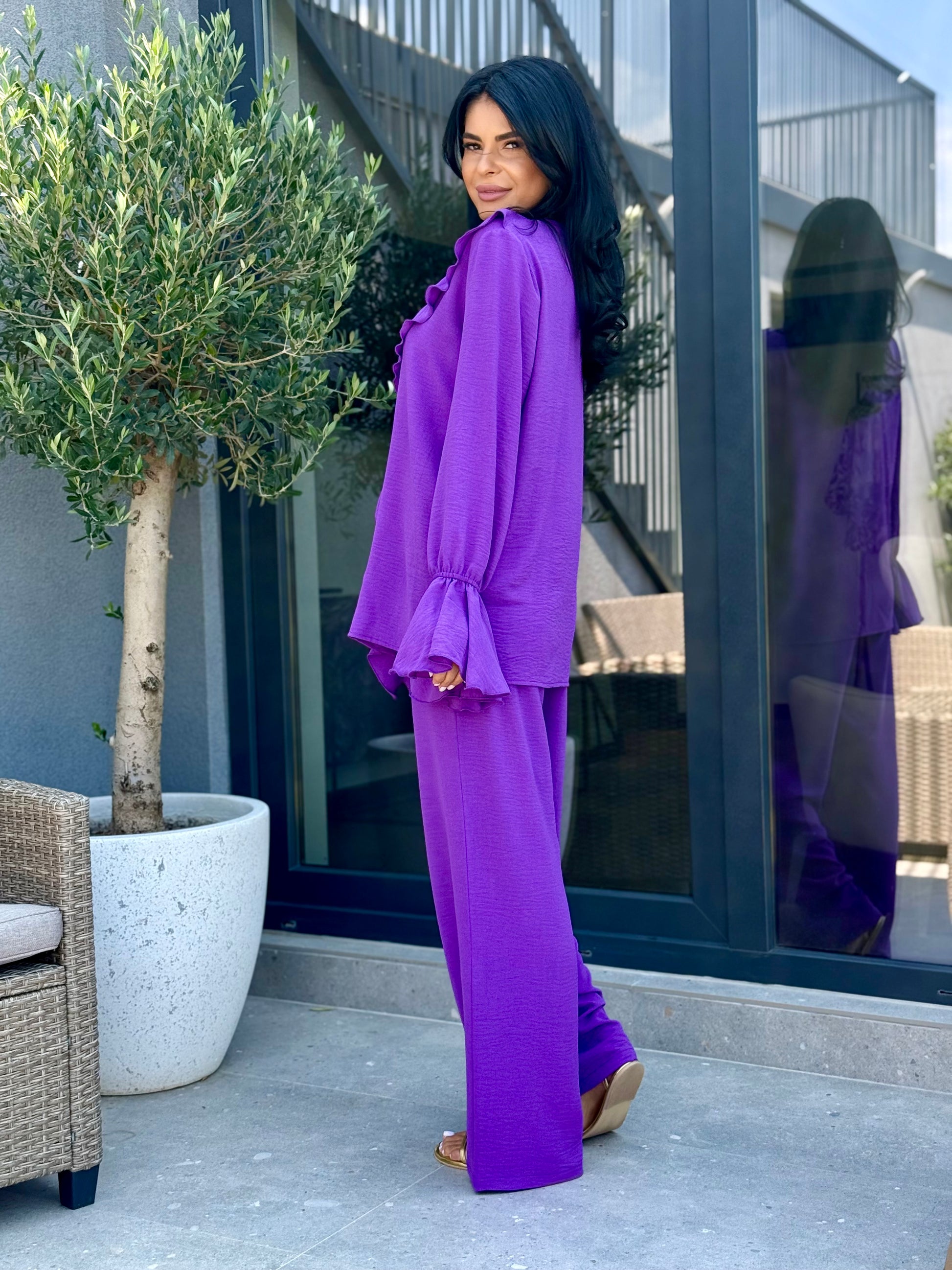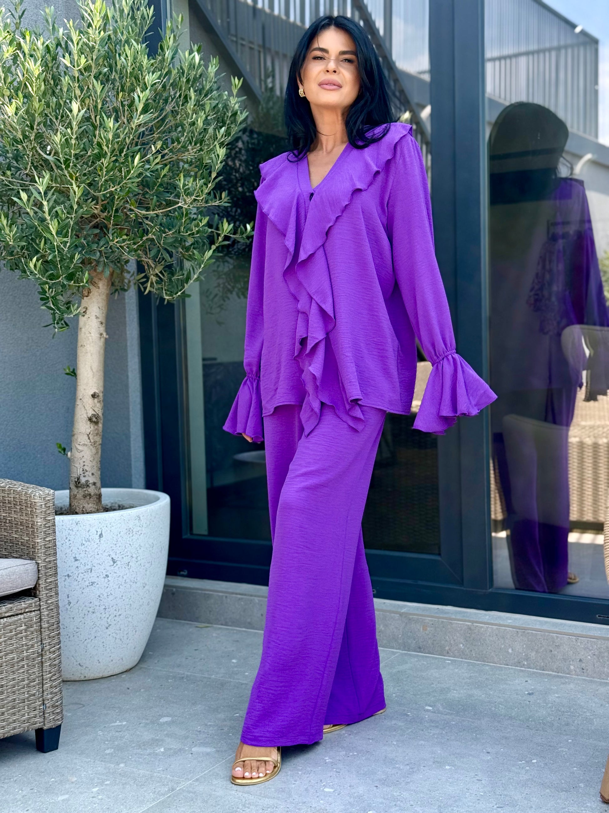 Set elegant din două piese, realizat dintr-un material lejer și plăcut la atingere. Bluza are un croi amplu, cu volane spectaculoase aplicate în față și la mâneci, adăugând o notă feminină și rafinată. Pantalonii au un croi drept, lejer, cu talie elastică, oferind confort și libertate de mișcare. Ținuta este ideală pentru zilele în care vrei să arăți bine fără efort – perfectă atât pentru evenimente de zi, cât și pentru ieșiri casual cu stil.