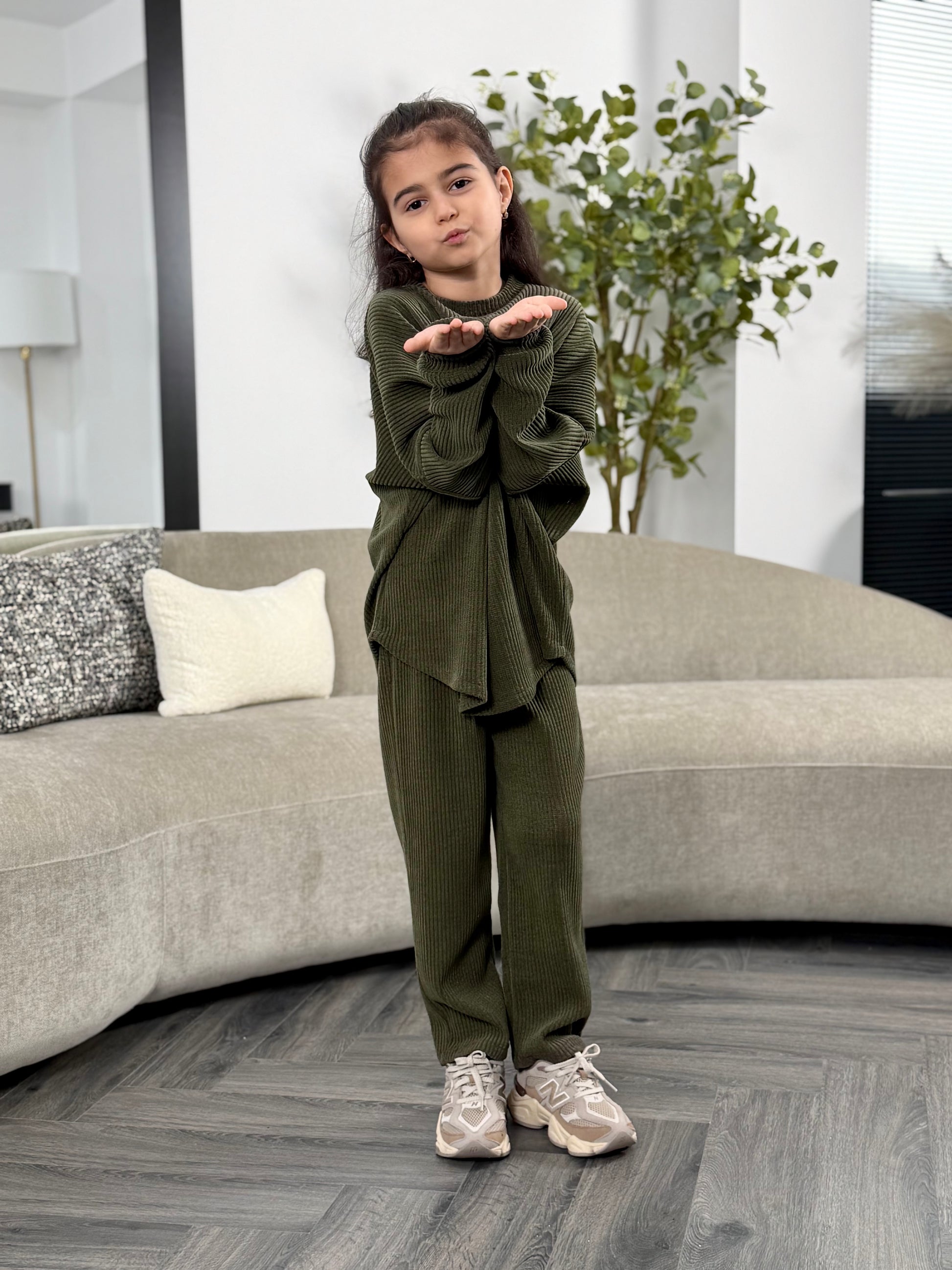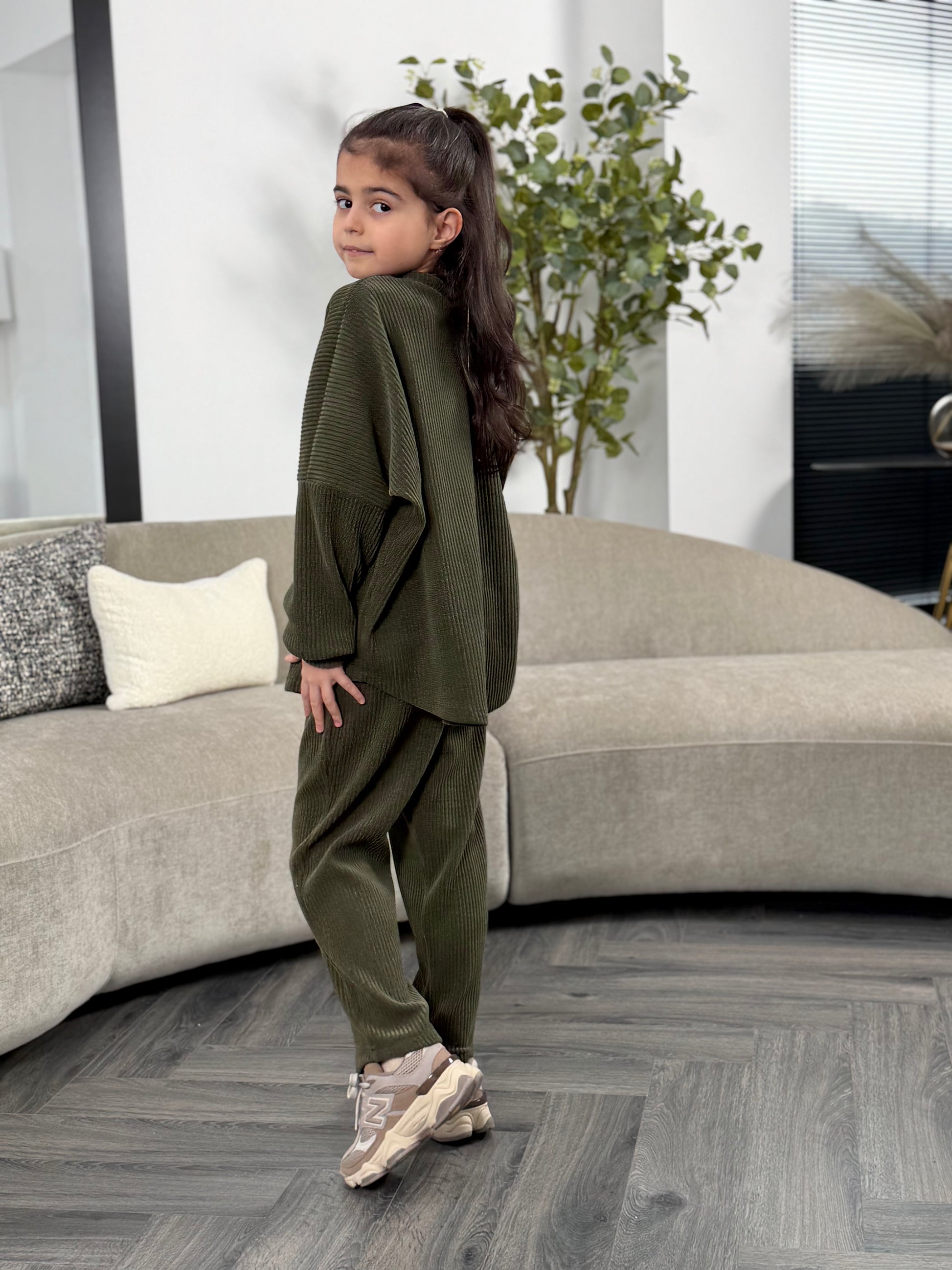 Acest costum pentru fetite este realizat din catifea reiata, moale si placuta la atingere, ofera libertate de miscare, ideal pentru sezonul rece. Design modern, croiala lejera, potrivit pentru purtarea de zi cu zi si nu numai. Un outfit cool.