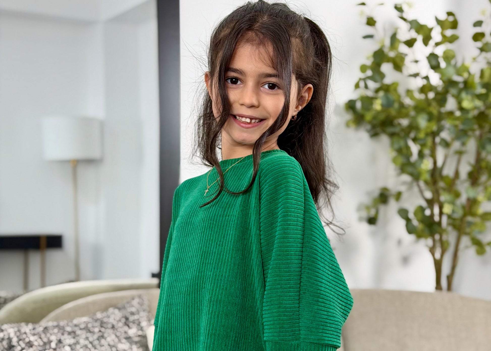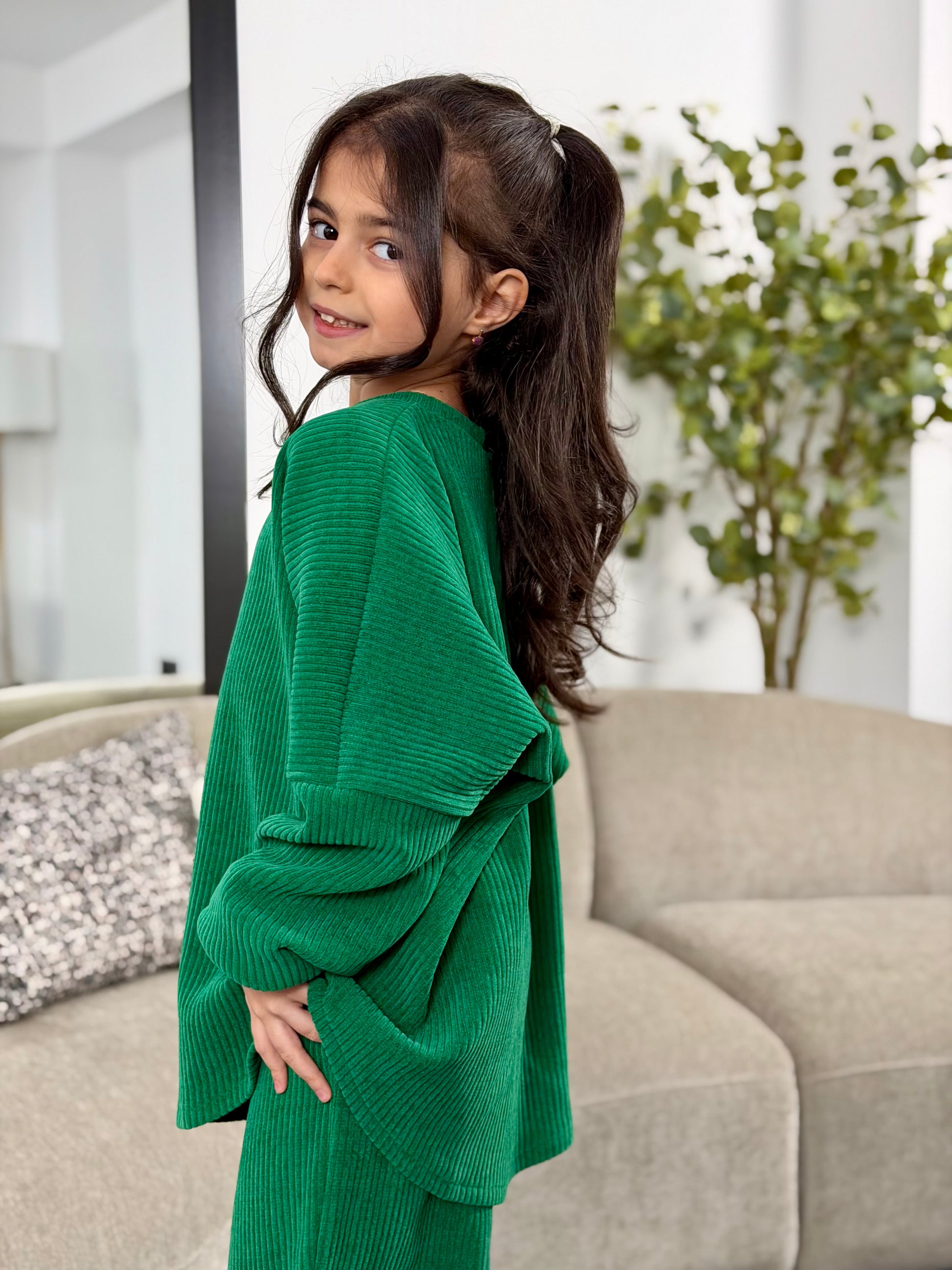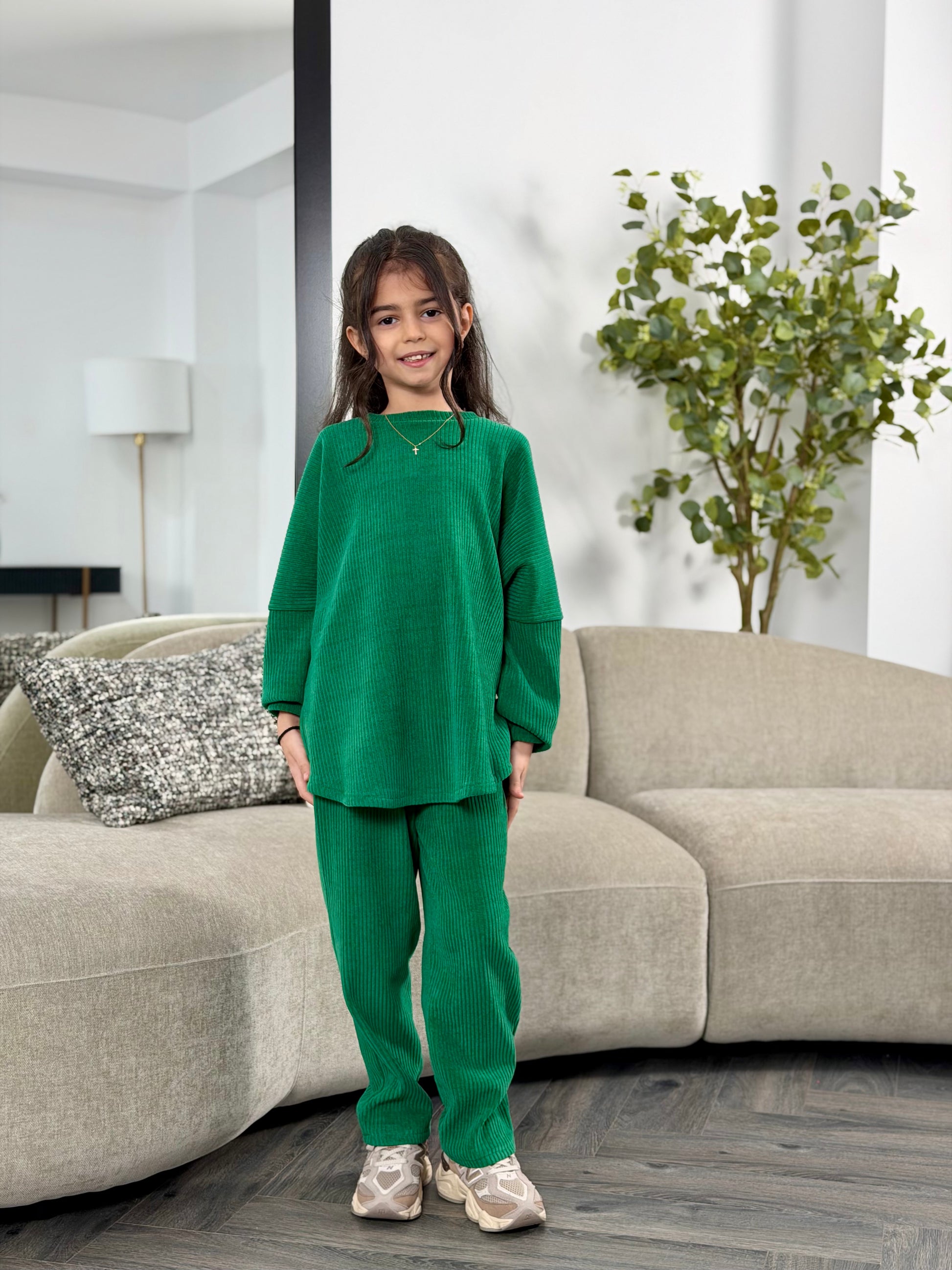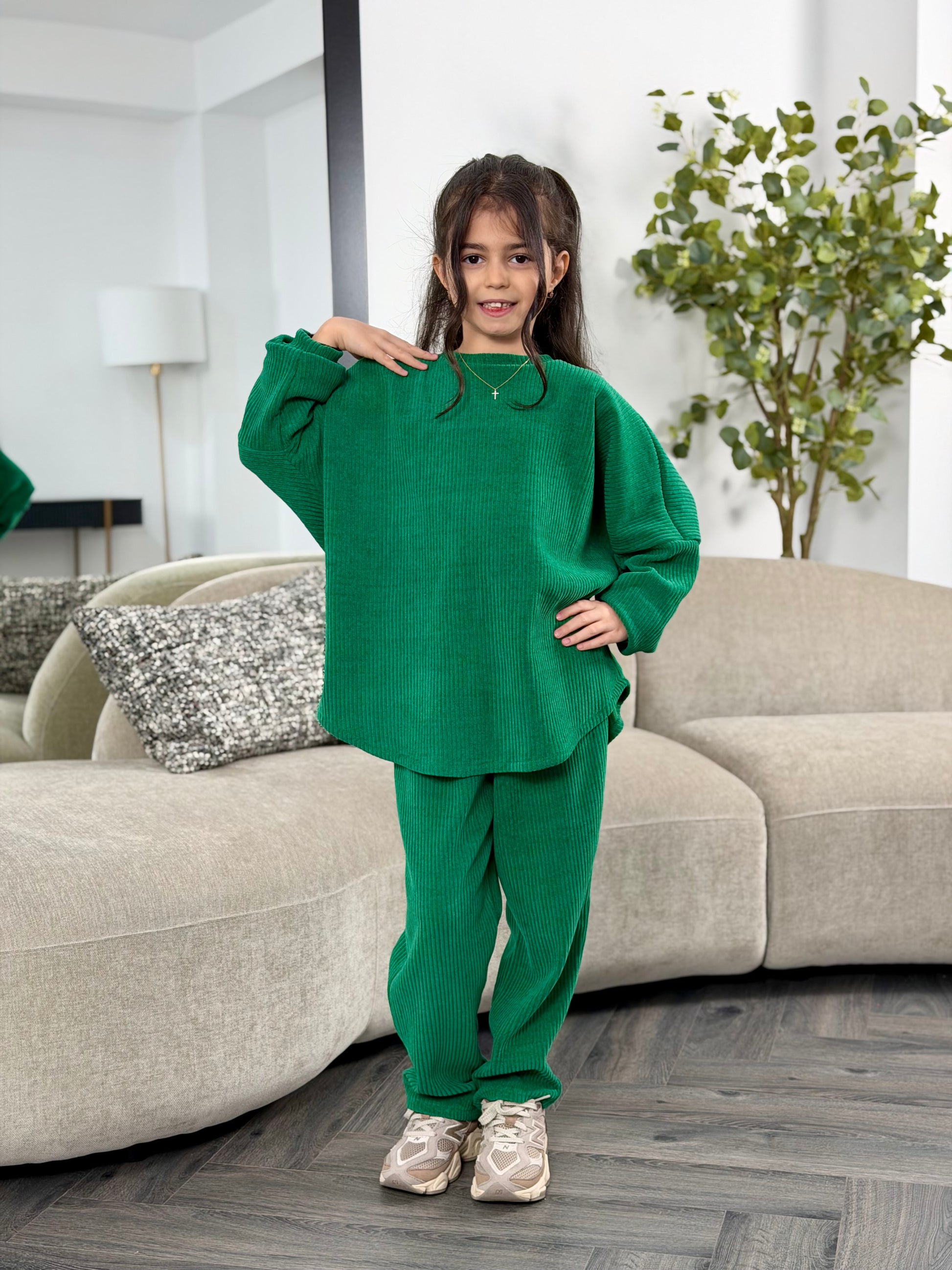 Acest costum pentru fetite este realizat din catifea reiata, moale si placuta la atingere, ofera libertate de miscare, ideal pentru sezonul rece. Design modern, croiala lejera, potrivit pentru purtarea de zi cu zi si nu numai. Un outfit cool.