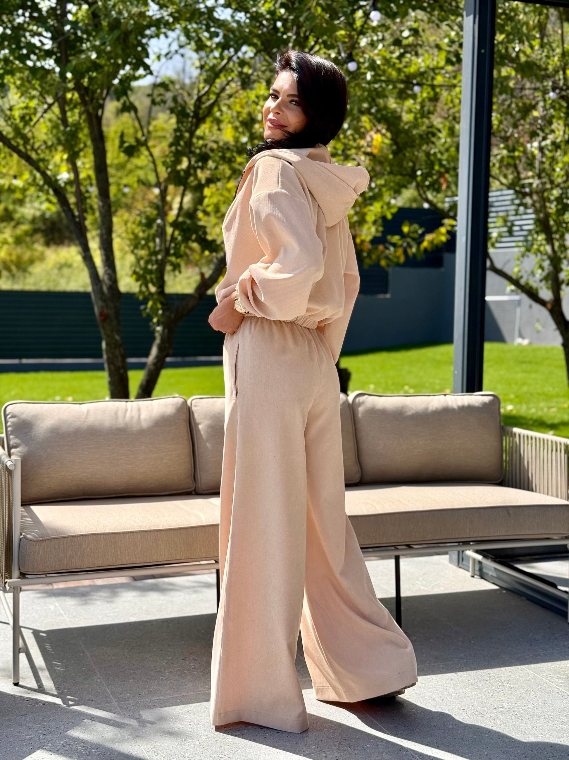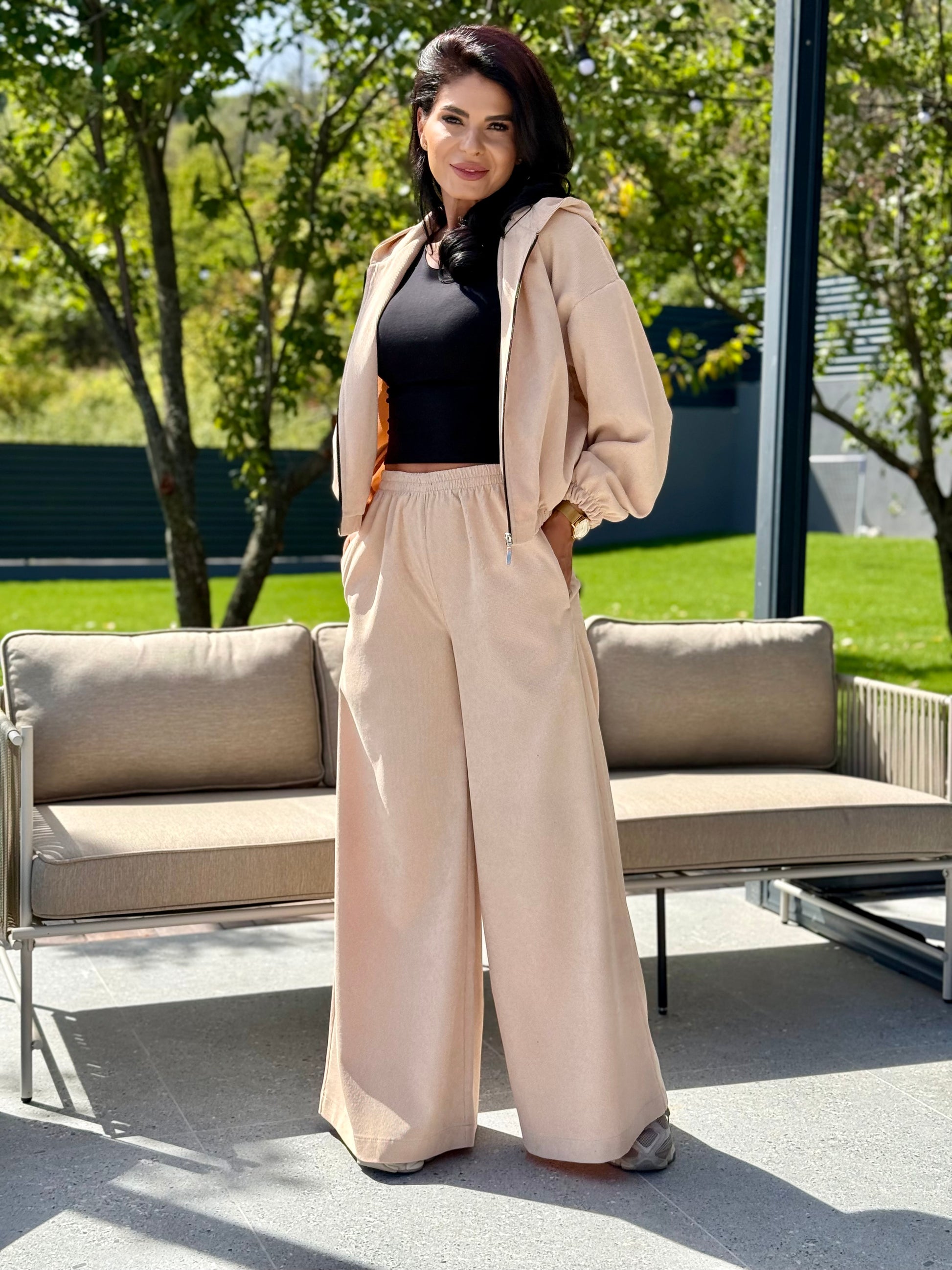 Set modern si versatil, realizat din velur catifea cu textura moale si placuta la atingere. Jacheta are croiala lejera, cu gluga practica si inchidere frontala cu fermoar, mansete elastice si talie usor stransa pentru un plus de stil si confort. Pantalonii au croi amplu, tip palazzo, cu talie inalta, elastica si buzunare.