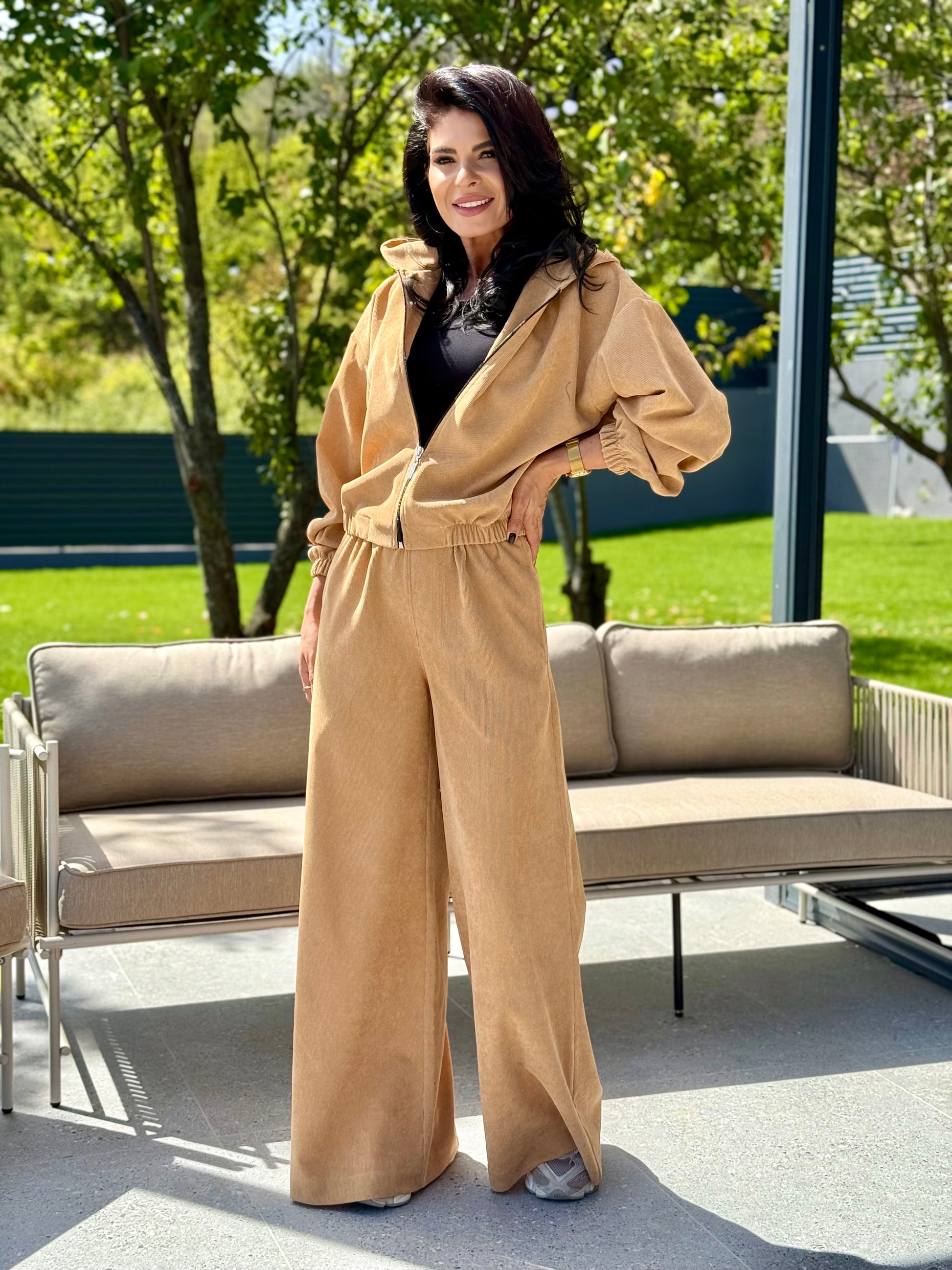 Set modern si versatil, realizat din velur catifea cu textura moale si placuta la atingere. Jacheta are croiala lejera, cu gluga practica si inchidere frontala cu fermoar, mansete elastice si talie usor stransa pentru un plus de stil si confort. Pantalonii au croi amplu, tip palazzo, cu talie inalta, elastica si buzunare.