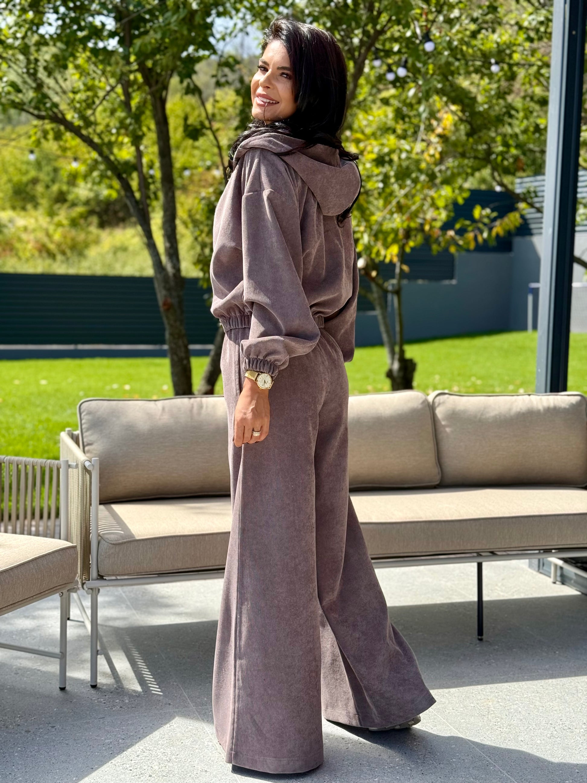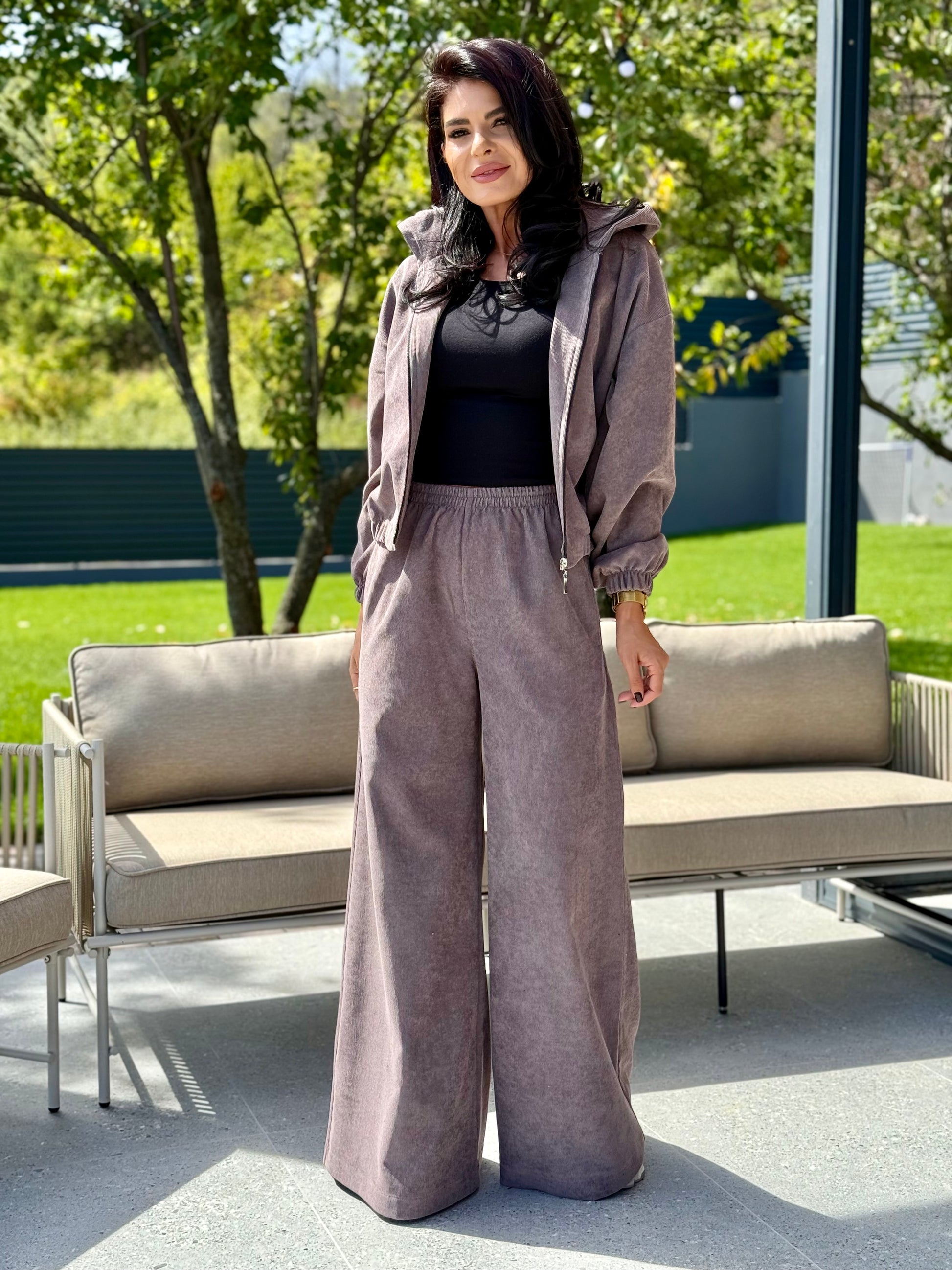 Set modern si versatil, realizat din velur catifea cu textura moale si placuta la atingere. Jacheta are croiala lejera, cu gluga practica si inchidere frontala cu fermoar, mansete elastice si talie usor stransa pentru un plus de stil si confort. Pantalonii au croi amplu, tip palazzo, cu talie inalta, elastica si buzunare.
