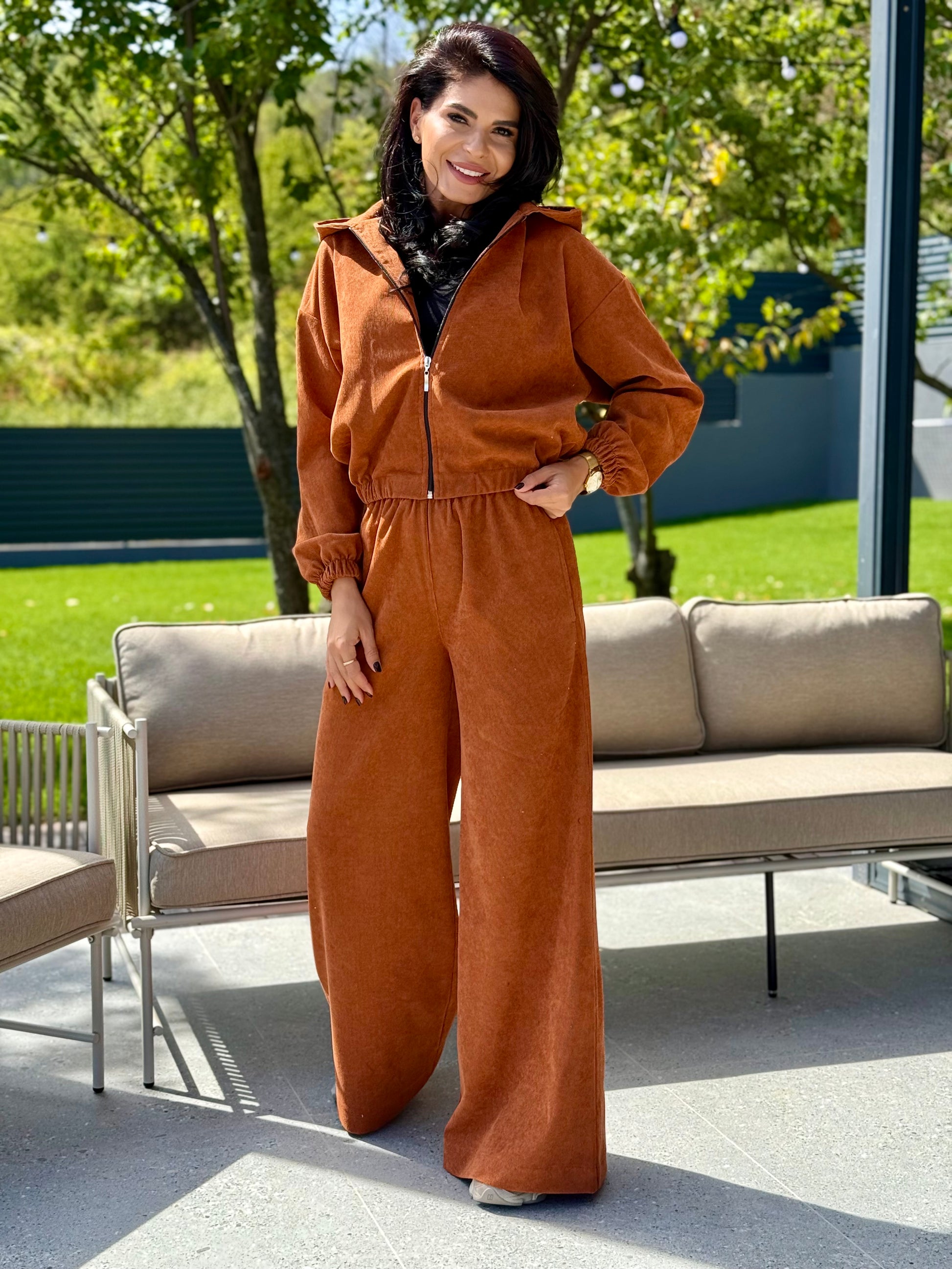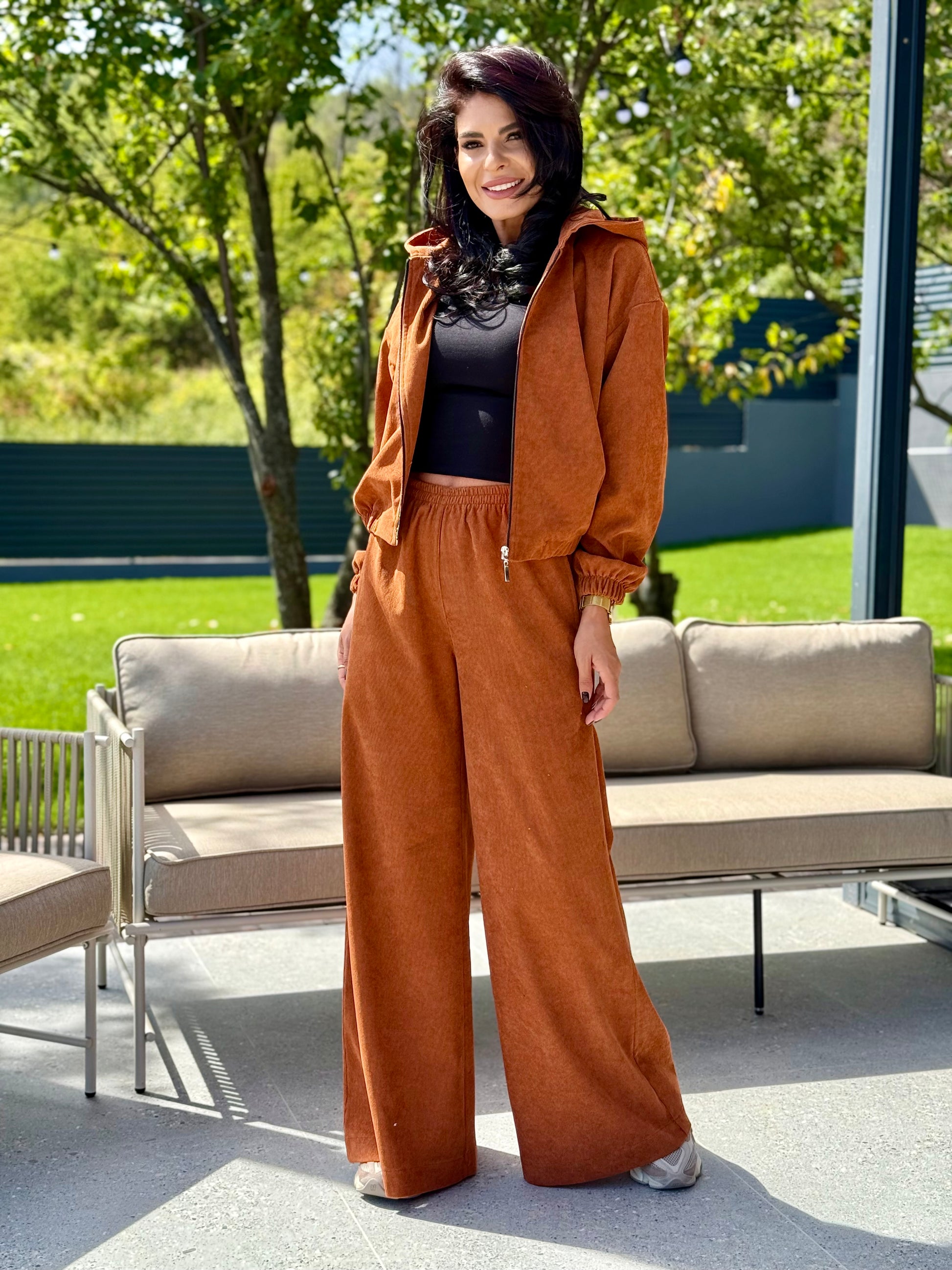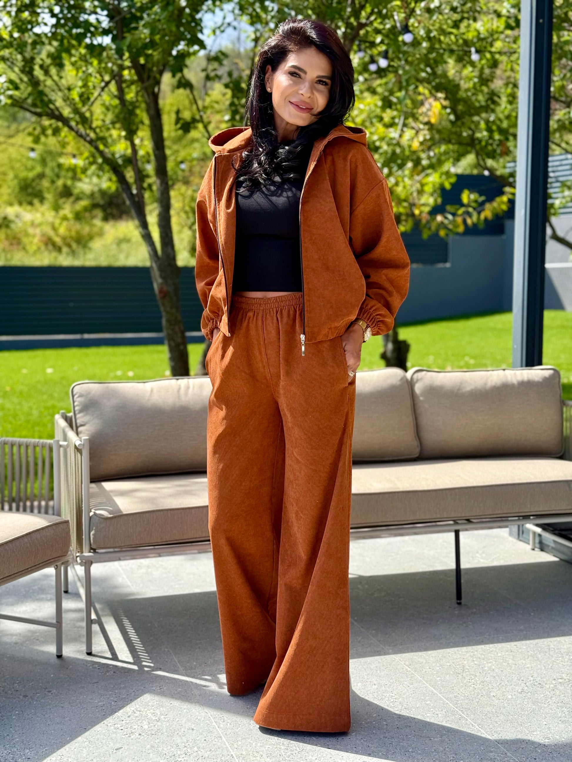 Set modern si versatil, realizat din velur catifea cu textura moale si placuta la atingere. Jacheta are croiala lejera, cu gluga practica si inchidere frontala cu fermoar, mansete elastice si talie usor stransa pentru un plus de stil si confort. Pantalonii au croi amplu, tip palazzo, cu talie inalta, elastica si buzunare.