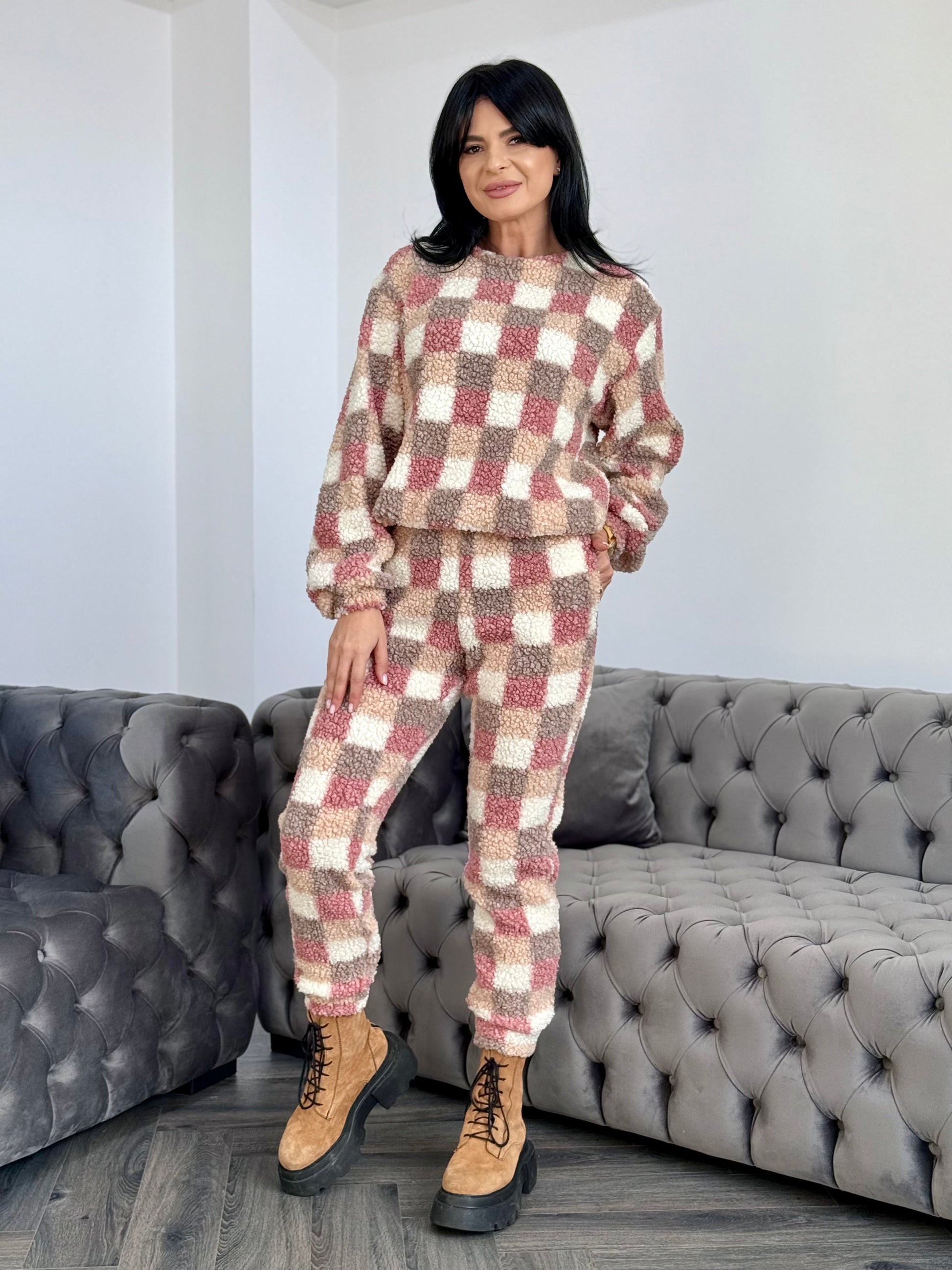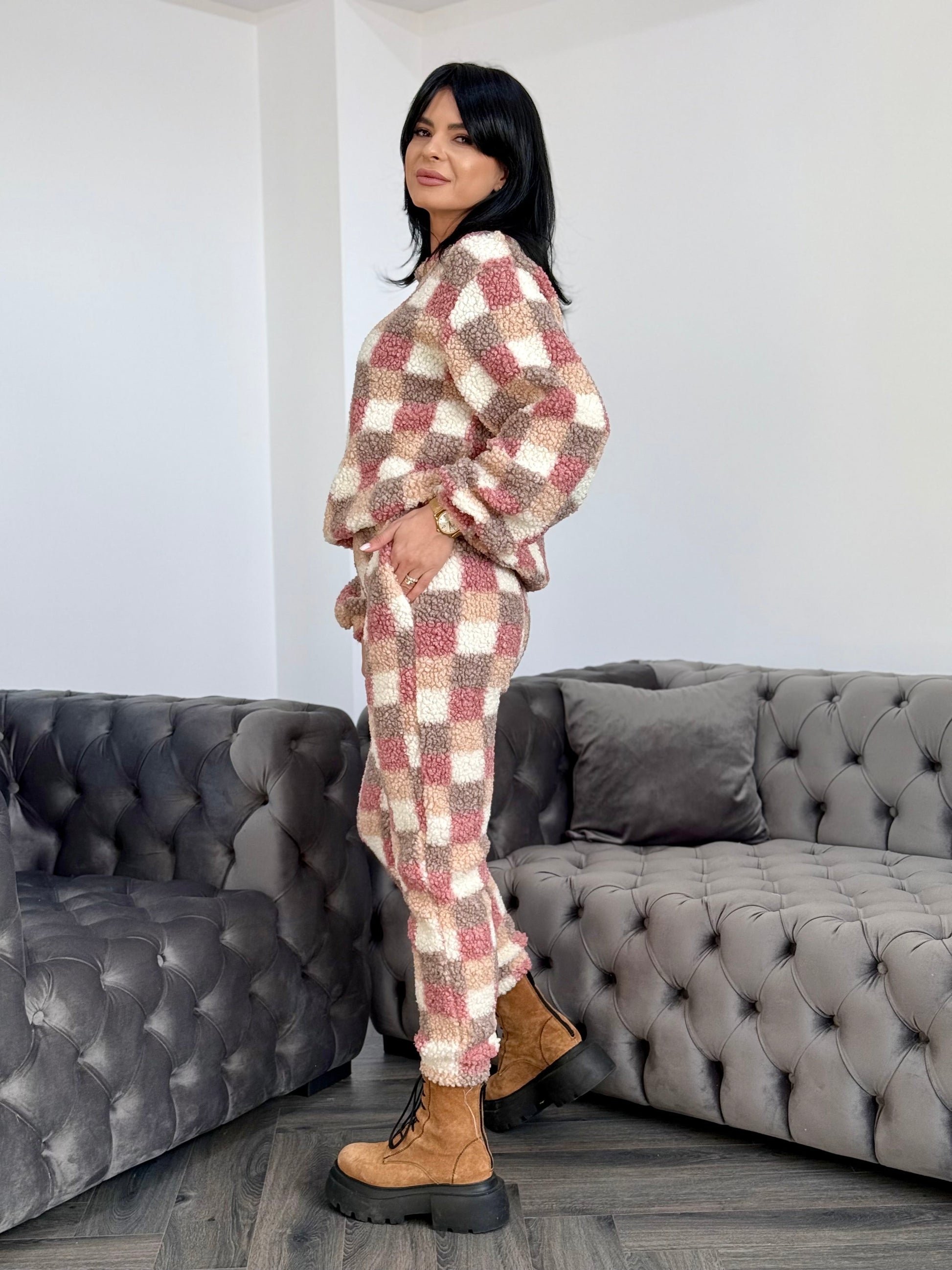 Un set cozy si modern, realizat dintr-o tesatura plush moale si pufoasa, placuta la atingere si ideala pentru sezonul rece. Bluza are croiala lejera, cu maneci usor bufante si mansete la terminatie, oferind un aer relaxat si feminin. Pantalonii au talie elastica si croi conic, pentru un plus de confort si o silueta echilibrata.