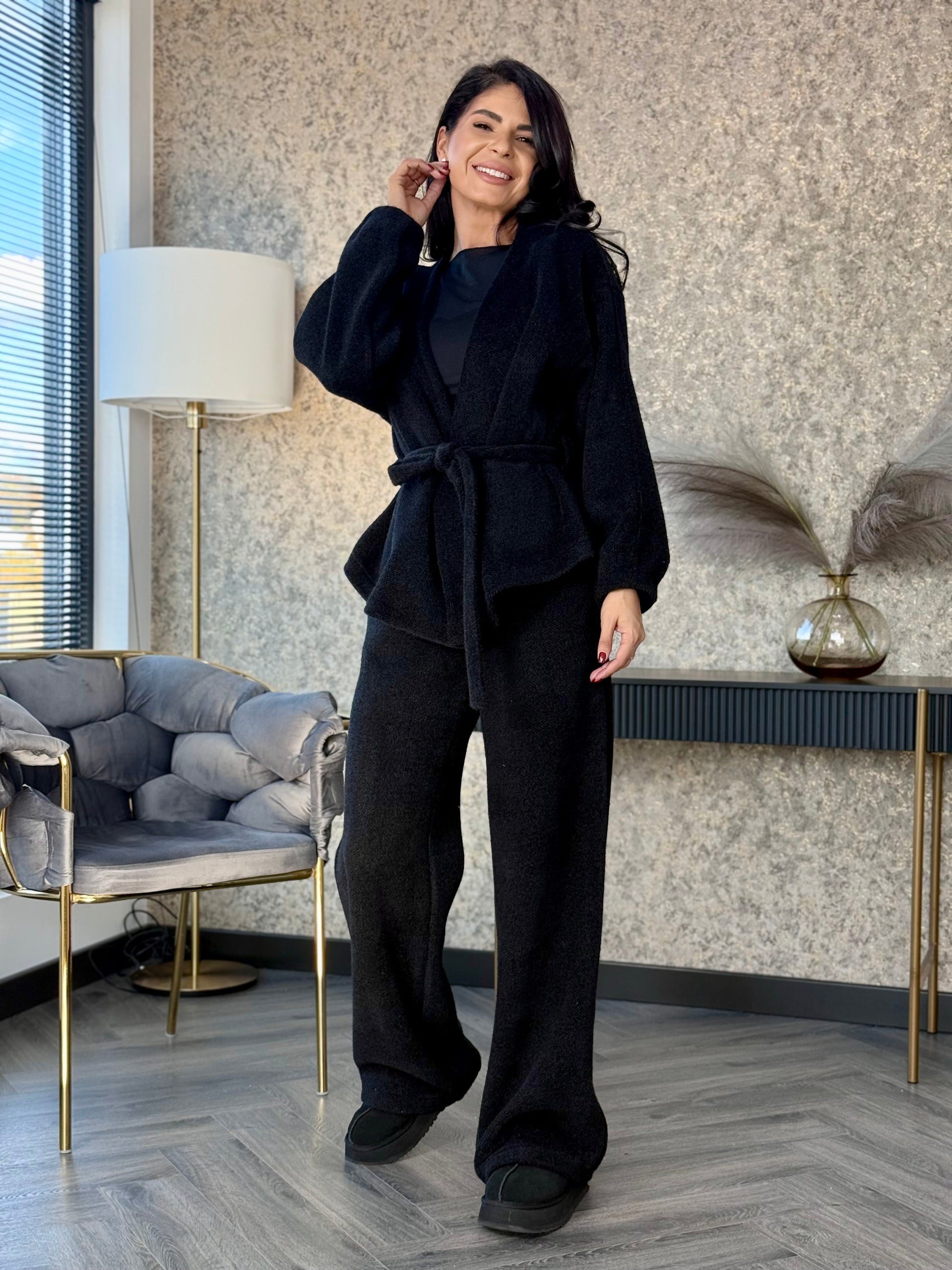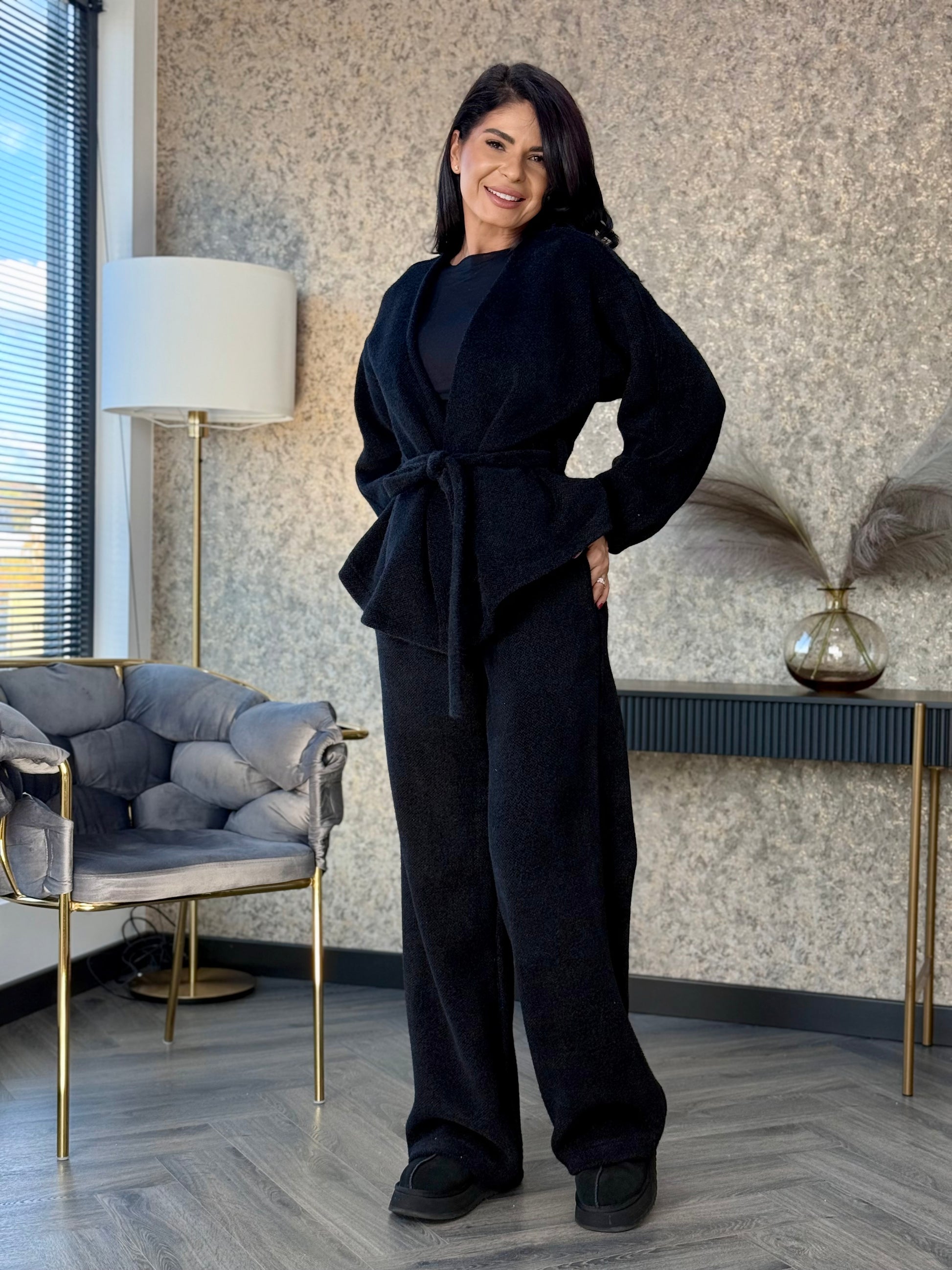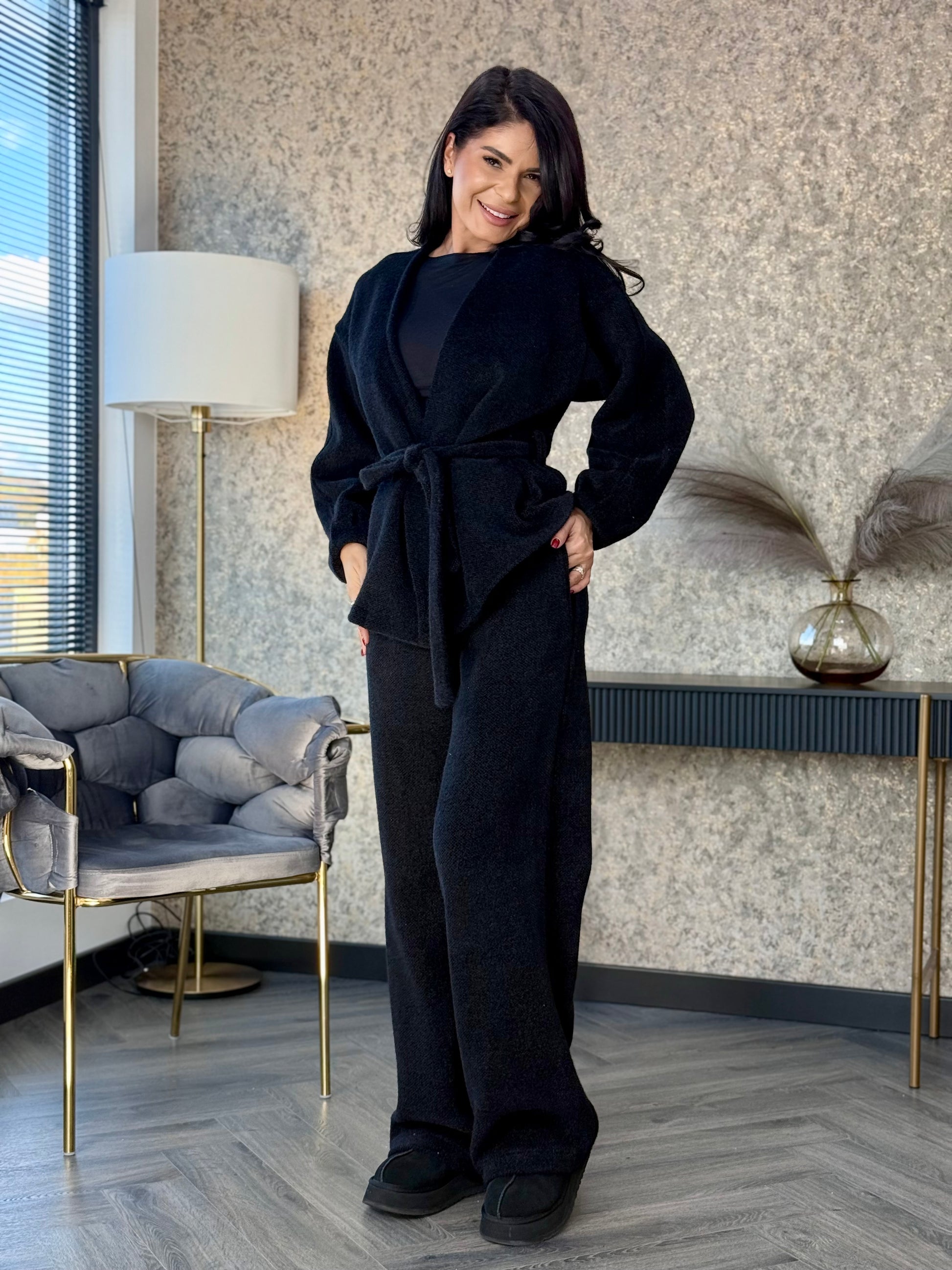 Un outfit cozy si rafinat, realizat dintr-o tesatura pufoasa, moale si placuta la atingere, ideala pentru sezonul rece. Bluza tip cardigan are croiala lejera si se prinde cu cordon in talie, oferind un aspect elegant si feminin. Pantalonii au talie inalta si elastica, iar croiul drept alungeste silueta. Perfect pentru momentele in care te simti relaxata, dar eleganta in acelasi timp.
