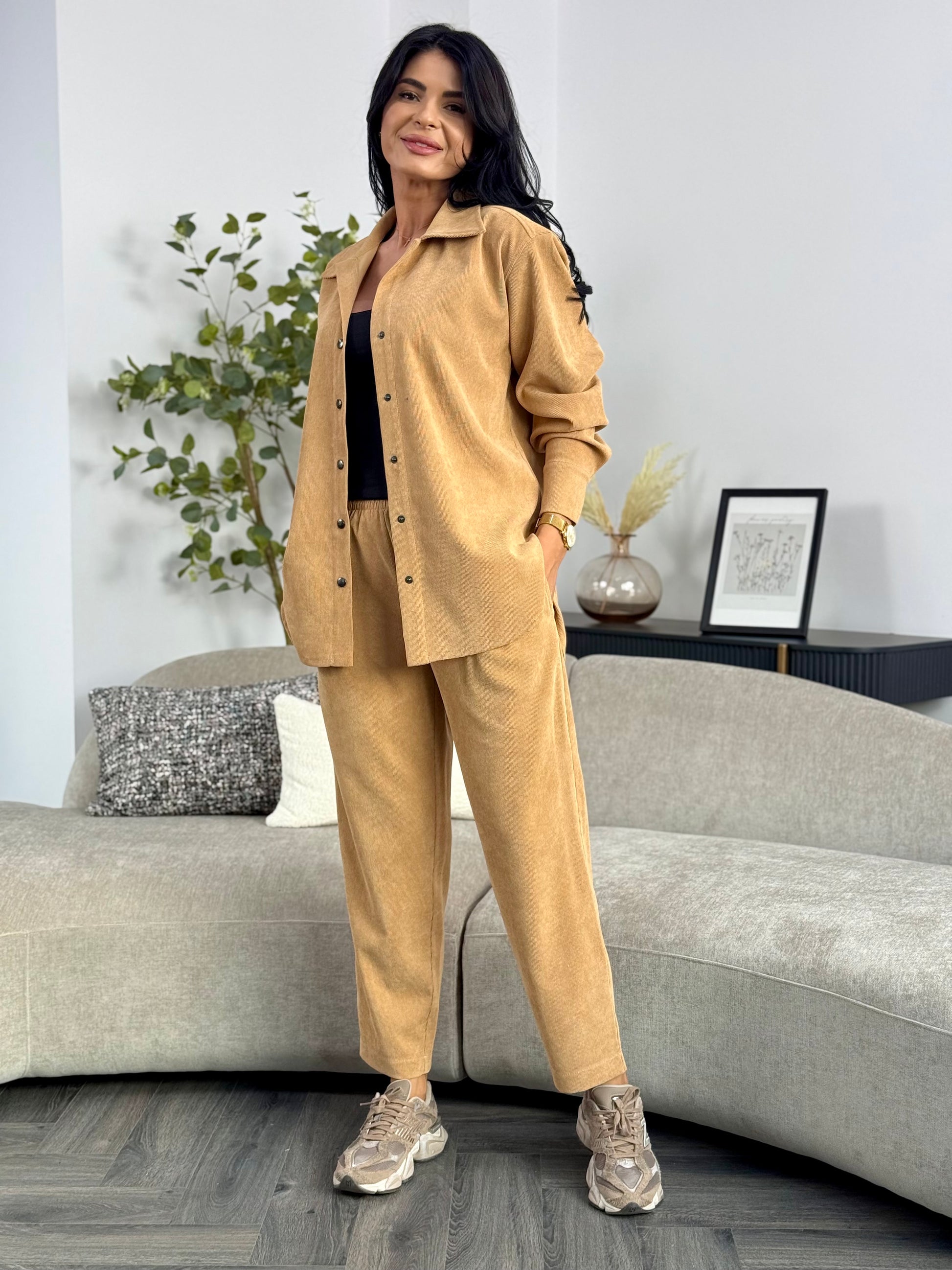 Pantalonii au talie medie, elastică și buzunare laterale, oferind lejeritate și libertate de mișcare, iar croiul drept avantajează silueta. Cămașa tip oversize, cu închidere frontală cu capse, completează setul, putând fi purtată atât deschisă, cât și închisă, pentru un look versatil.