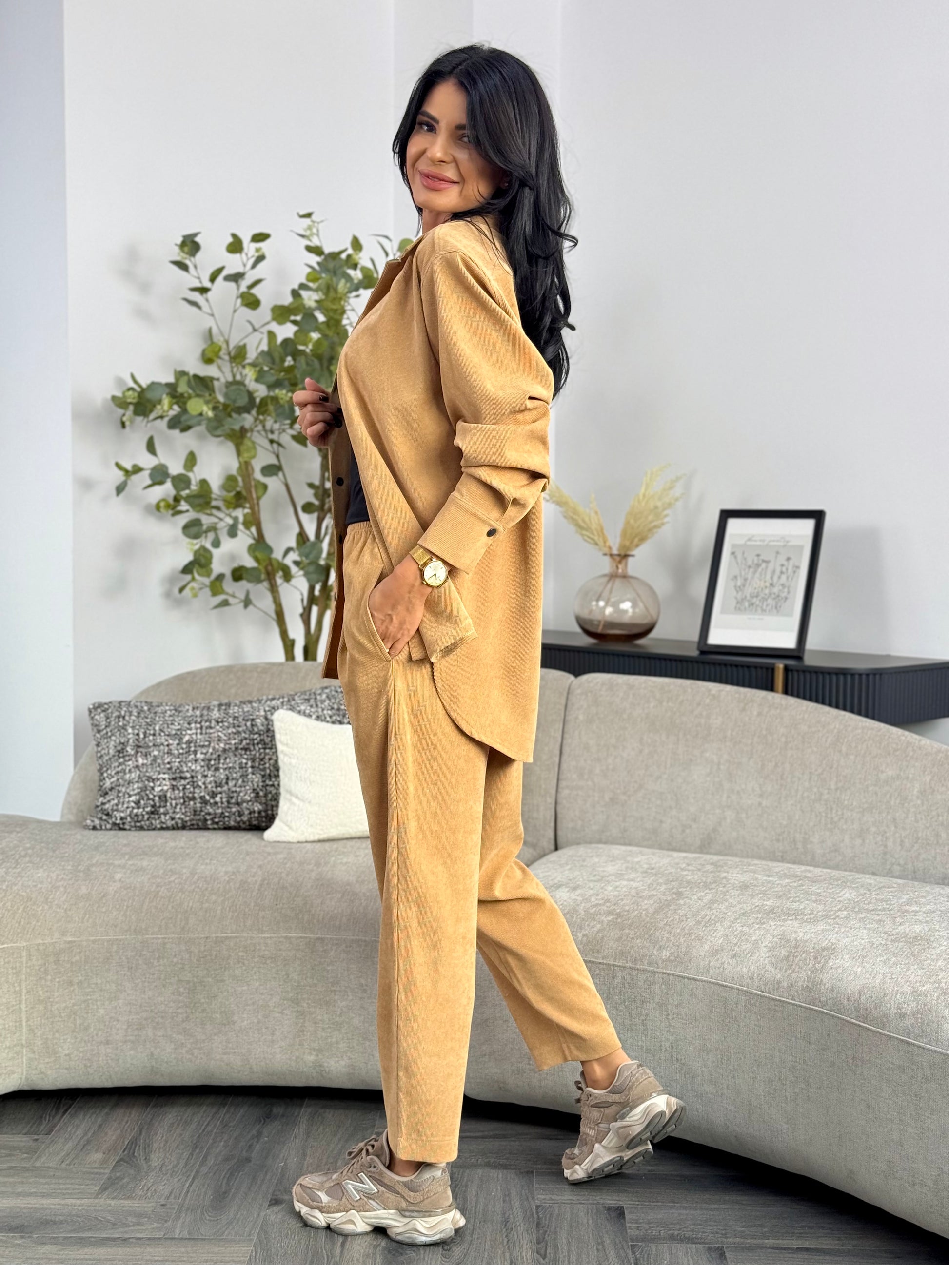 Un outfit lejer și modern, realizat dintr-un material plăcut la atingere, catifea velur, o croială relaxată ce îmbină confortul cu stilul.