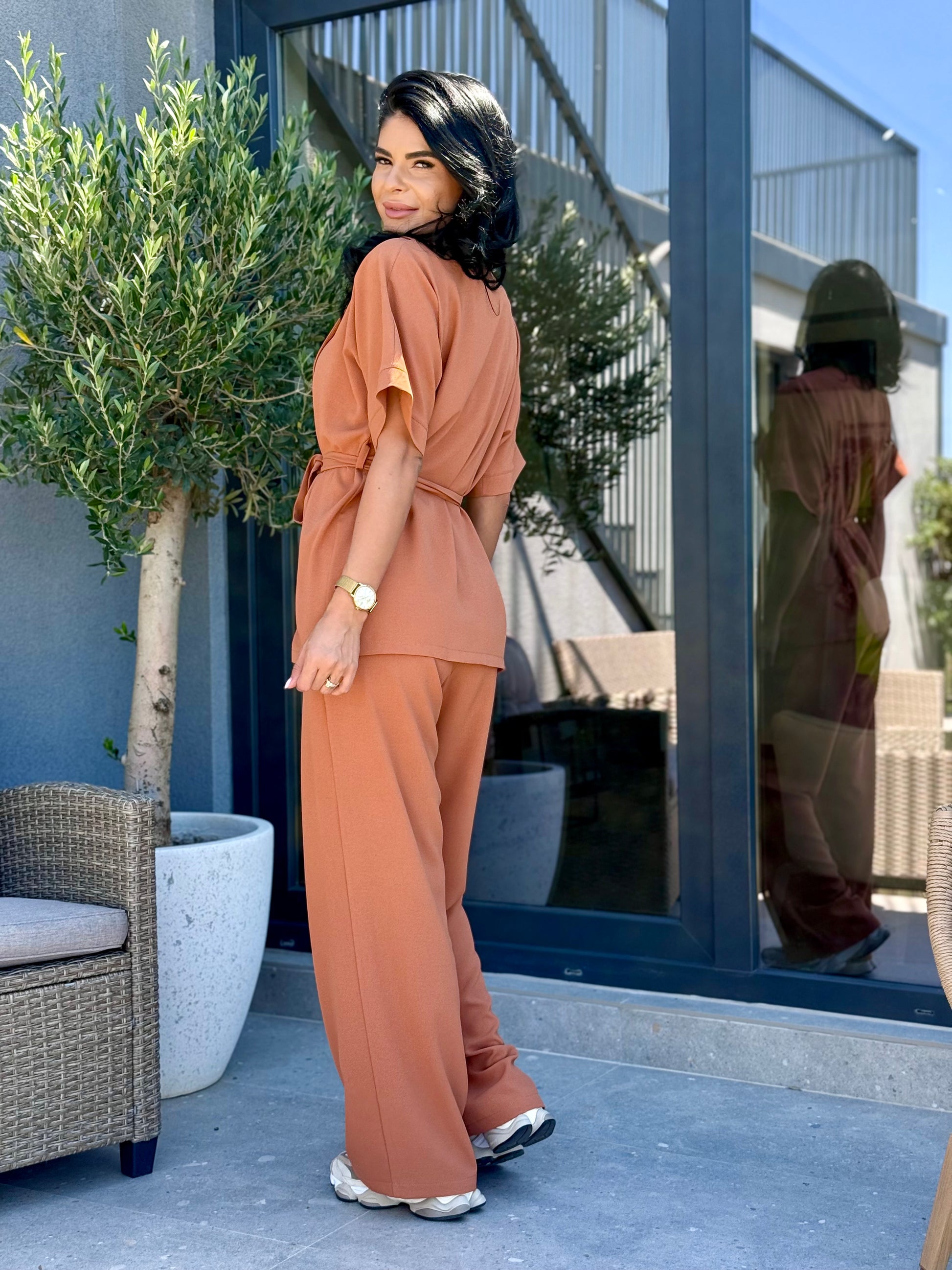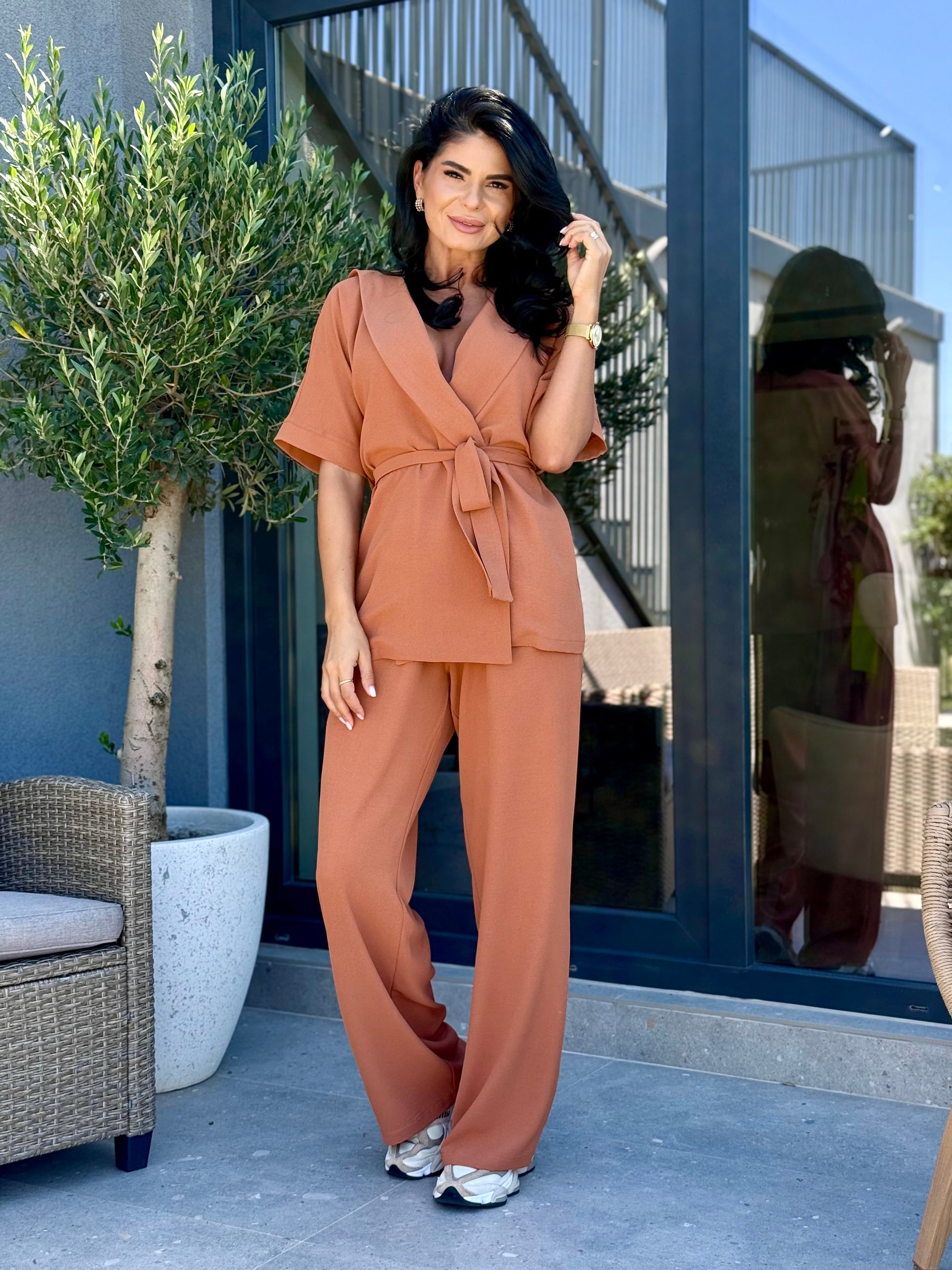 Set cu croi modern și versatil, format din bluză tip kimono cu mânecă scurtă, decolteu în V și cordon, completată de pantaloni cu croi drept și talie elastică. Materialul ușor texturat oferă confort și eleganță, fiind potrivit pentru zilele de toamnă datorită lejerității și versatilității sale. Poate fi purtat cu sneakers pentru un look casual sau cu încălțăminte elegantă pentru apariții rafinate.