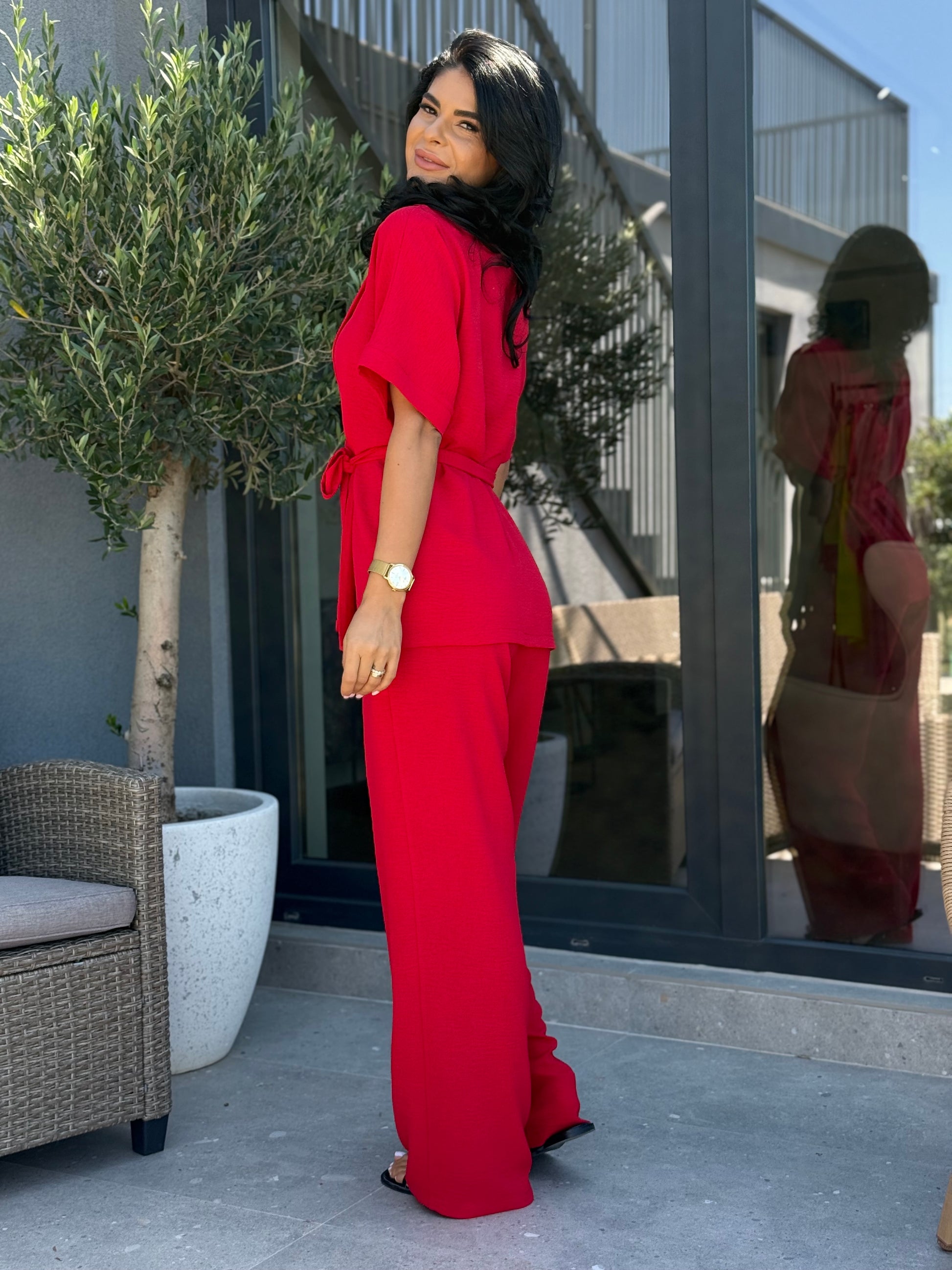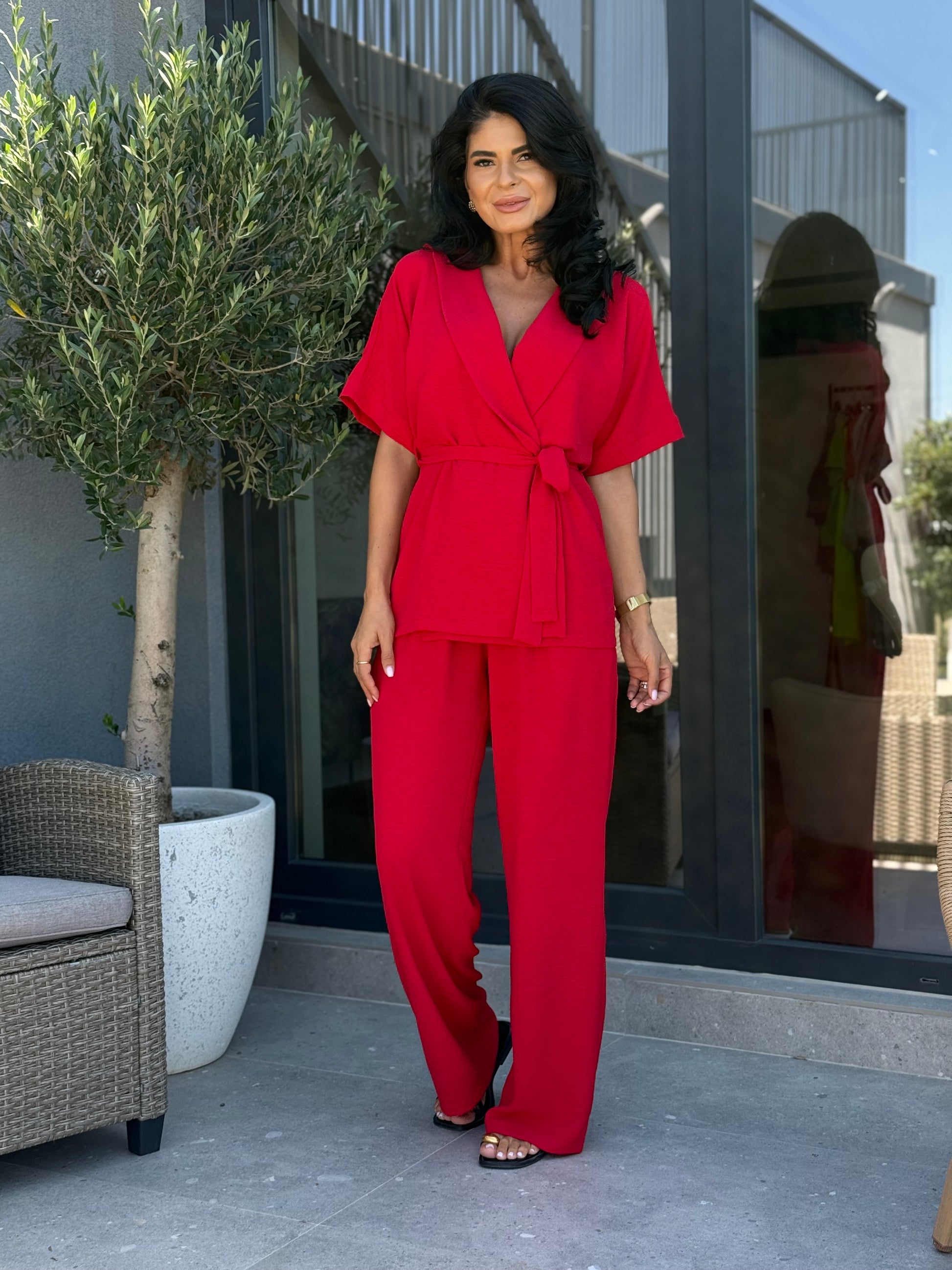 Set cu croi modern și versatil, format din bluză tip kimono cu mânecă scurtă, decolteu în V și cordon, completată de pantaloni cu croi drept și talie elastică. Materialul ușor texturat oferă confort și eleganță, fiind potrivit pentru zilele de toamnă datorită lejerității și versatilității sale. Poate fi purtat cu sneakers pentru un look casual sau cu încălțăminte elegantă pentru apariții rafinate.