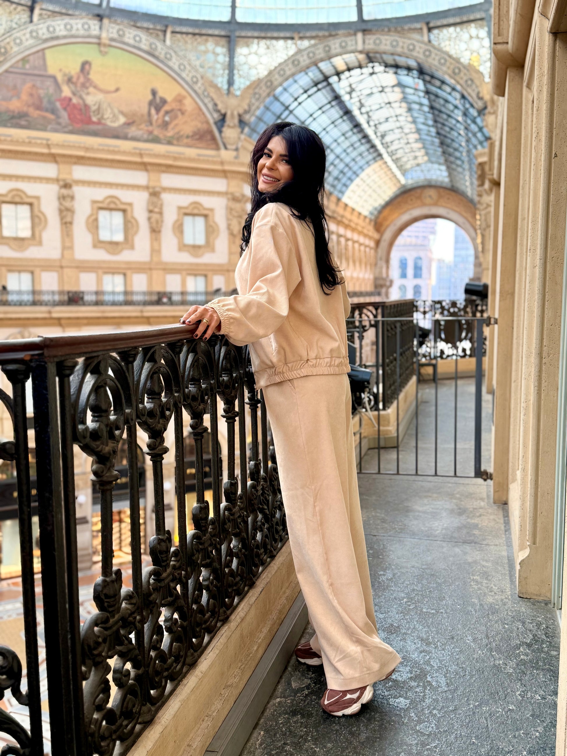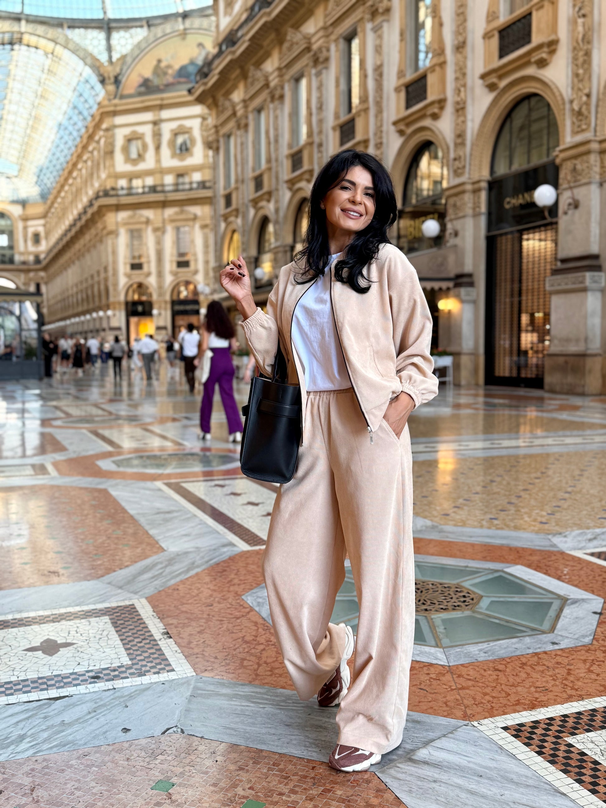 Un outfit modern și confortabil, realizat din catifea velur moale, cu un aspect elegant și plăcut la atingere. Sacoul tip bomber are croială lejeră, cu fermoar frontal și buzunare laterale practice, fiind o piesă versatilă pentru ținute casual-chic. Pantalonii au talie elastică, croi amplu și lejer, ce oferă libertate de mișcare și alungesc silueta.