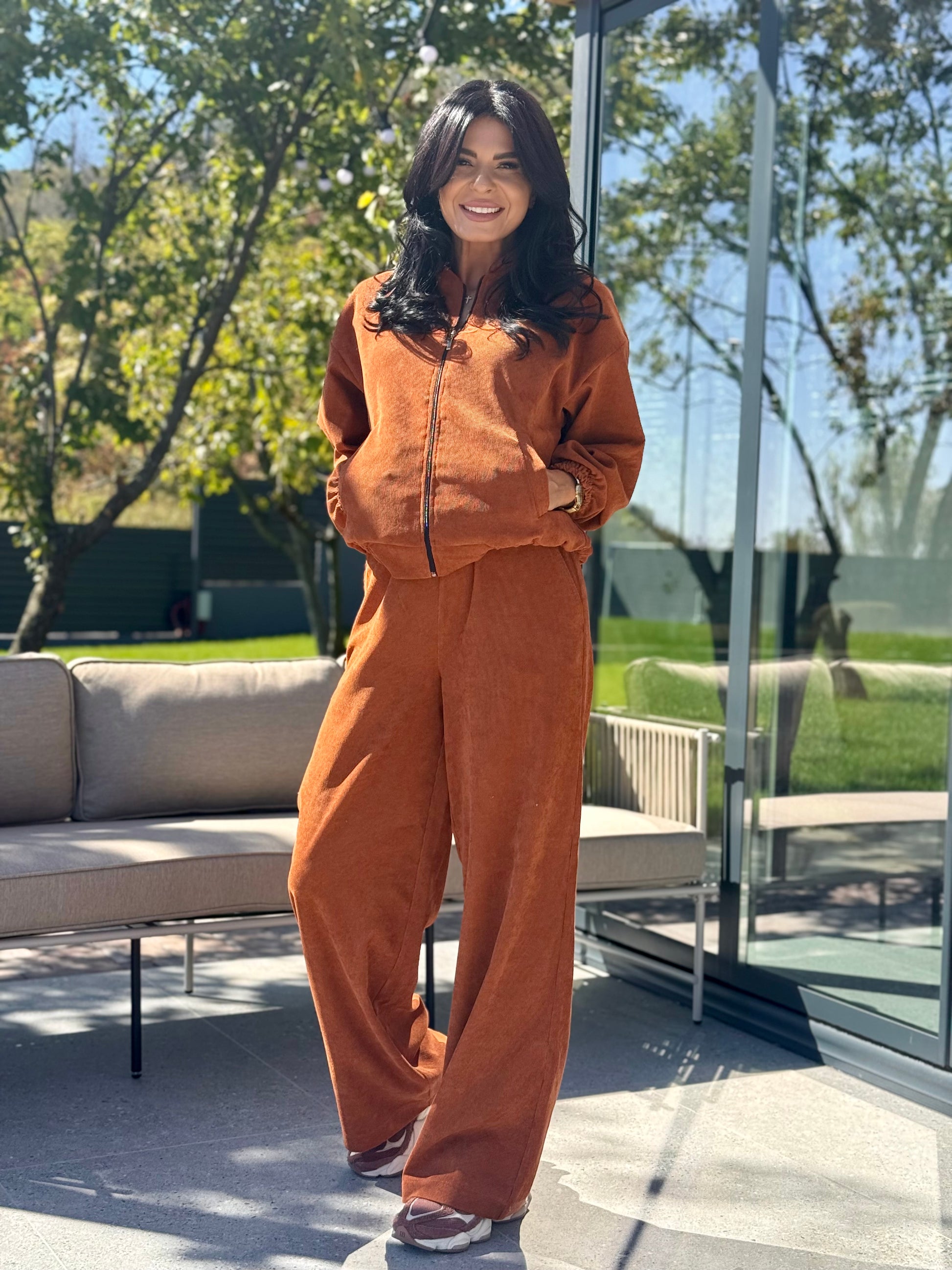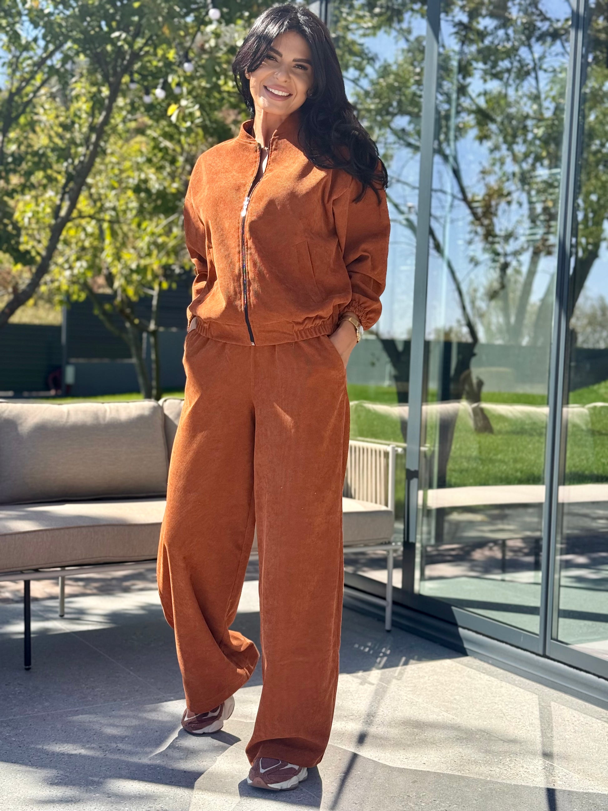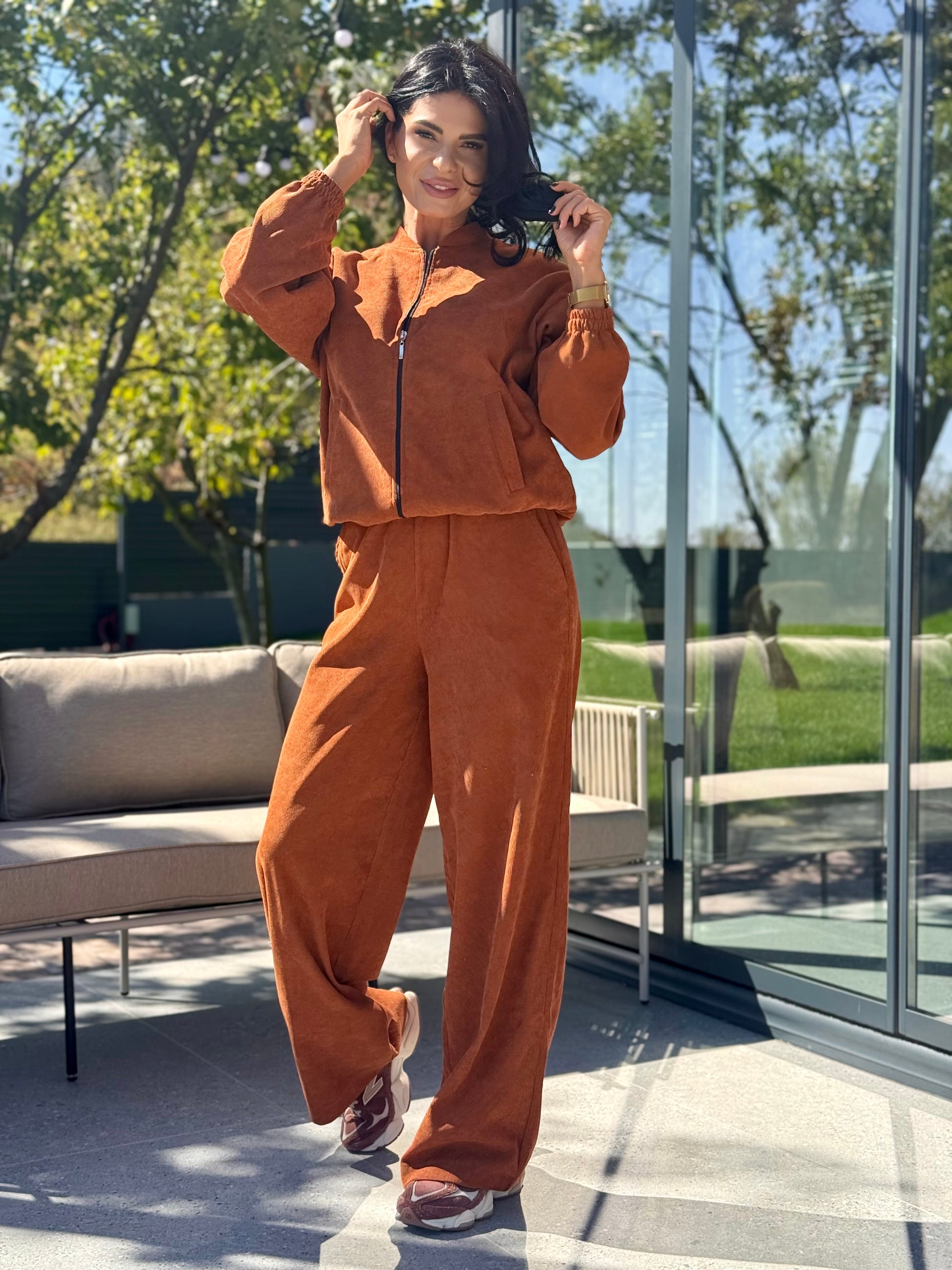 Un outfit modern și confortabil, realizat din catifea velur moale, cu un aspect elegant și plăcut la atingere. Sacoul tip bomber are croială lejeră, cu fermoar frontal și buzunare laterale practice, fiind o piesă versatilă pentru ținute casual-chic. Pantalonii au talie elastică, croi amplu și lejer, ce oferă libertate de mișcare și alungesc silueta.