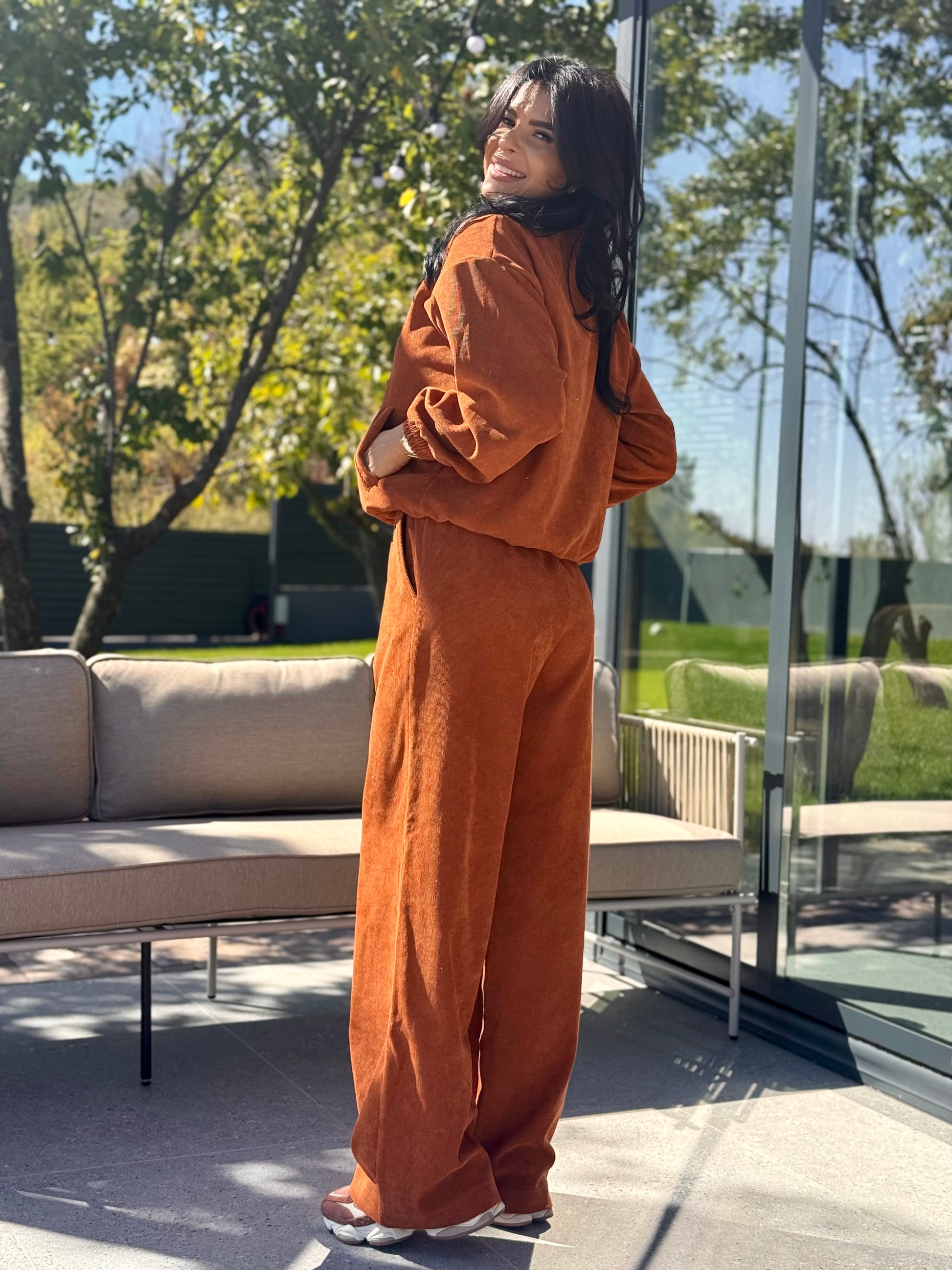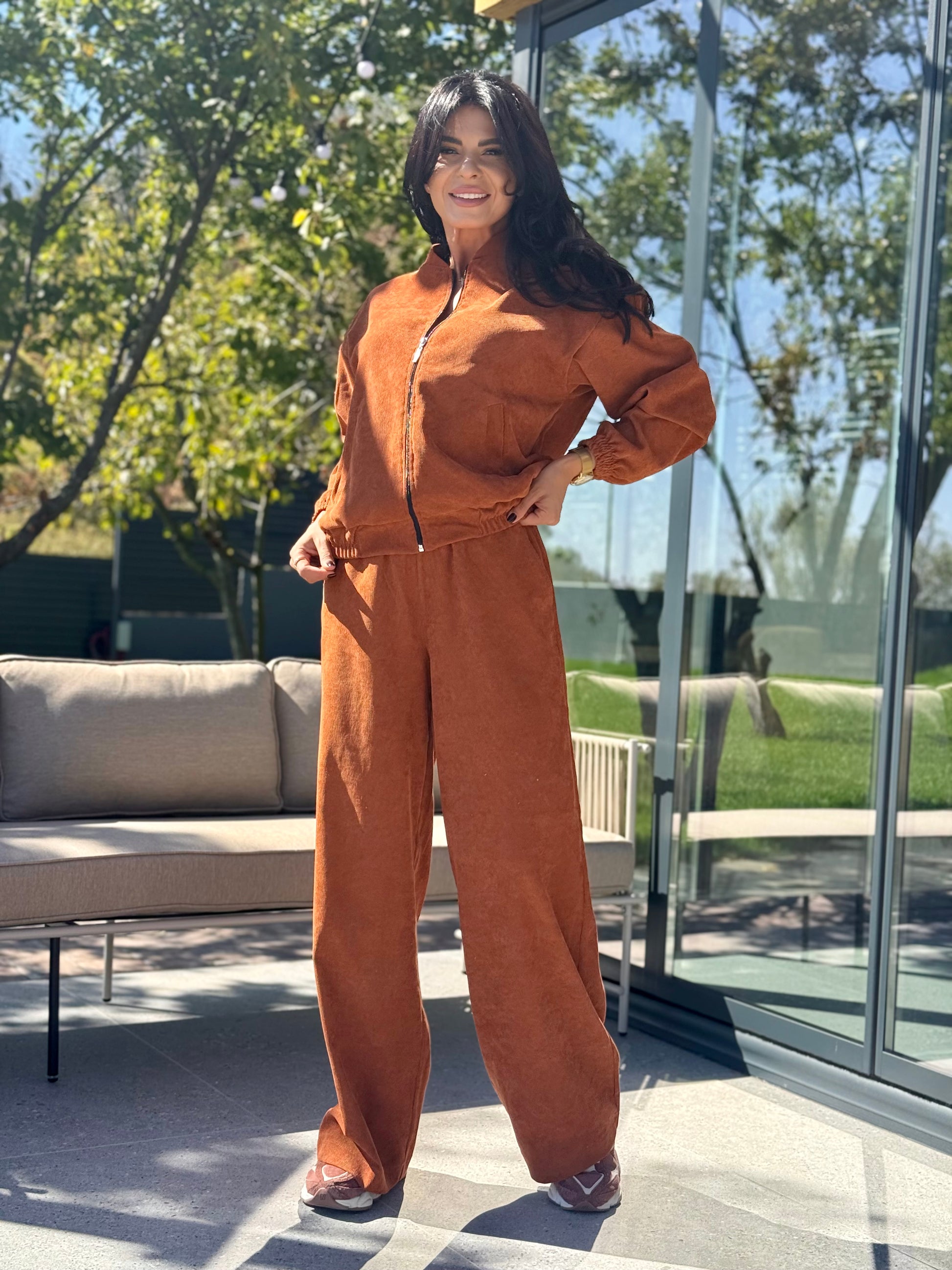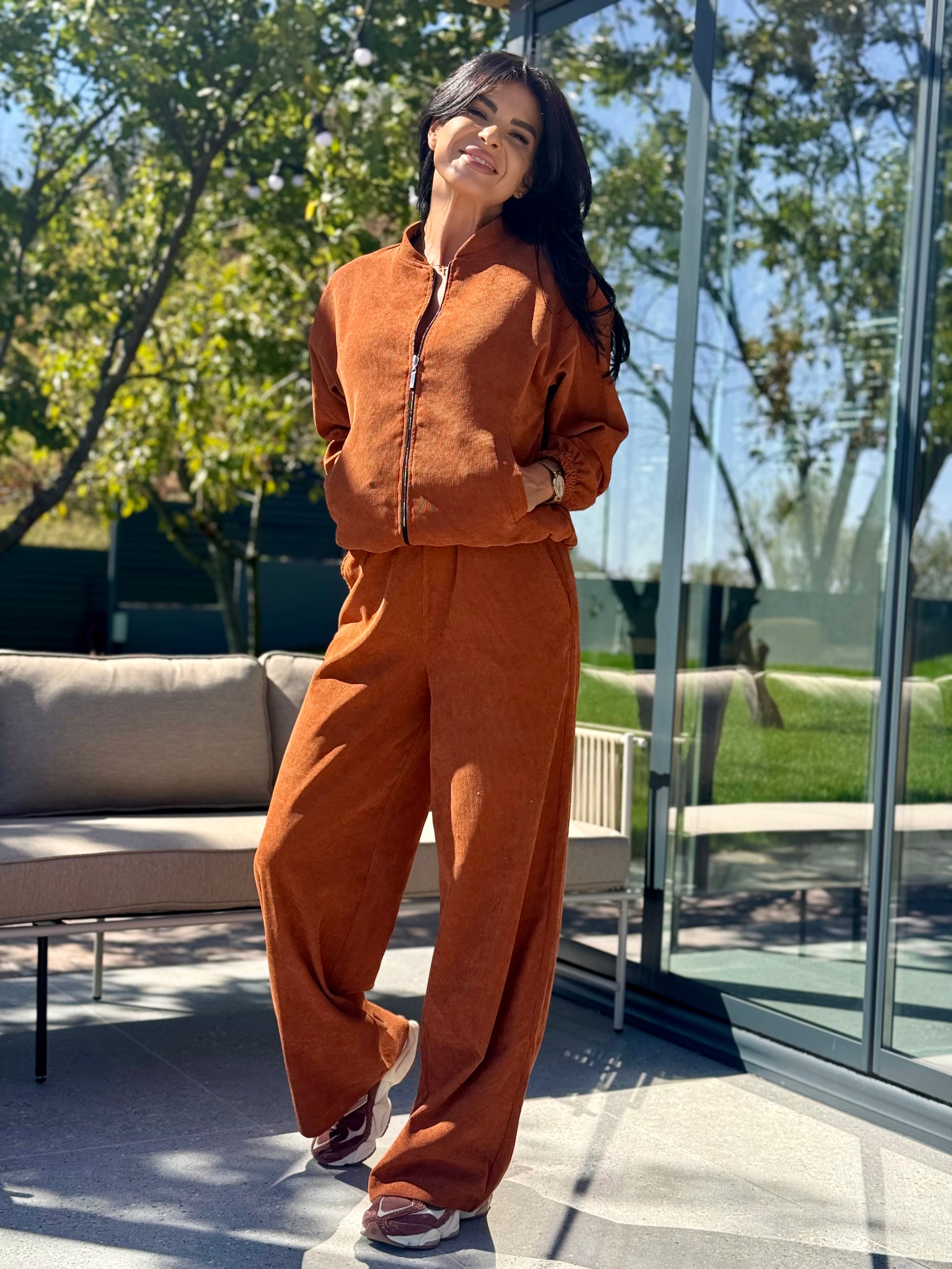 Un outfit modern și confortabil, realizat din catifea velur moale, cu un aspect elegant și plăcut la atingere. Sacoul tip bomber are croială lejeră, cu fermoar frontal și buzunare laterale practice, fiind o piesă versatilă pentru ținute casual-chic. Pantalonii au talie elastică, croi amplu și lejer, ce oferă libertate de mișcare și alungesc silueta.