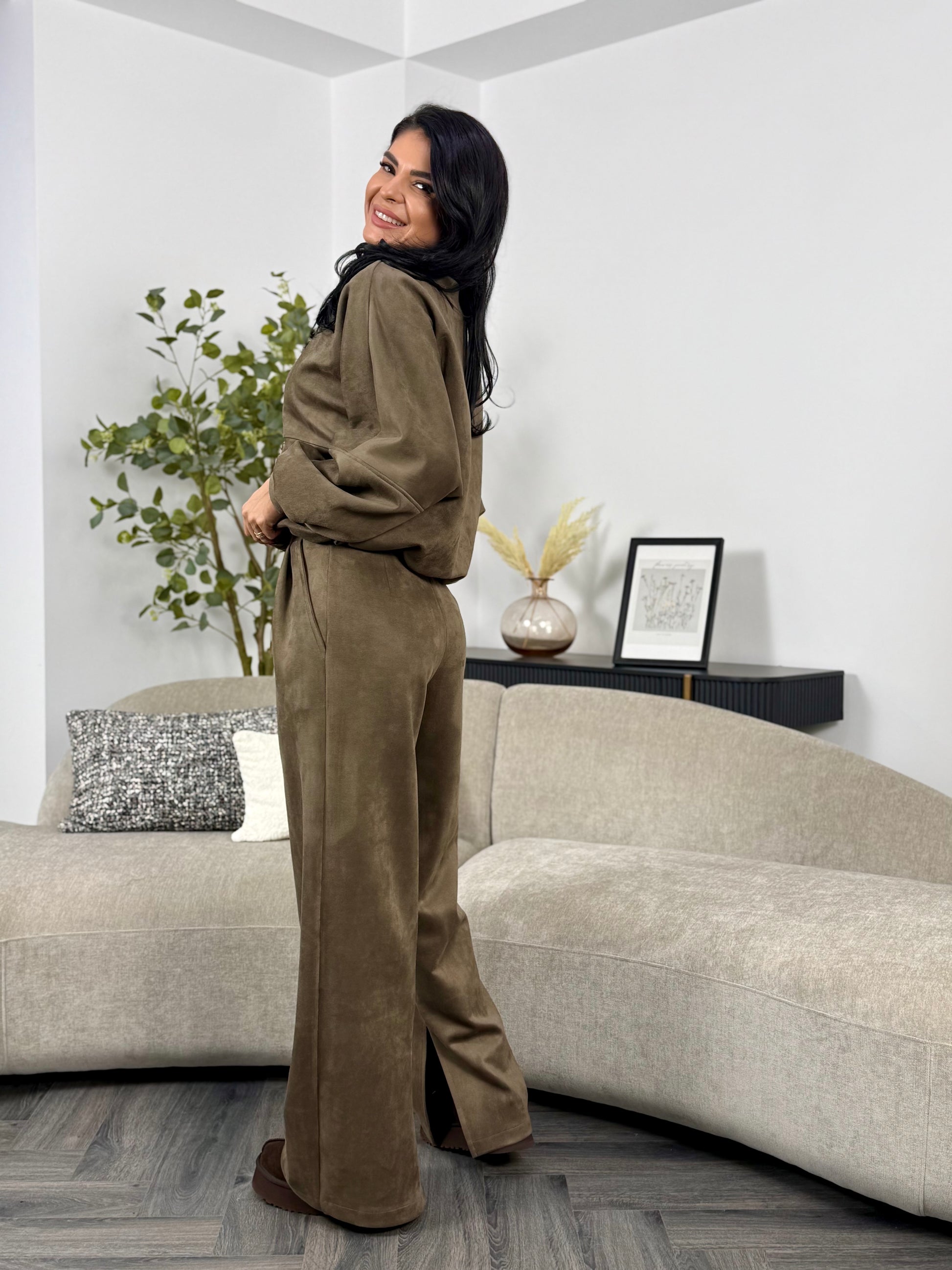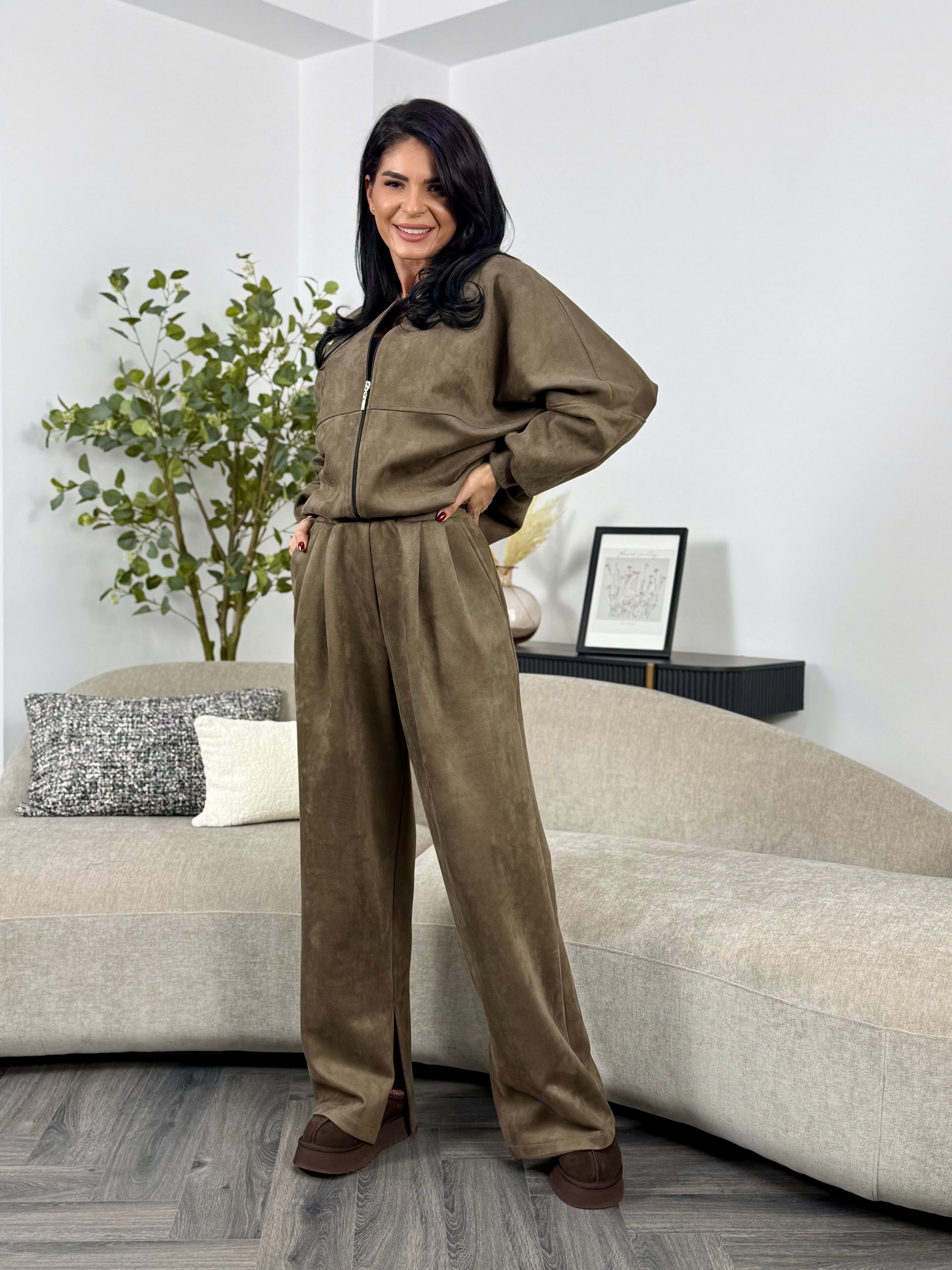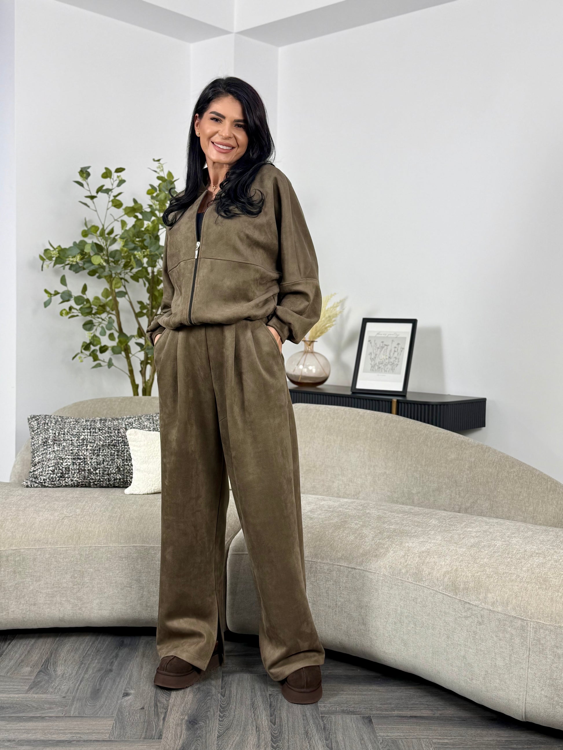 Un outfit modern si rafinat, realizat dintr-un material moale, de tip imitatie piele intoarsa, cu textura catifelata si placuta la atingere. Bluza are croiala lejera, cu fermoar frontal si detalii care adauga un aer practic. Pantalonii au talie medie/inalta , elastica, pense in zona spatelui, croi lejer.