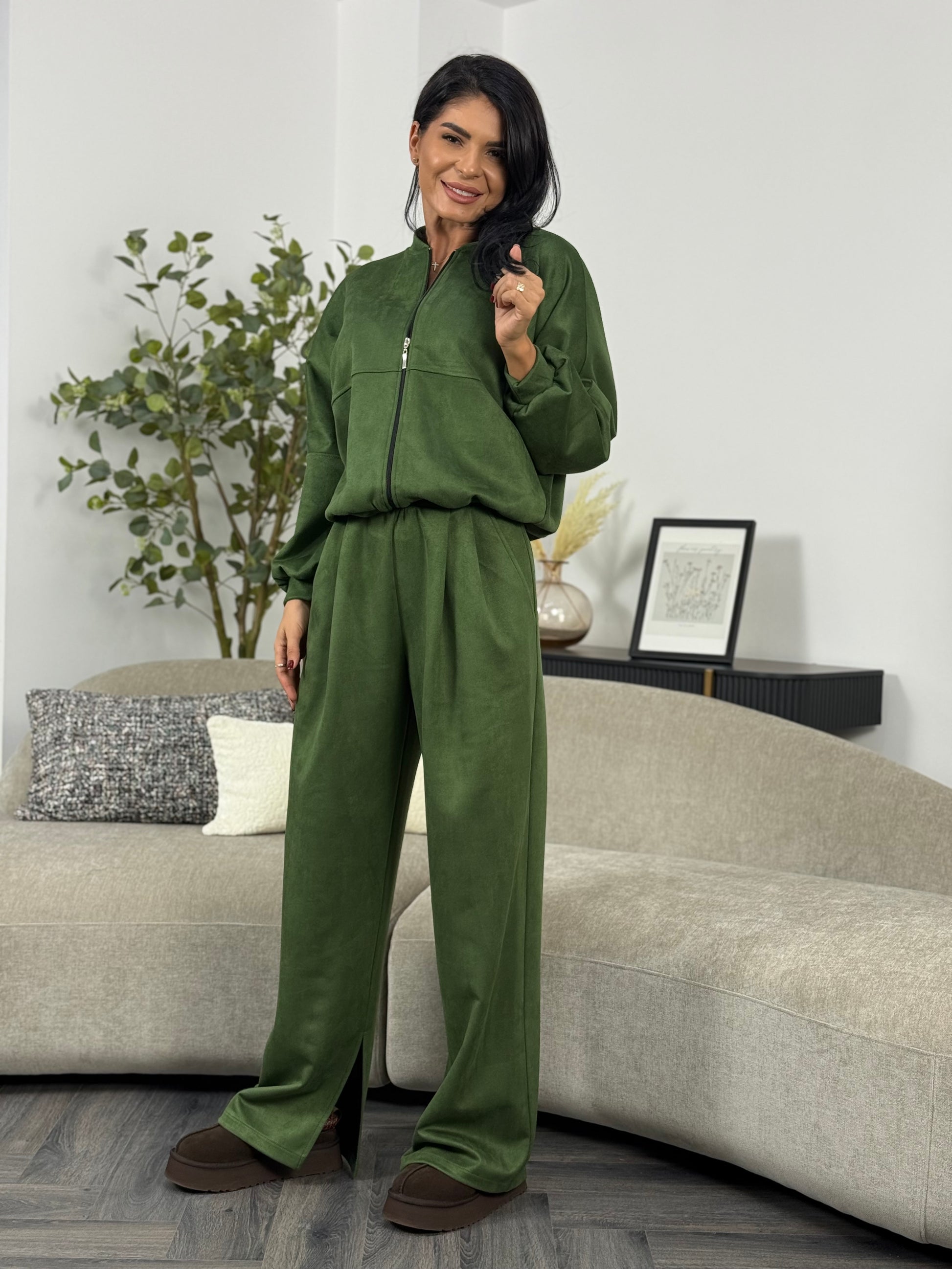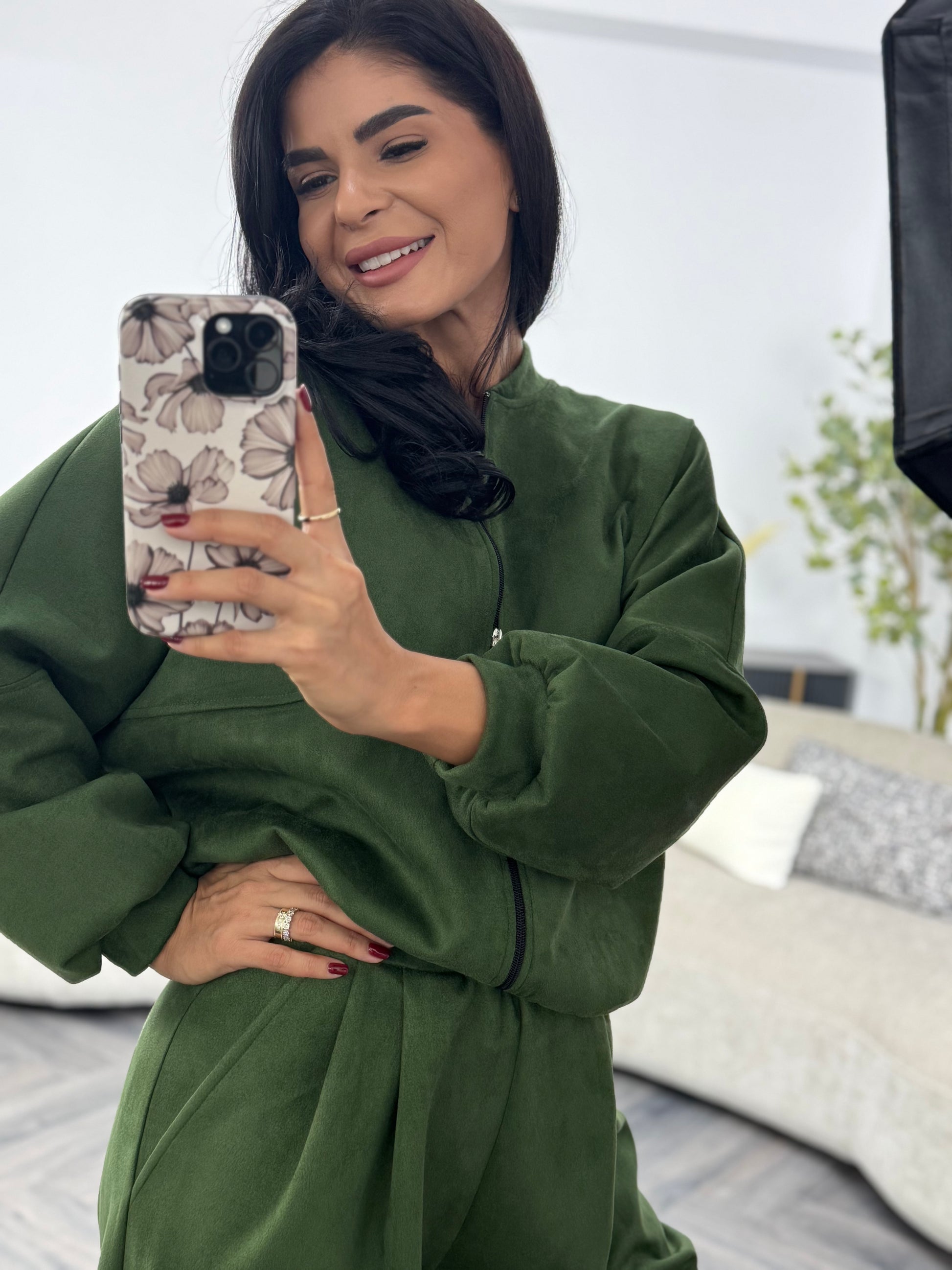 Un outfit modern si rafinat, realizat dintr-un material moale, de tip imitatie piele intoarsa, cu textura catifelata si placuta la atingere. Bluza are croiala lejera, cu fermoar frontal si detalii care adauga un aer practic. Pantalonii au talie medie/inalta , elastica, pense in zona spatelui, croi lejer.