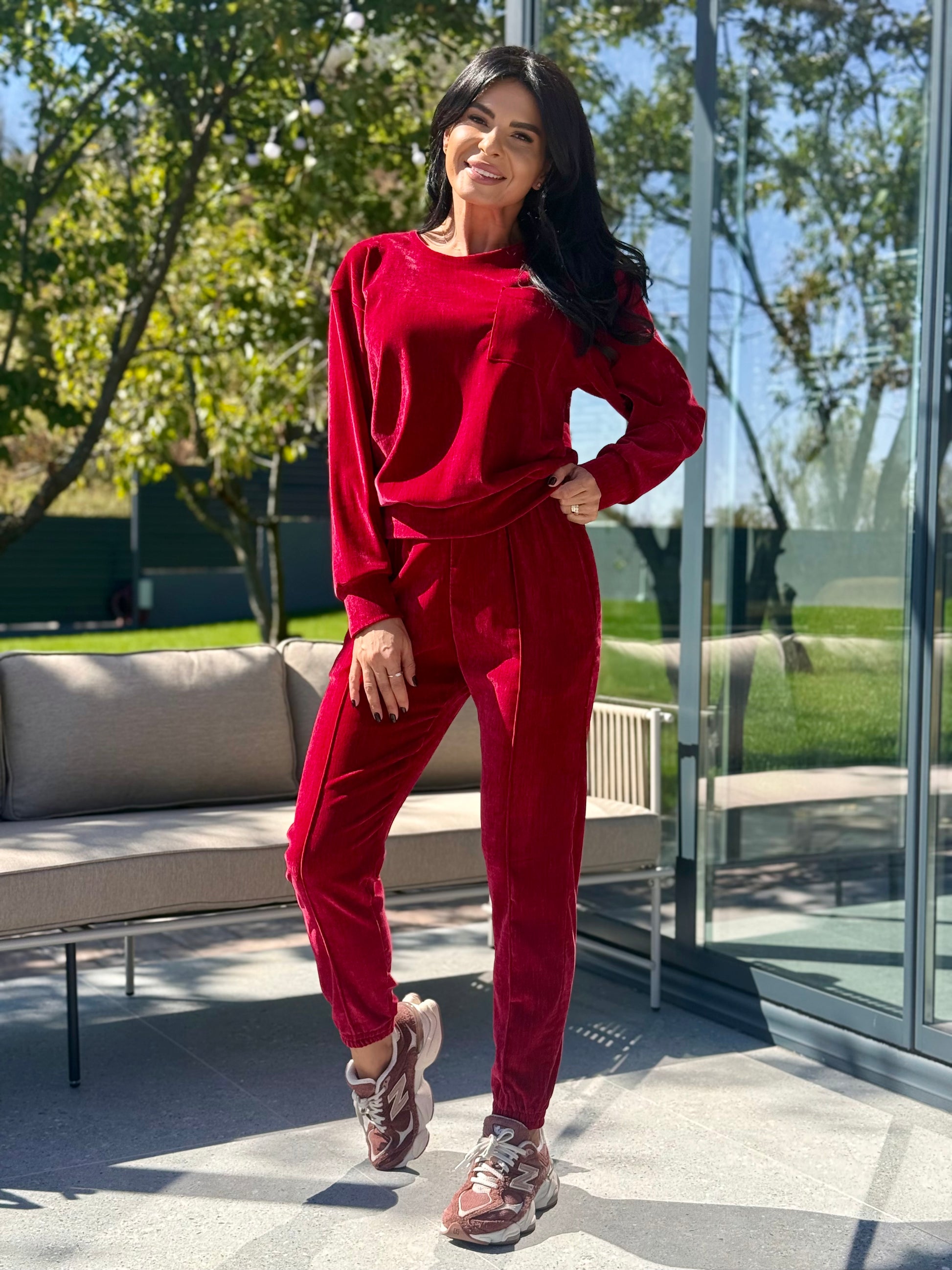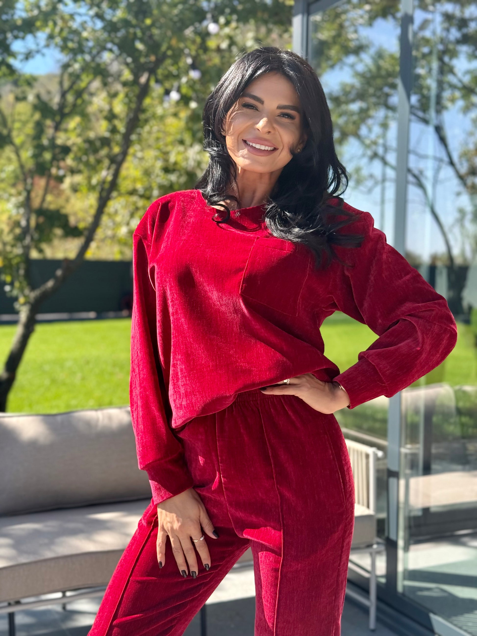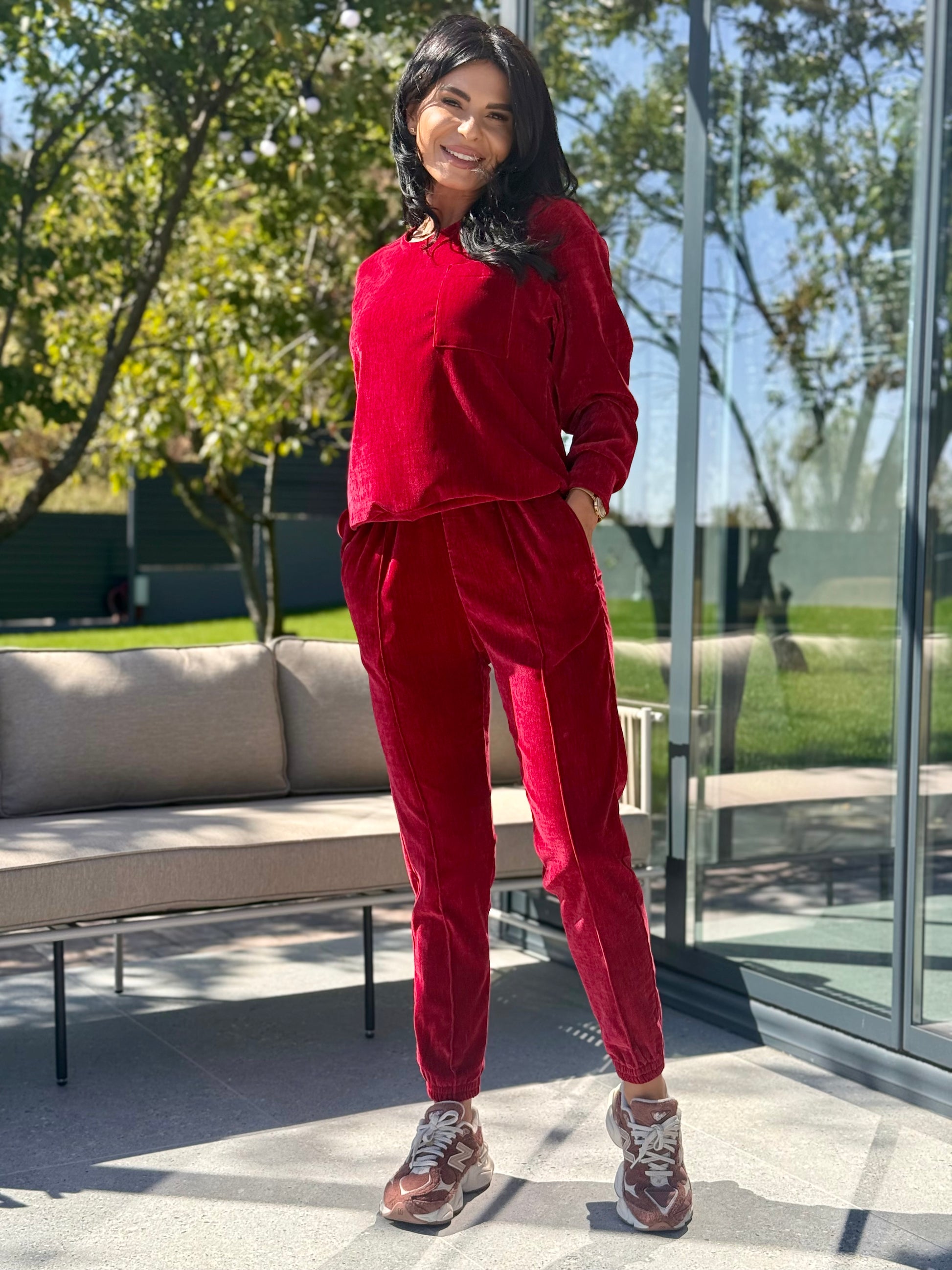 Un outfit modern și confortabil, realizat din catifea cu reflexii, cu textură moale și plăcută la atingere. Bluza are croială lejeră, cu mâneci lungi și manșete late, oferind libertate de mișcare și un aspect relaxat. Pantalonii au talie elastică, buzunare laterale și croi conic cu terminație elastică, detalii ce alungesc silueta și adaugă versatilitate.