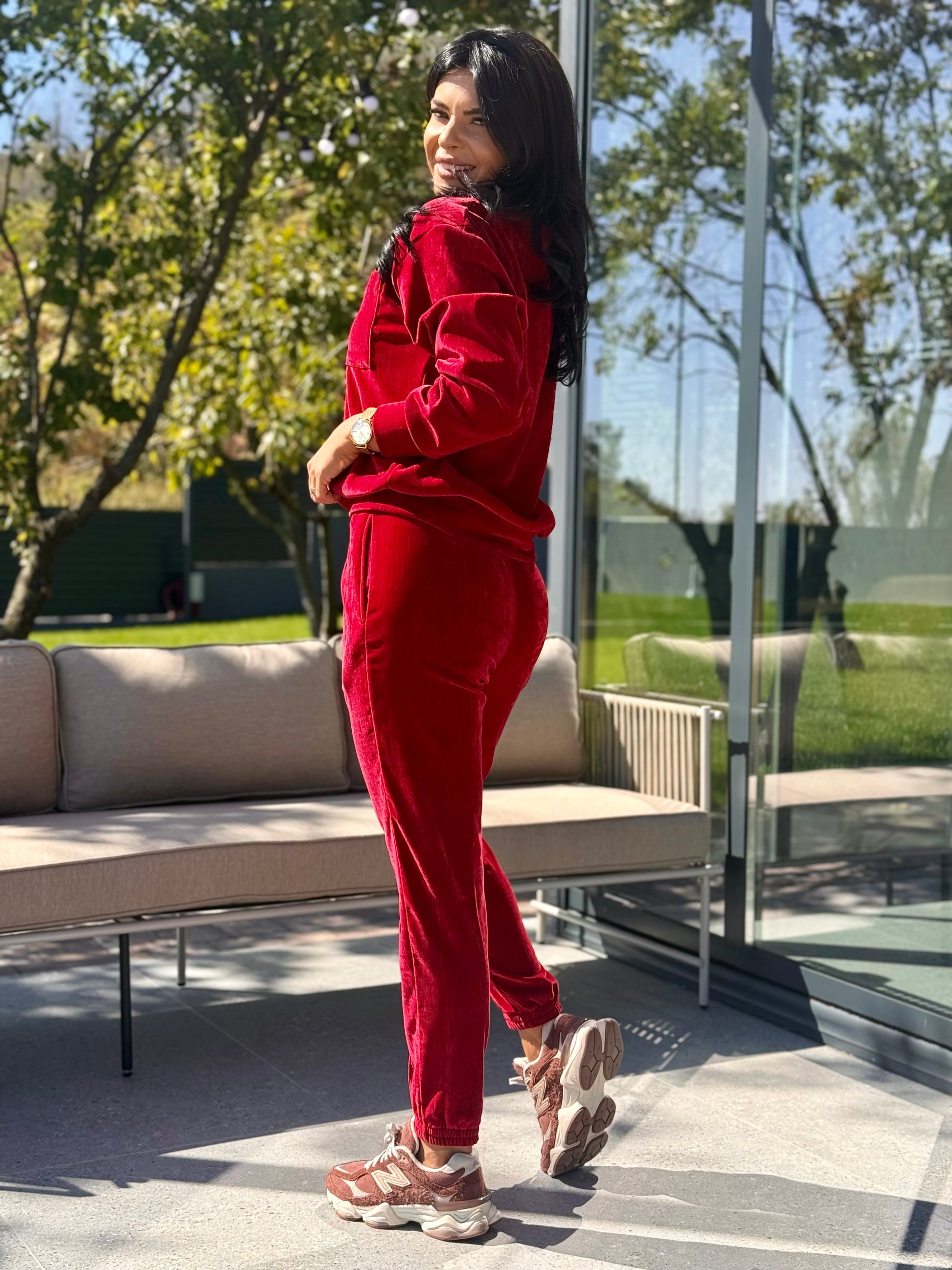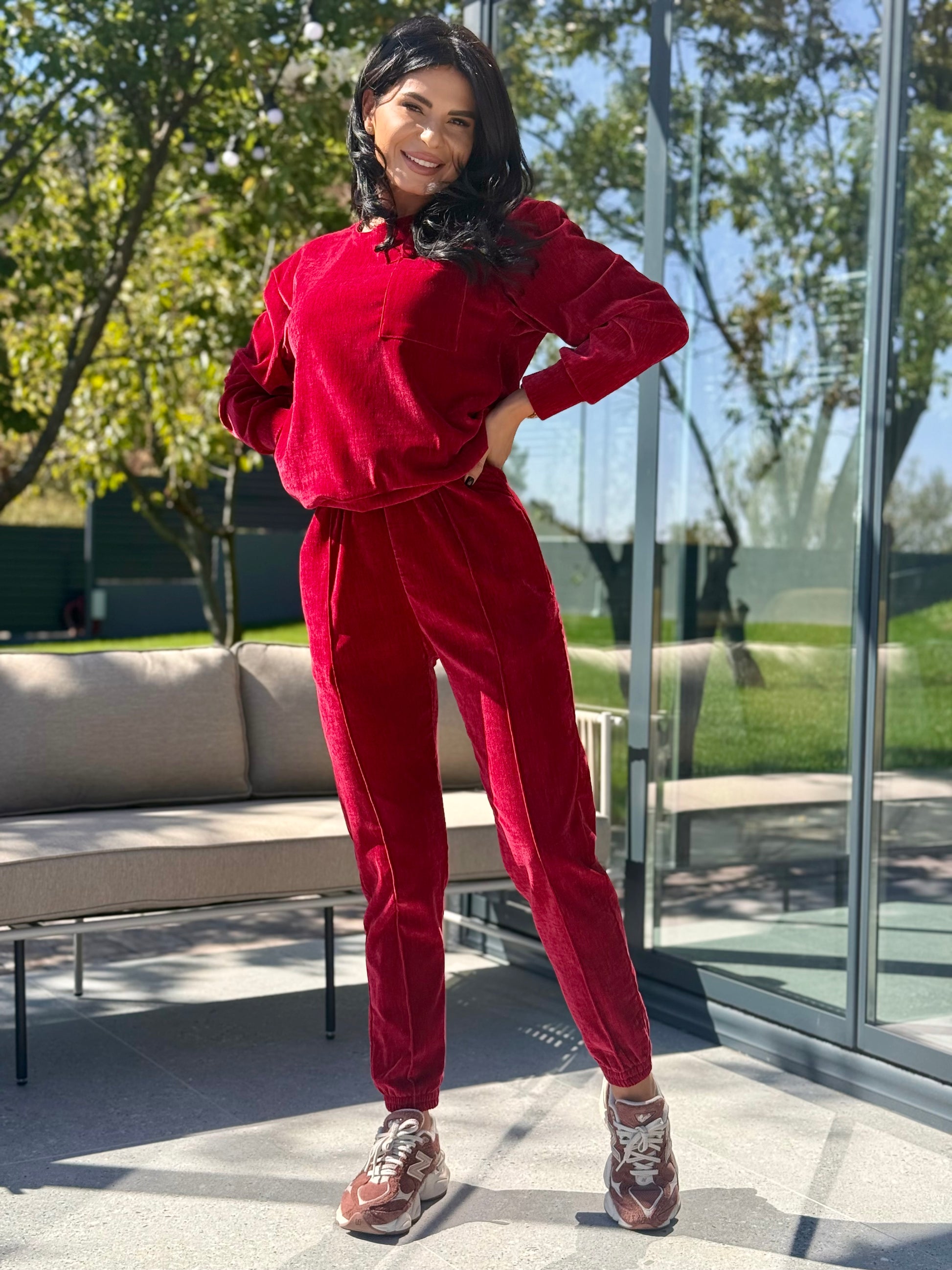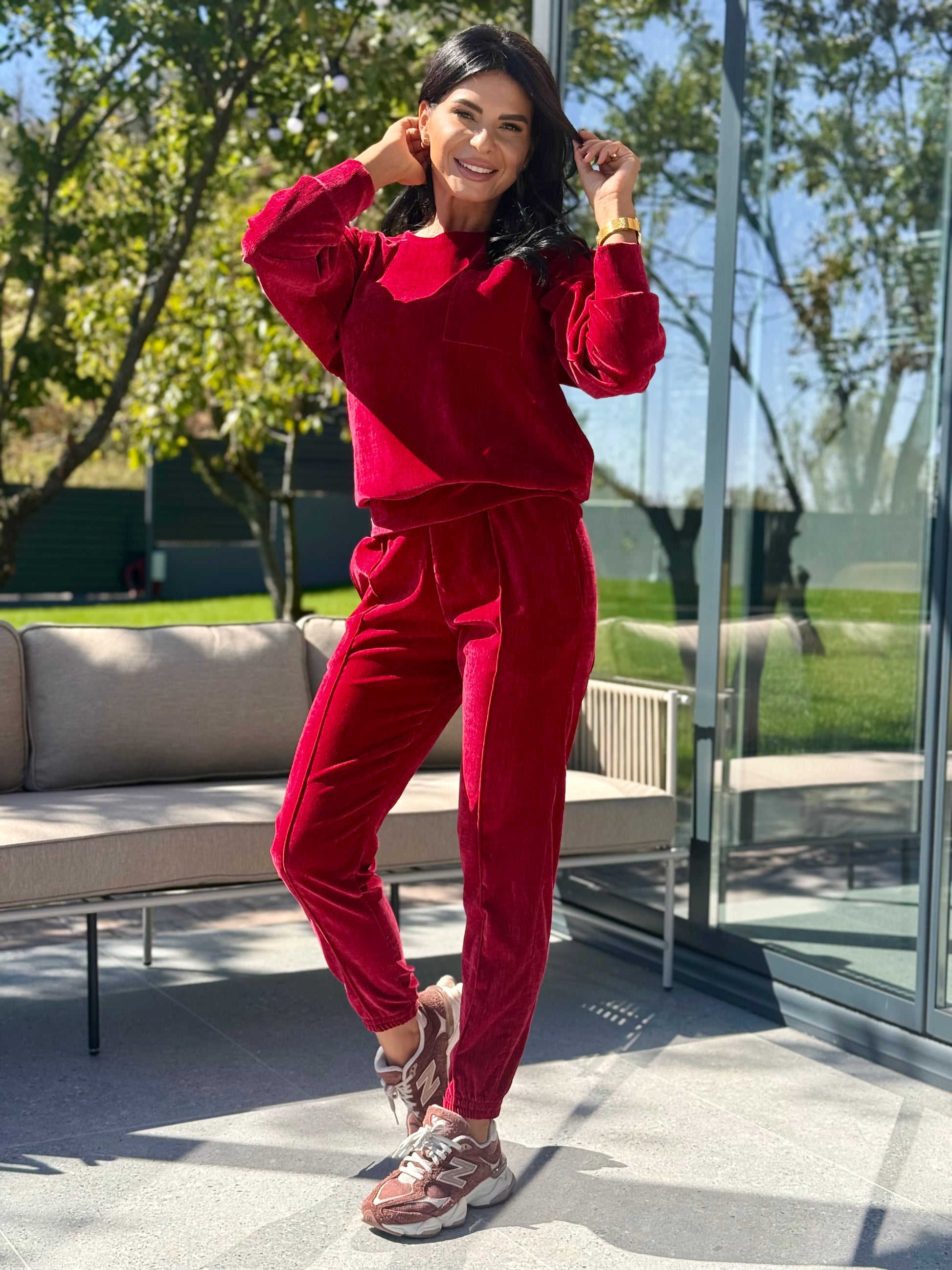 Un outfit modern și confortabil, realizat din catifea cu reflexii, cu textură moale și plăcută la atingere. Bluza are croială lejeră, cu mâneci lungi și manșete late, oferind libertate de mișcare și un aspect relaxat. Pantalonii au talie elastică, buzunare laterale și croi conic cu terminație elastică, detalii ce alungesc silueta și adaugă versatilitate.