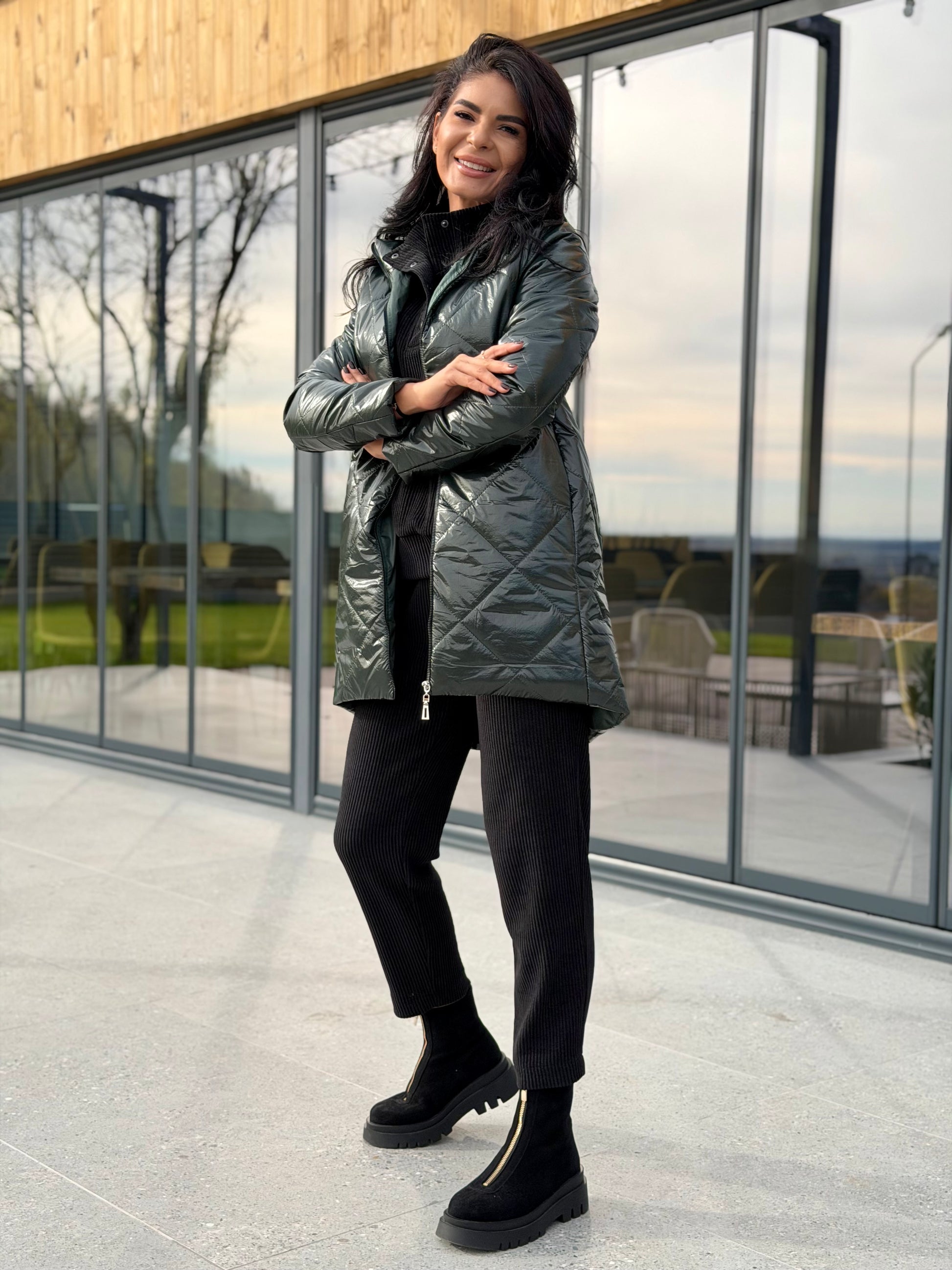Aceasta geaca moderna imbina perfect confortul si stilul urban. Croiala usor cambrata avantajeaza silueta, iar buzunarele laterale adauga un plus de practicitate. Este prevazuta cu captuseala integrala, ideala pentru zilele reci. Fermoar 80 cm, guler inalt.